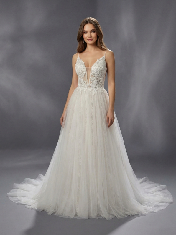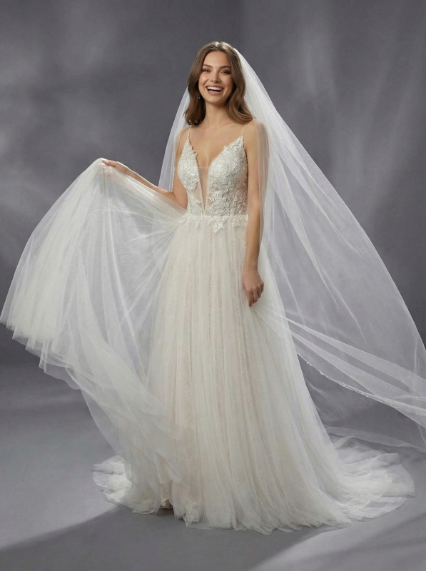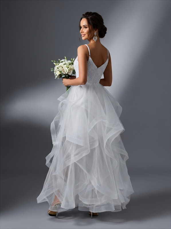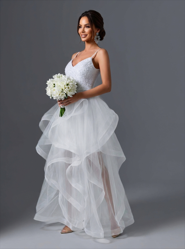0 руб.Свадебное платье с воздушной, многослойной юбкой и облегающим корсетным лифом на тонких бретелях