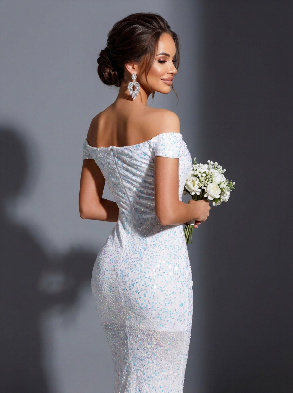 0 руб.Блестящее свадебное платье с открытым верхом и болеро из сетки