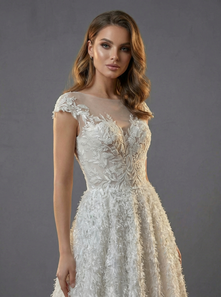 Пышное свадебное платье А-силуэта со съемными спущенными рукавами