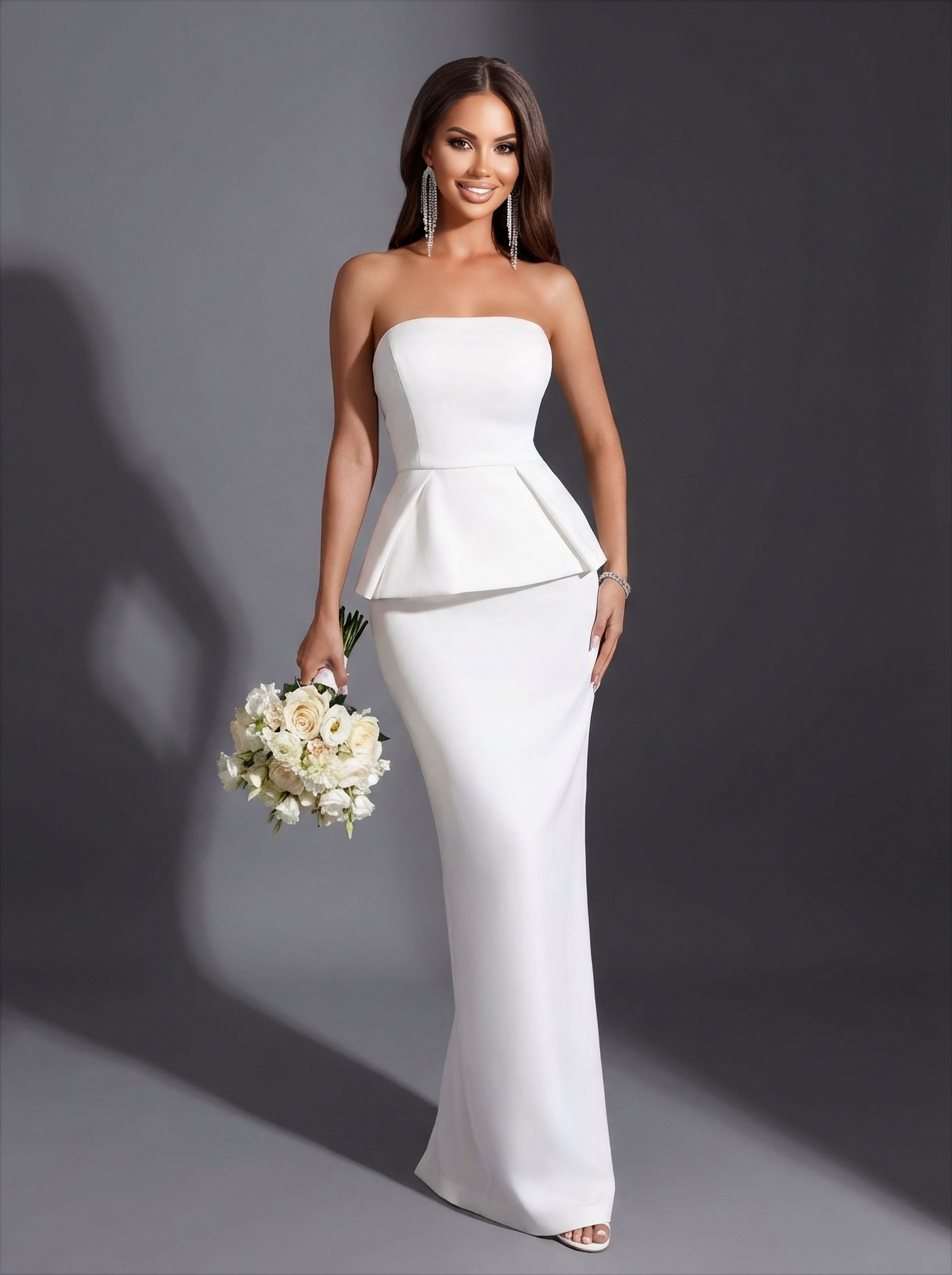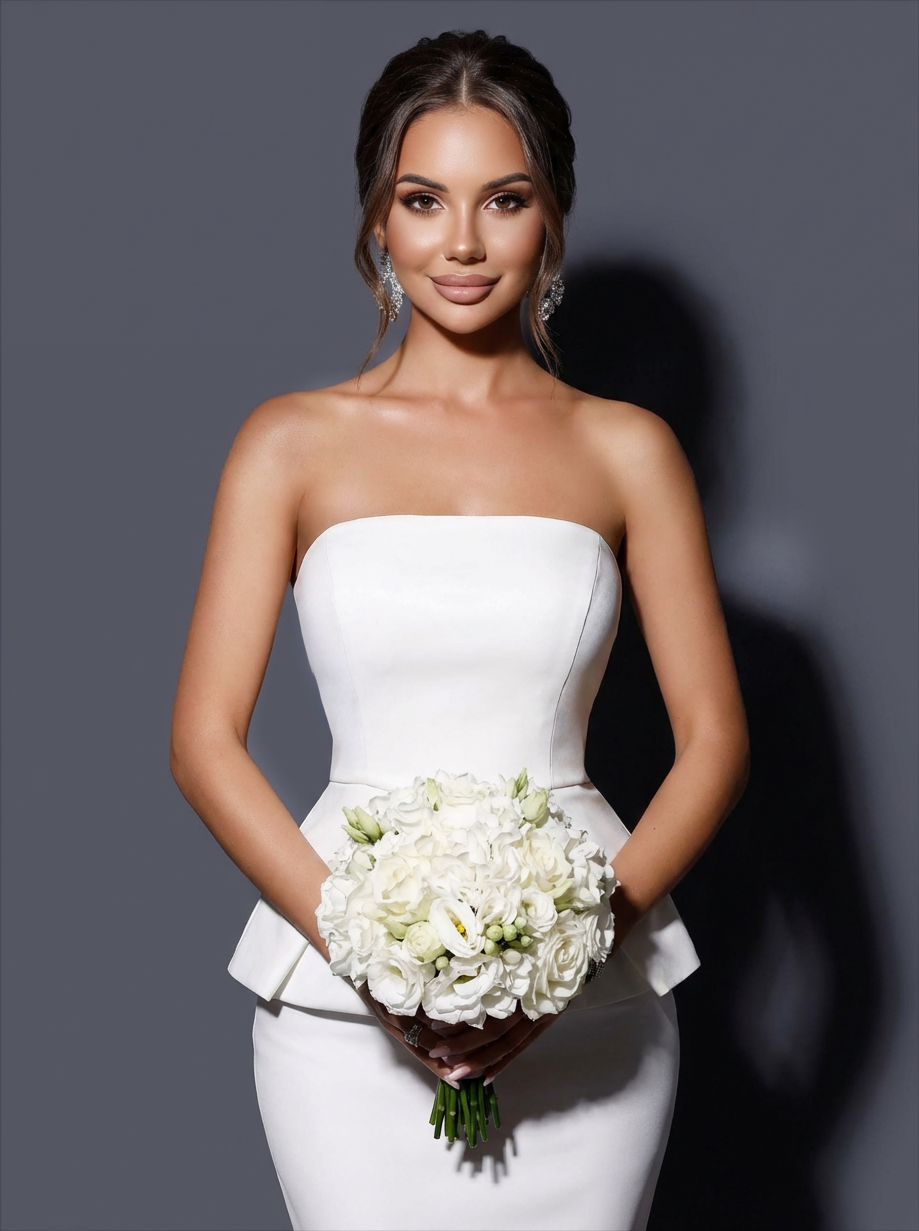 Это утончённое свадебное платье создано для особых событий, где важна безупречная посадка и благородная элегантность. Модель выполнена в лаконичном силуэте без бретелек, что подчёркивает линию плеч и делает образ особенно женственным и утончённым. Главным акцентом служит изящная баска, мягко формирующая талию и создающая эффект стройного, гармоничного силуэта. Верх белого платья выполнен из эко-кожи, низ тканевый.