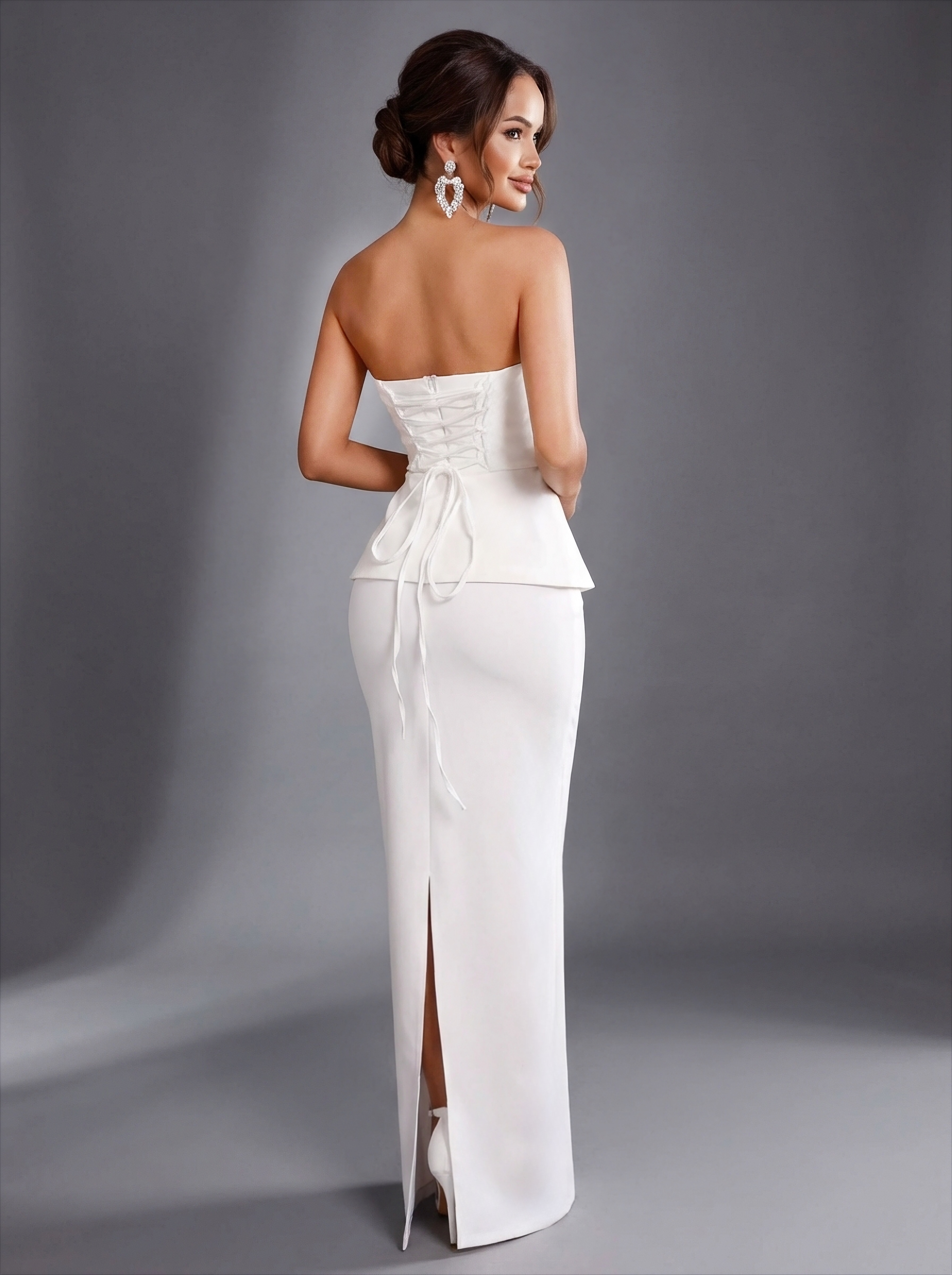Длинная, прямая юбка создаёт элегантный вертикальный силуэт и визуально вытягивает фигуру. Лёгкий разрез делает походку свободной и добавляет образу утончённой утончённости. Белый оттенок усиливает ощущение лёгкости и премиальности, создавая по-настоящему торжественный эффект.