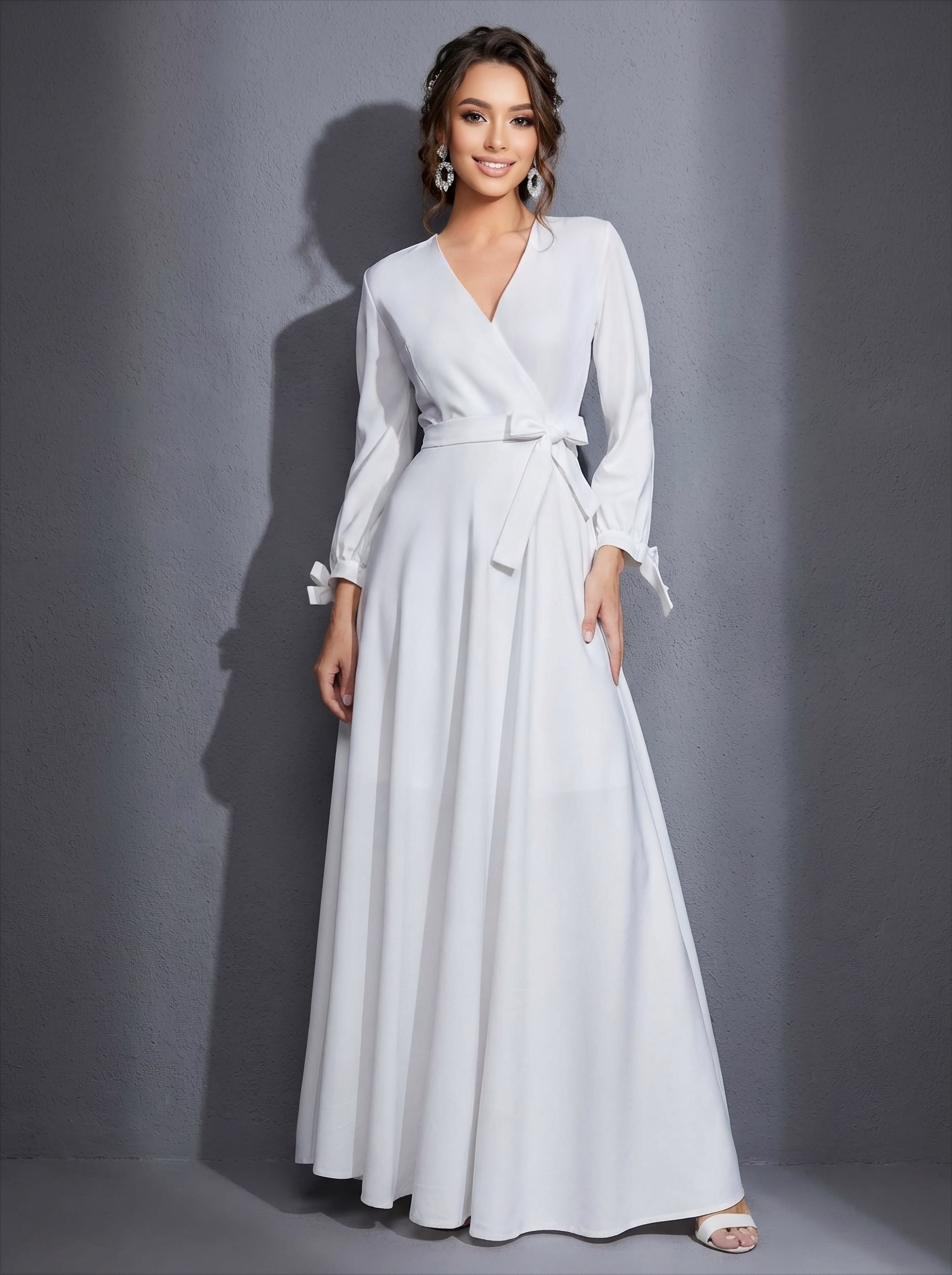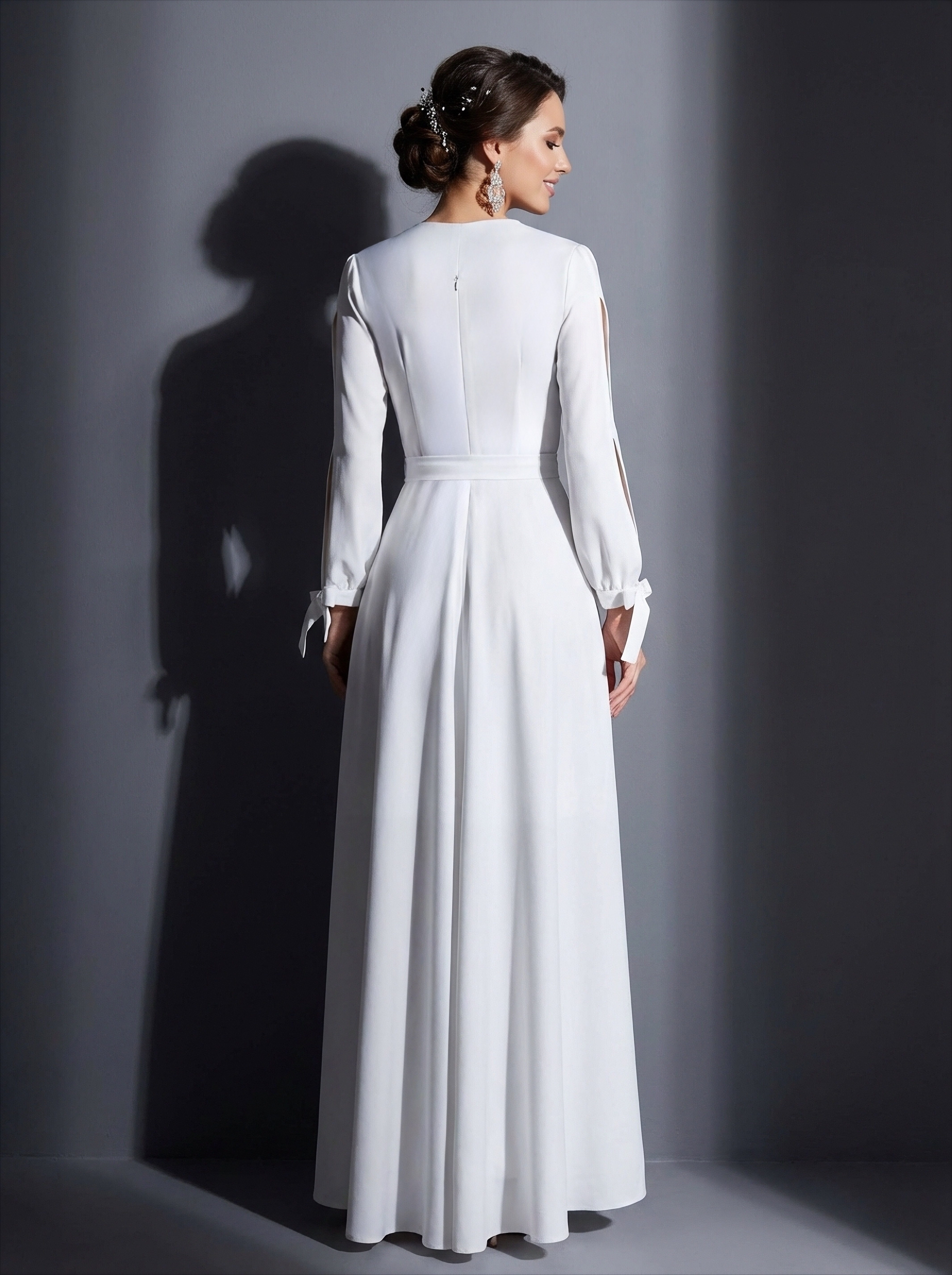 Это белое свадебное платье имеет длину макси. Оно отличается длинными рукавами с манжетами на завязках и глубоким V-образным вырезом. Талию подчеркивает тонкий пояс, а подол имеет легкие структурные складки.