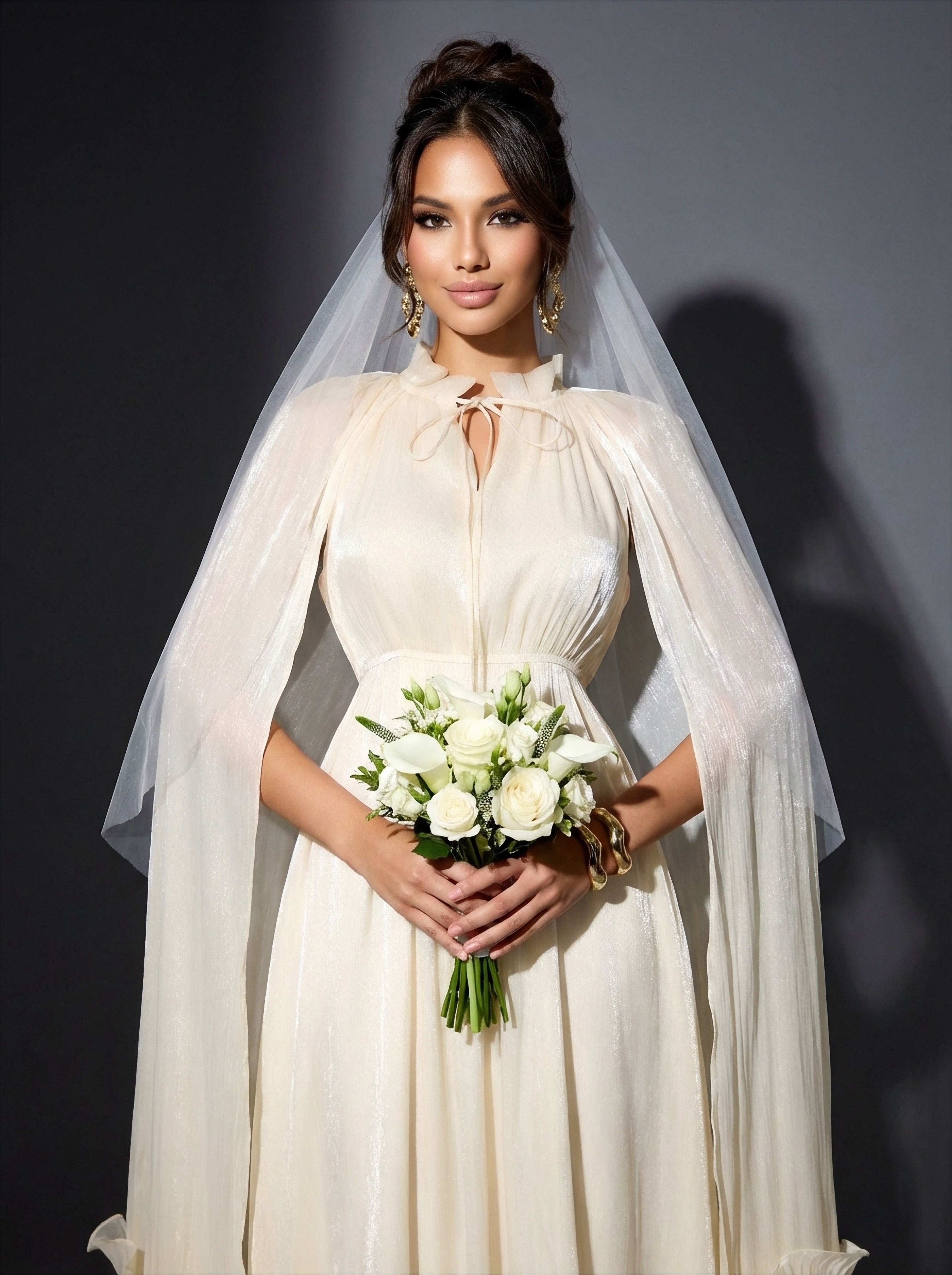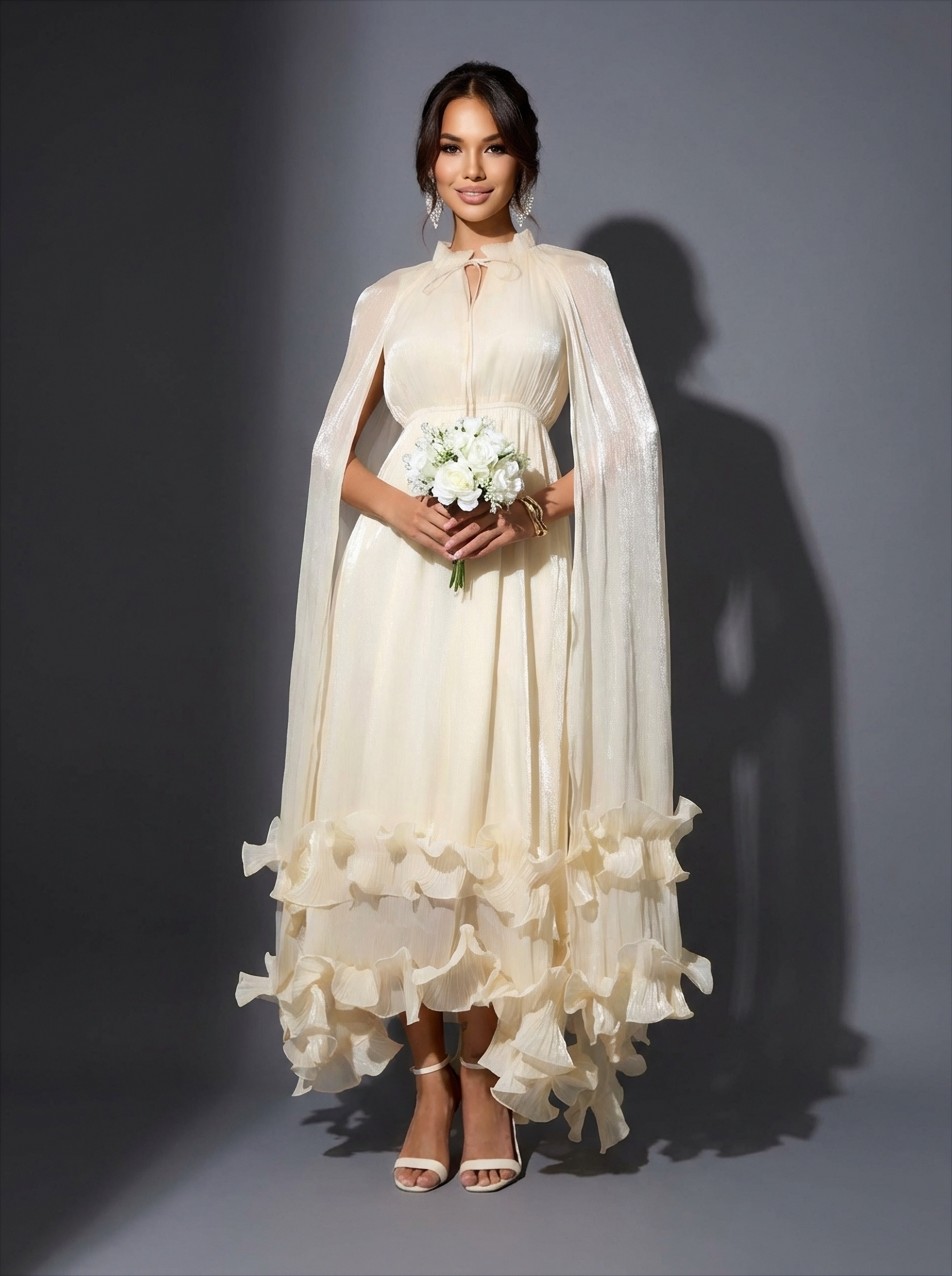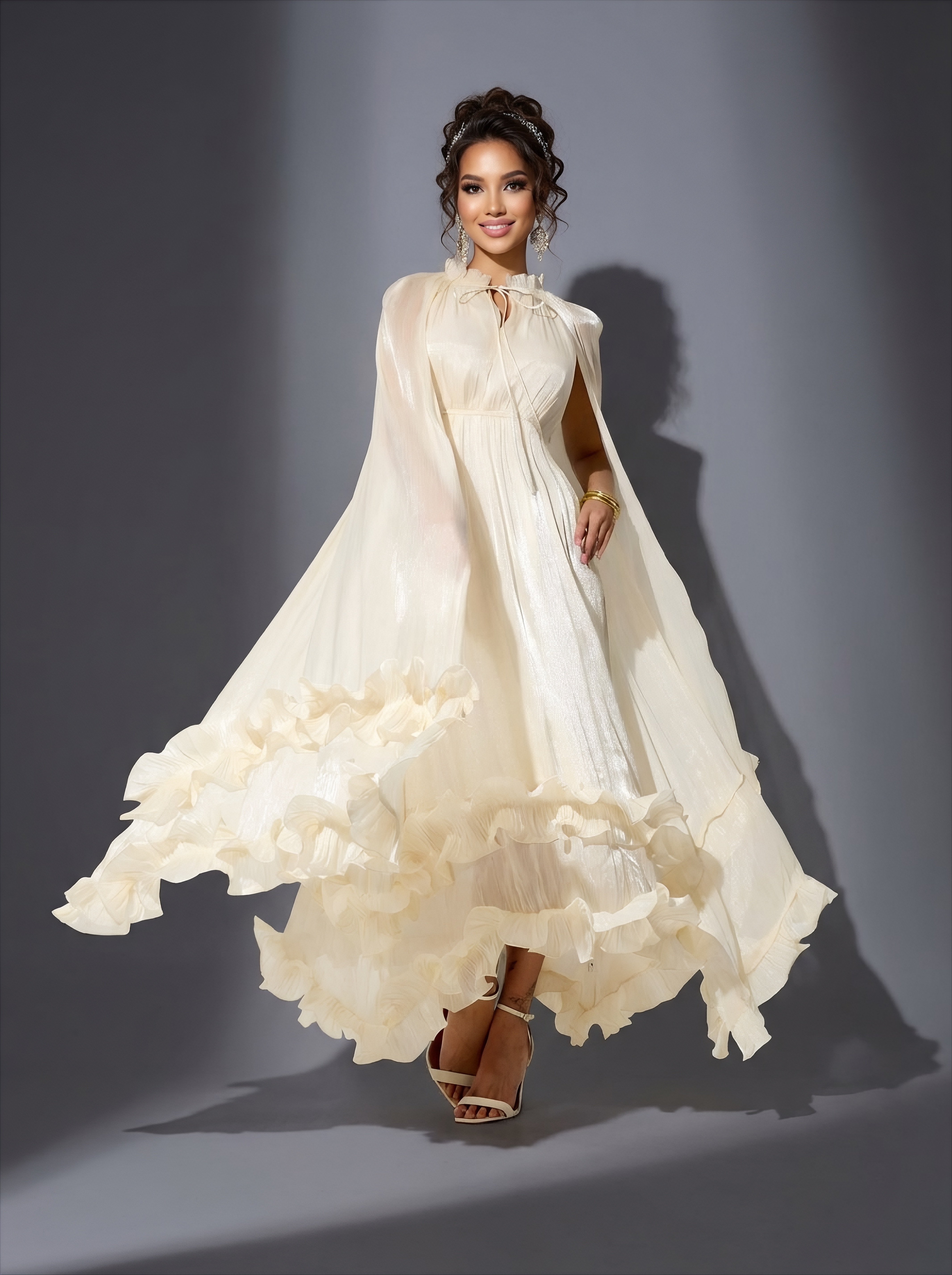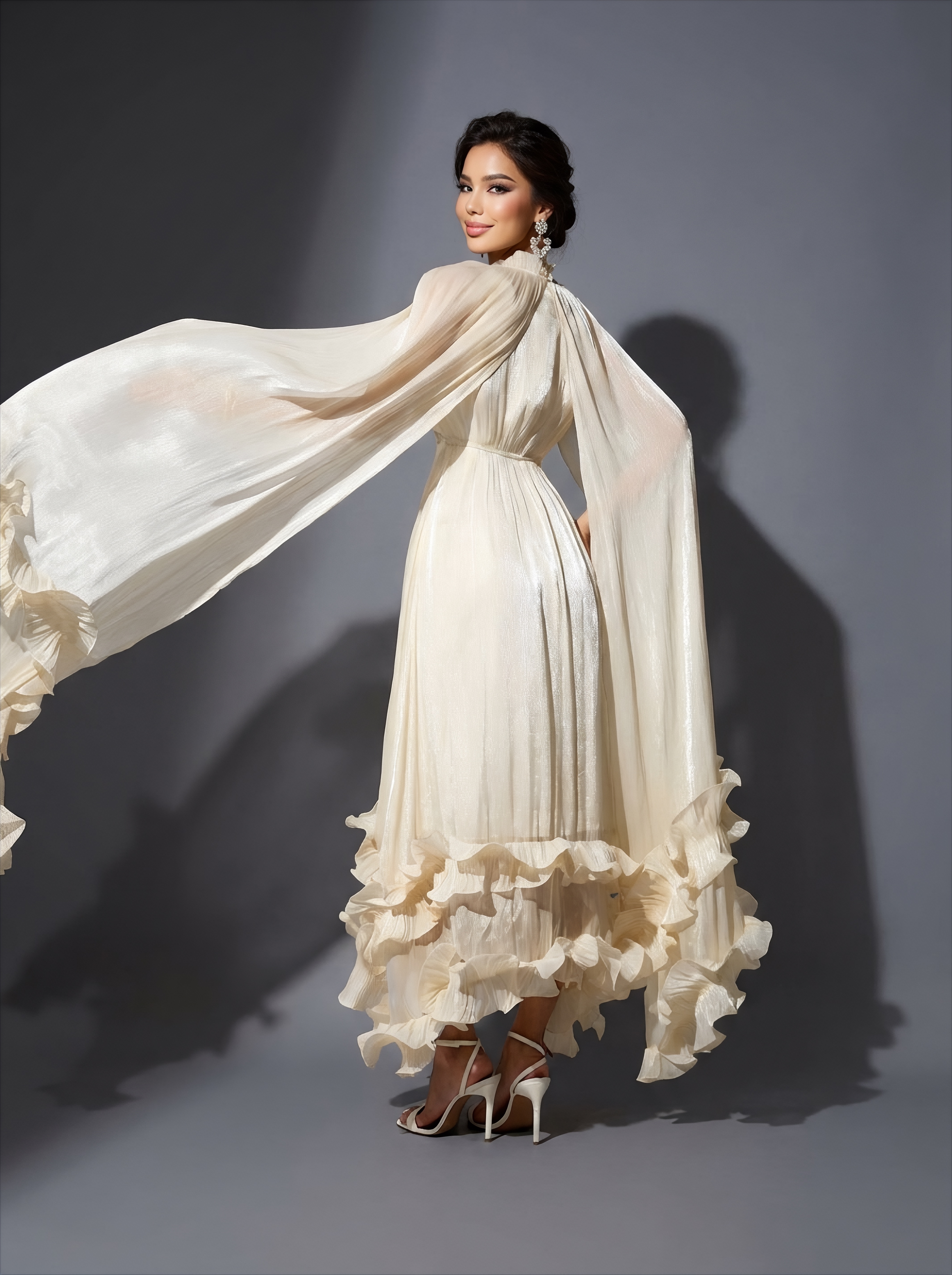Невероятно нежное и легкое бежевое платье в стиле «богиня» создано для девушек, которые ценят утонченность, воздушность и естественную элегантность. Модель выполнена из струящейся, слегка мерцающей ткани, которая красиво переливается на солнце, создавая эффект лёгкого свечения. Оригинальные длинные шифоновые крылья, переходящие в рукава-накидки, добавляют платью театральности и делают образ по-настоящему запоминающимся. Нижняя часть украшена крупными воланами, создающими романтичный женственный силуэт и объёмную динамику при движении.