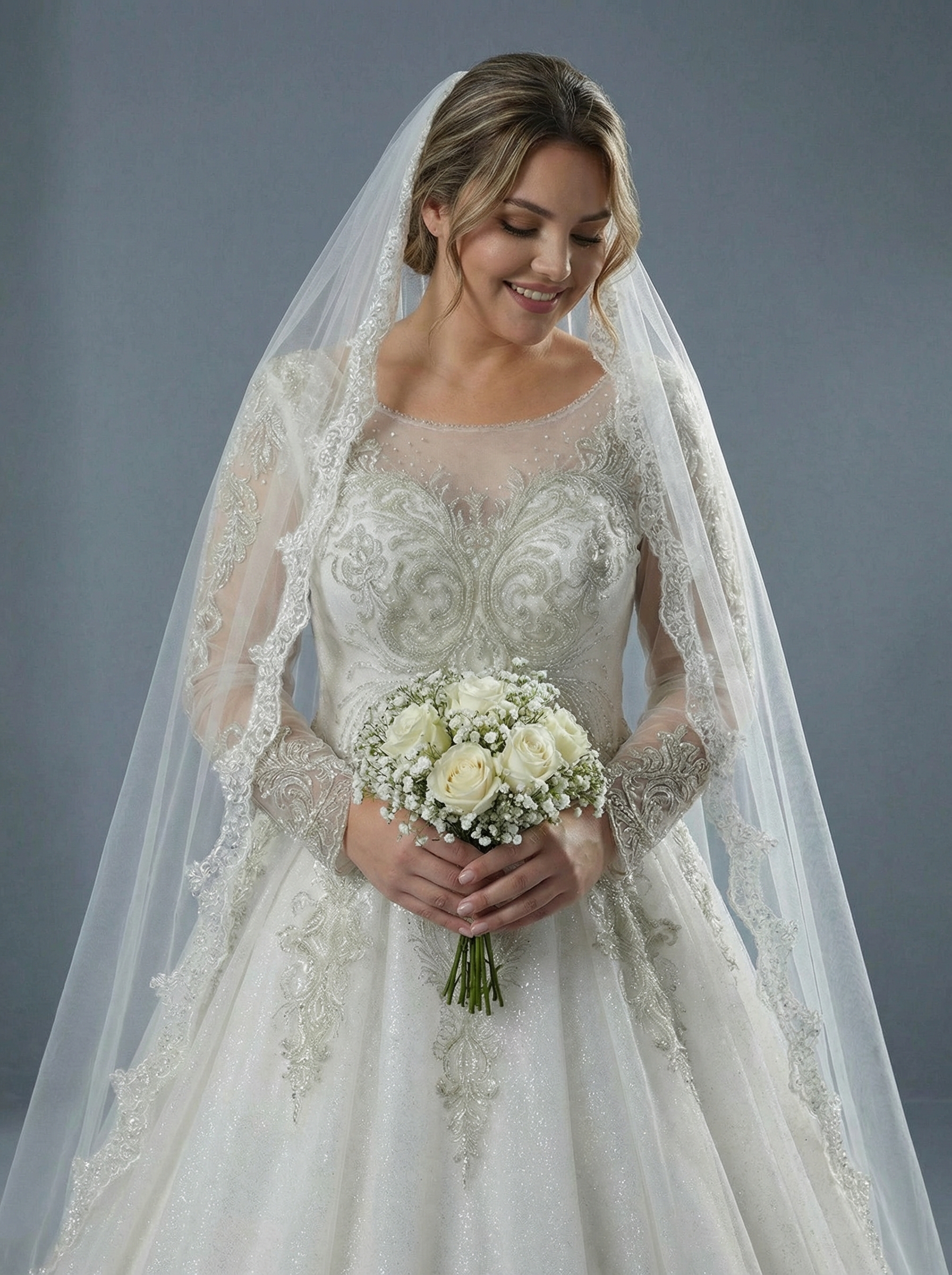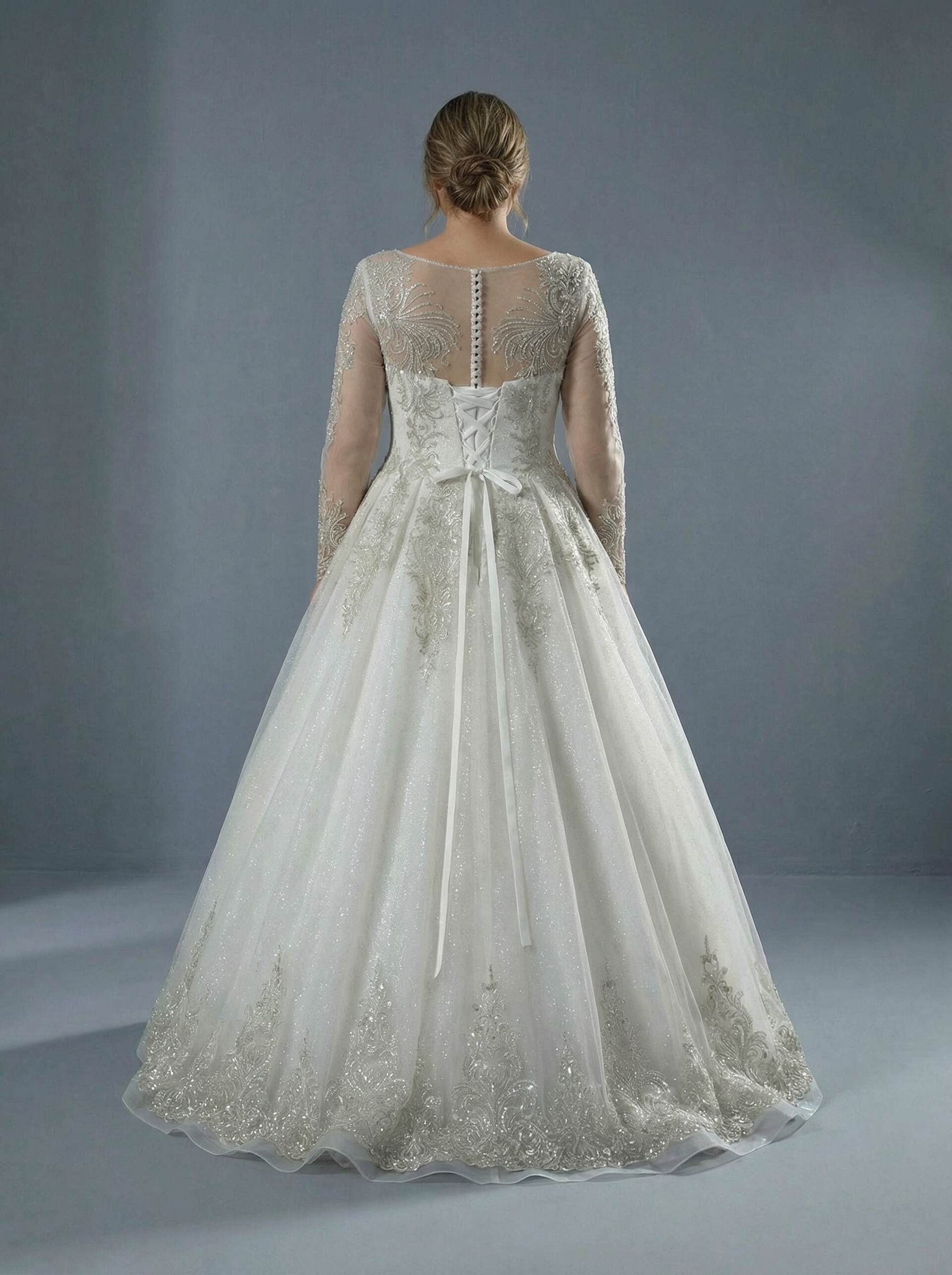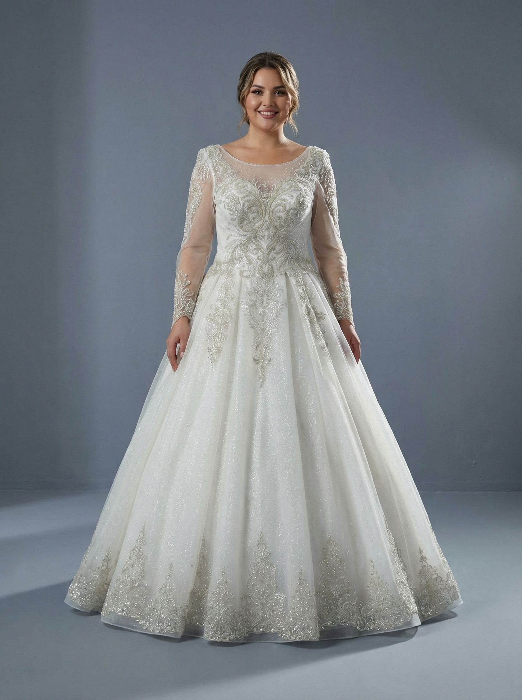 Платье А-силуэта с плавно расширяющейся юбкой, что создает величественный и женственный образ. Модель обильно украшена изысканной вышивкой и кружевными аппликациями с серебристым отливом. Особое внимание привлекает мерцающее напыление (глиттер) на ткани, которое придает платью благородное сияние. Закрытый лиф с вырезом «лодочка» дополнен прозрачными длинными рукавами, также украшенными кружевом. Это добавляет образу утонченности и скромности. Для создания юбки использовано несколько слоев легкого тюля или фатина, что придает ей необходимый объем и воздушность.