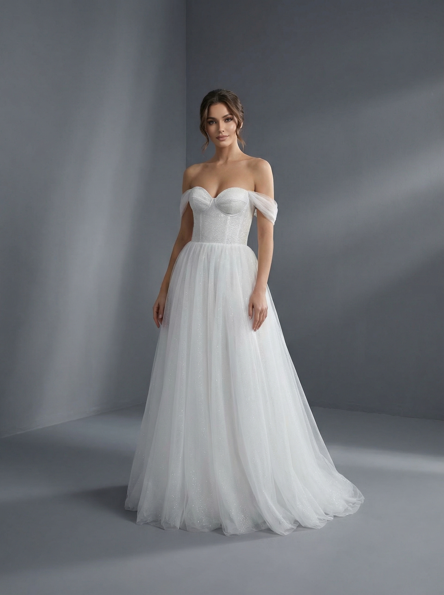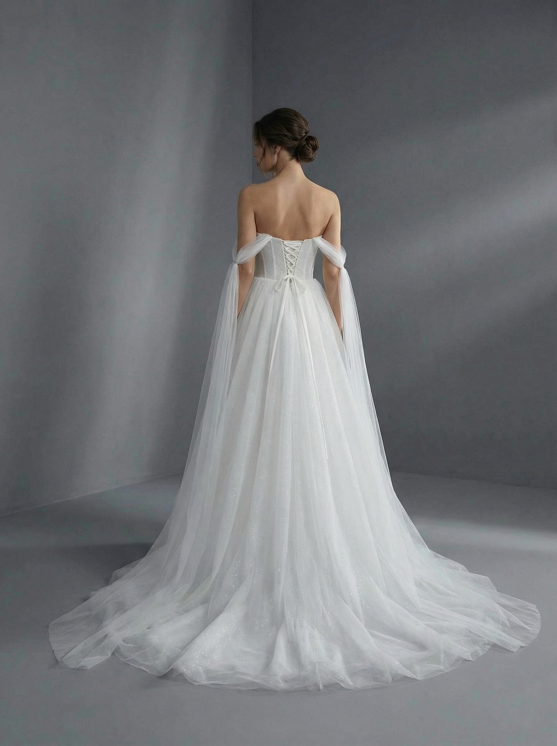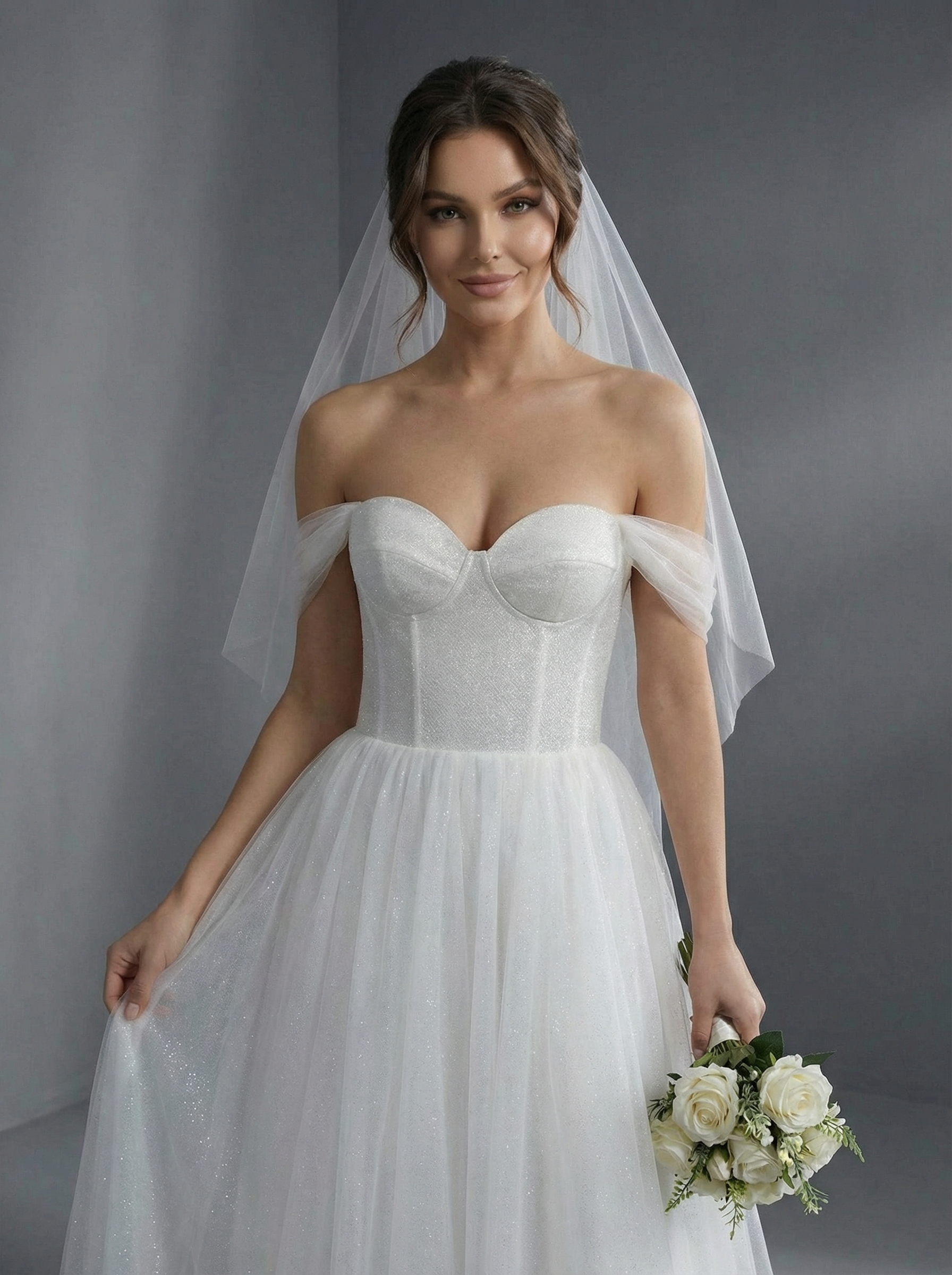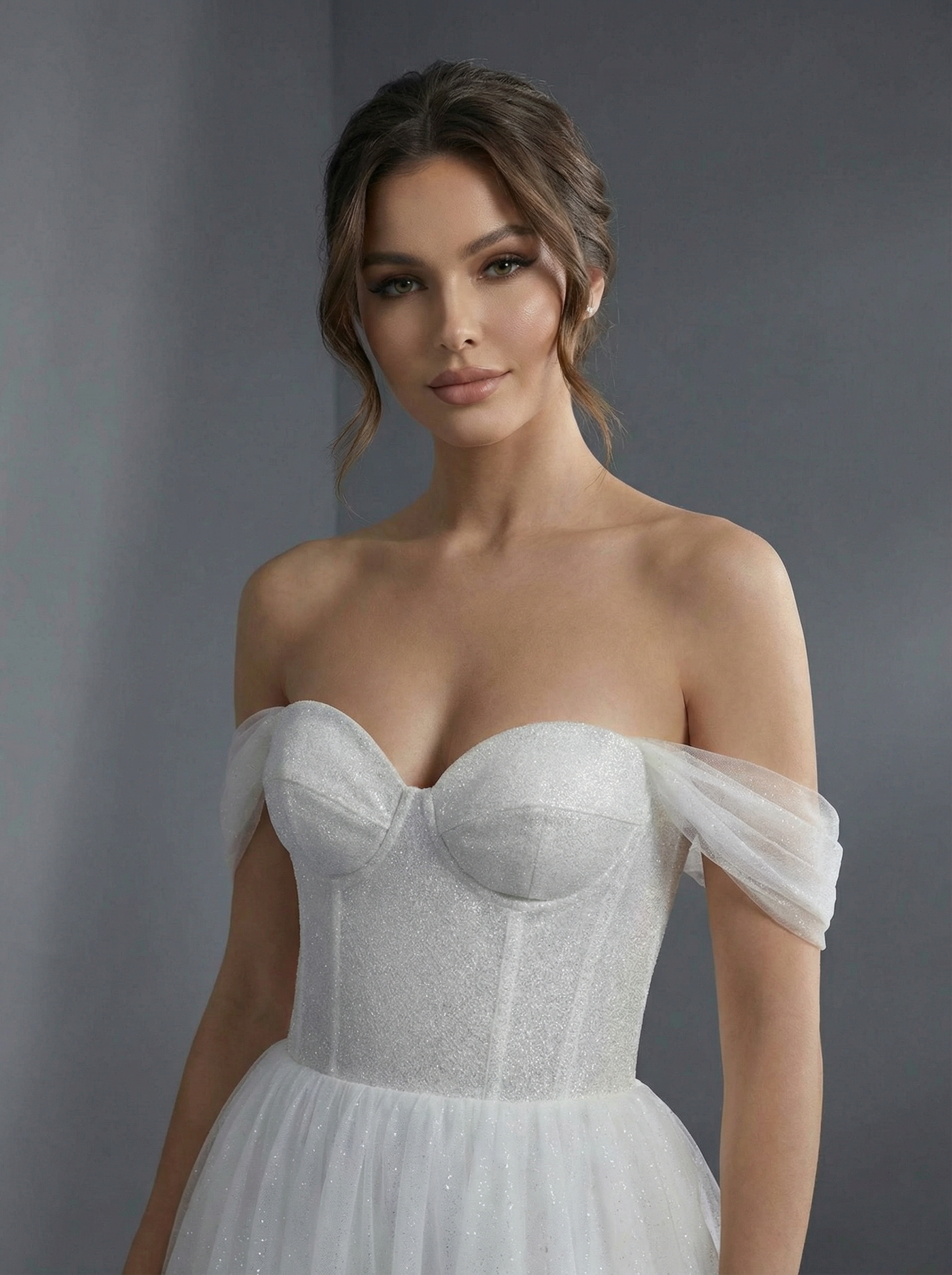 Верх выполнен в стиле бюстье с вырезом в форме «сердечка» (sweetheart neckline). Лиф имеет выраженную текстуру с вертикальными линиями косточек, что создает четкий силуэт. Тонкие, воздушные рукава из фатина мягко ниспадают на плечи, придавая образу романтичность и легкость. Пышная юбка в пол изготовлена из нескольких слоев легкого еврофатина. В некоторых вариантах подобных моделей (например, «Кристини» или «Mia») используется блестящий фатин, который придает платью деликатное сияние. Классический белый или молочный (айвори).