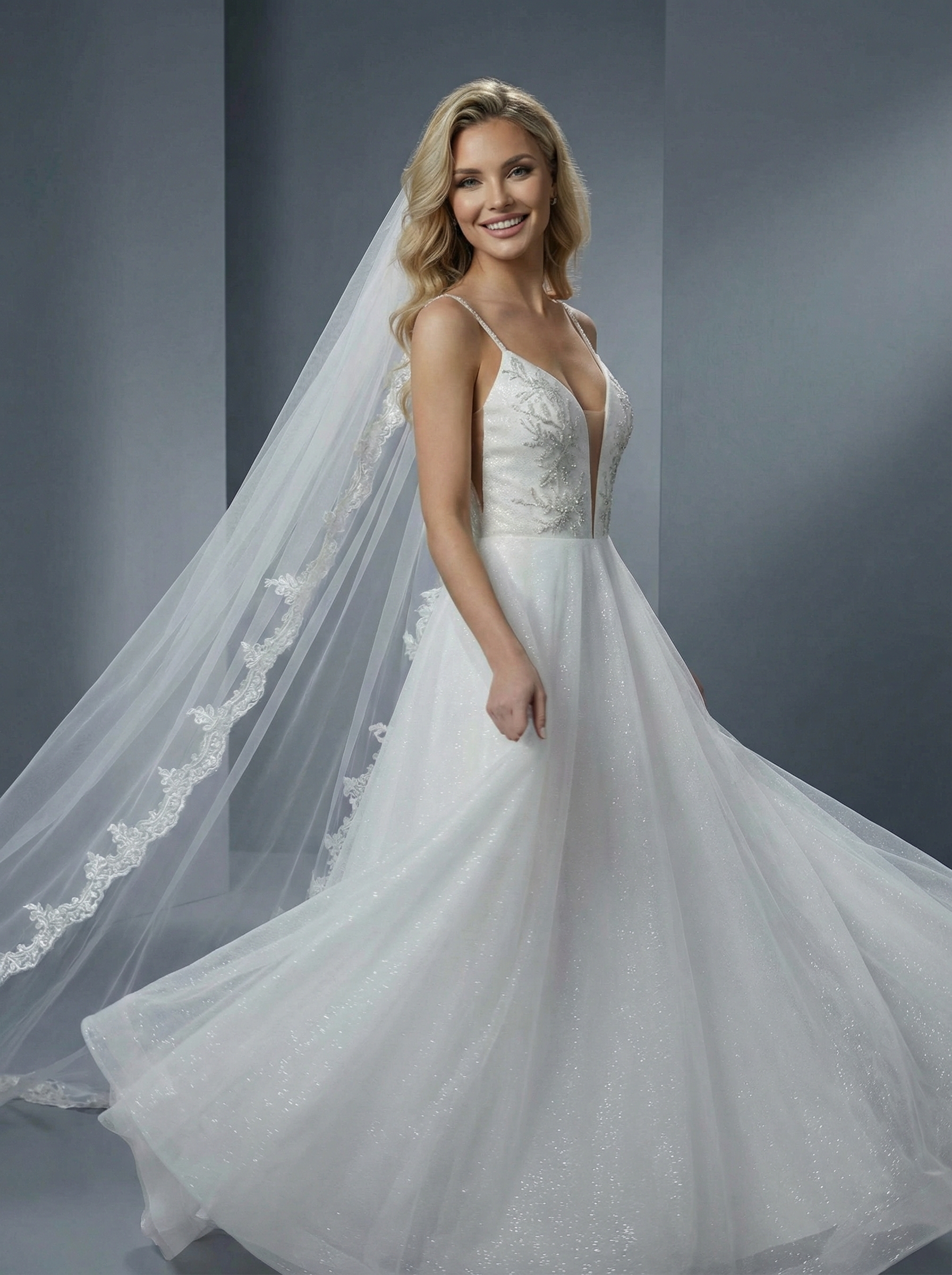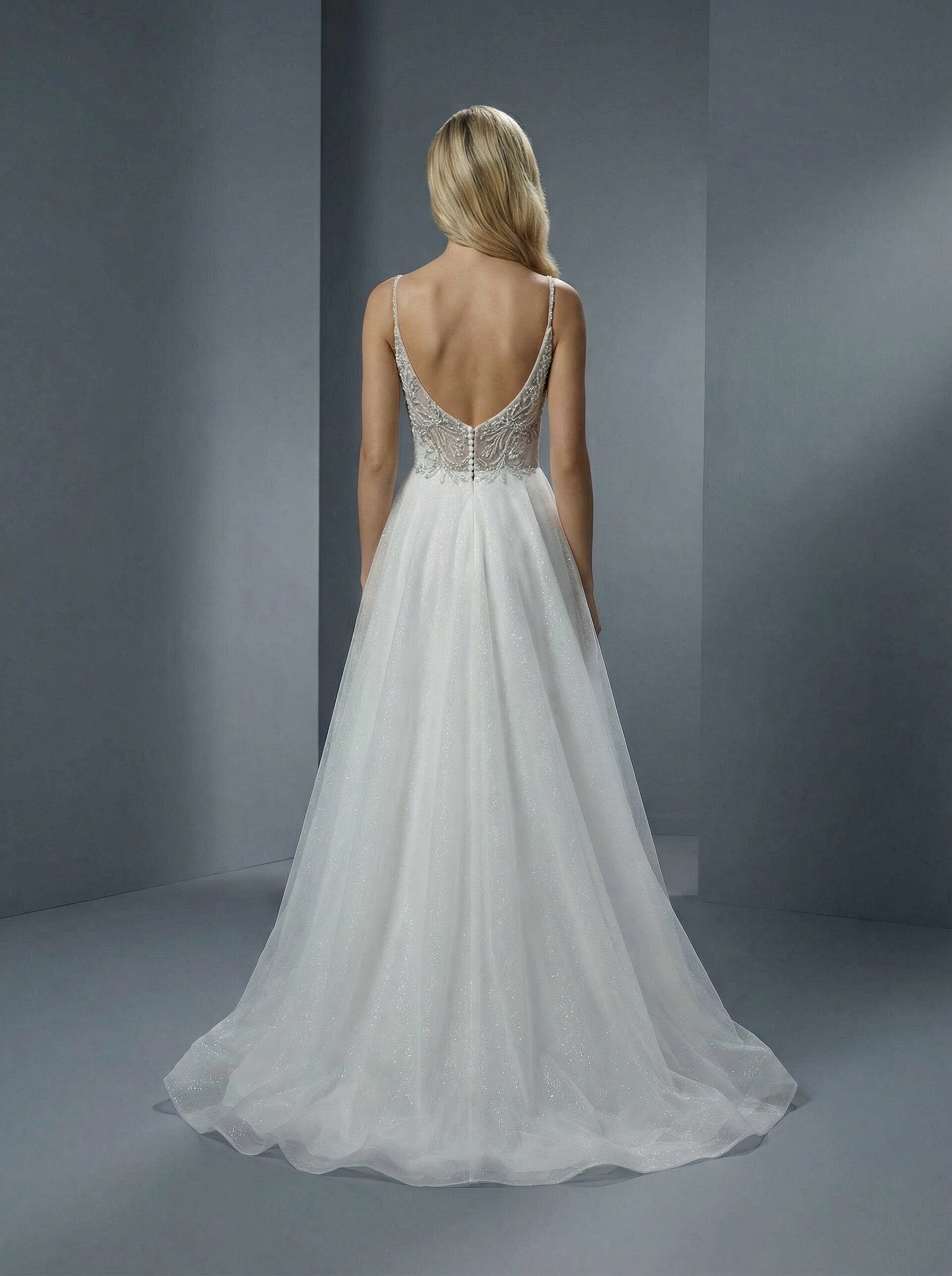 Облегающий лиф на тонких бретелях-спагетти. Особенностью является глубокий V-образный вырез (декольте) и открытая спинка. Лиф декорирован изящной цветочной вышивкой или кружевными аппликациями с использованием мерцающих элементов. Пышная многослойная юбка в пол, выполненная из легкого фатина или мягкого тюля. Ткань имеет деликатный блеск, создающий эффект мерцания при движении. Платье сочетает в себе элементы современной классики и романтизма, идеально подходит для создания нежного и женственного образа невесты.