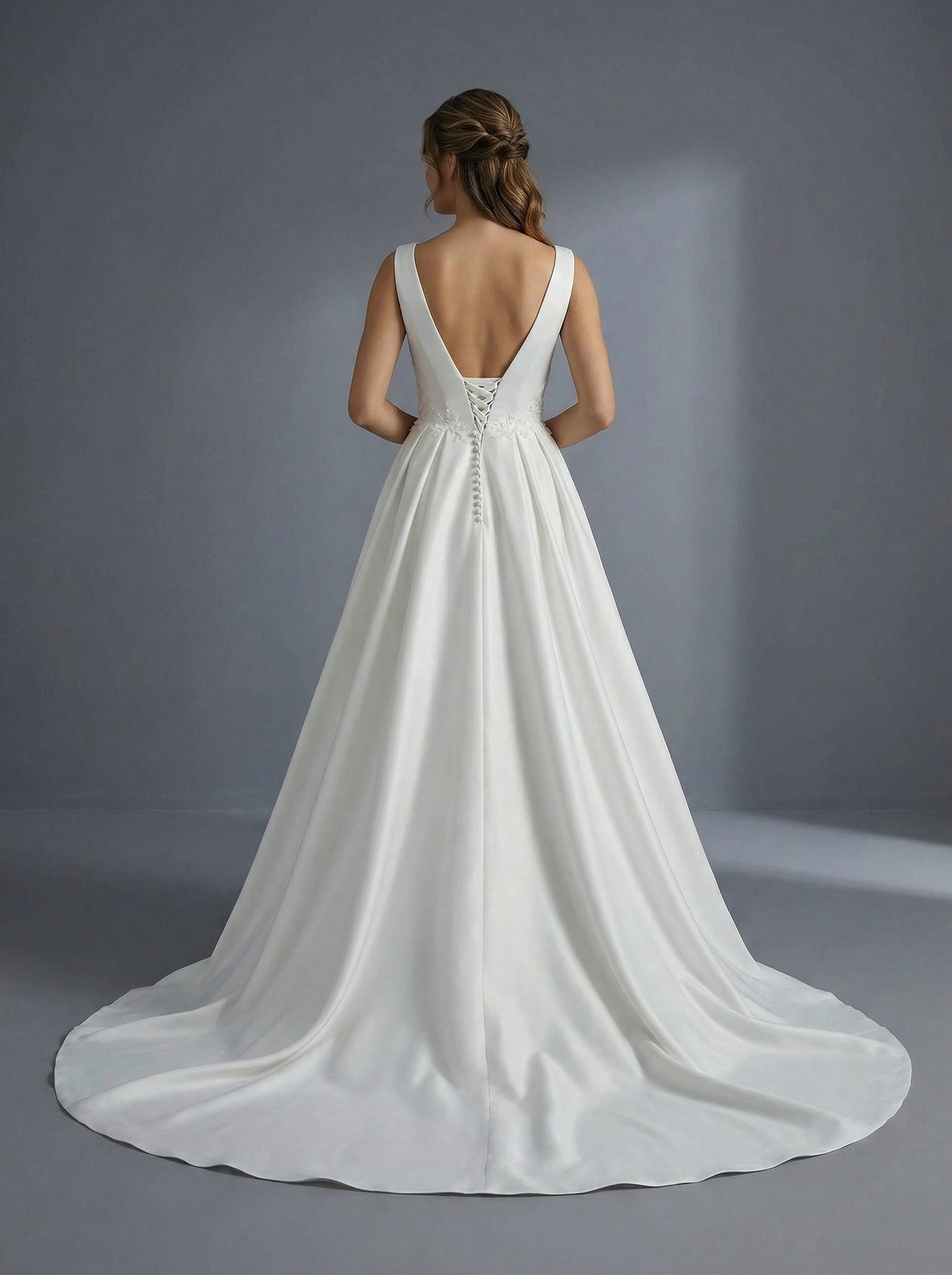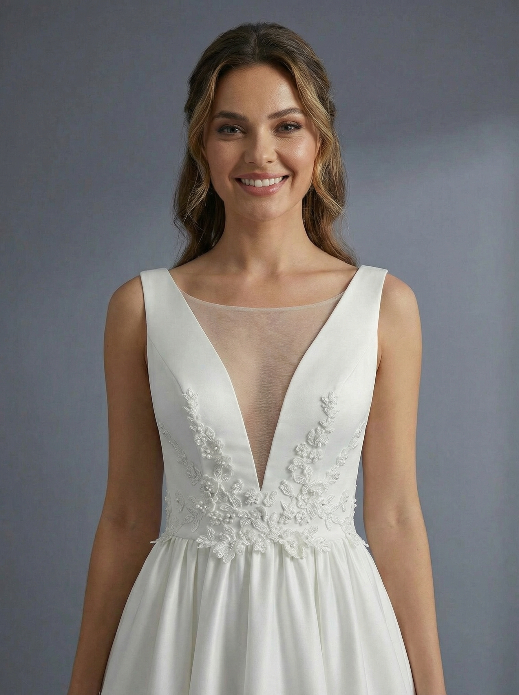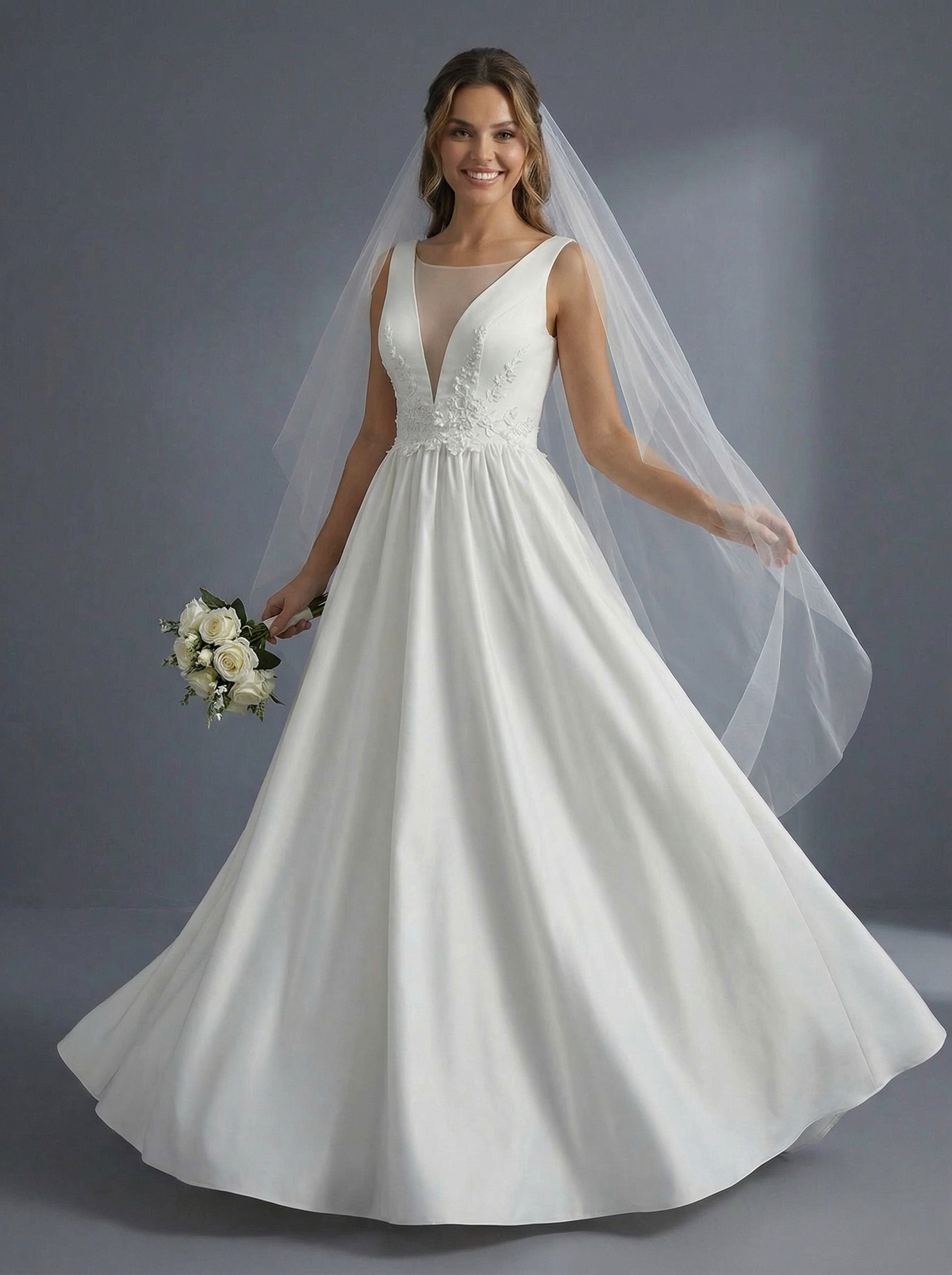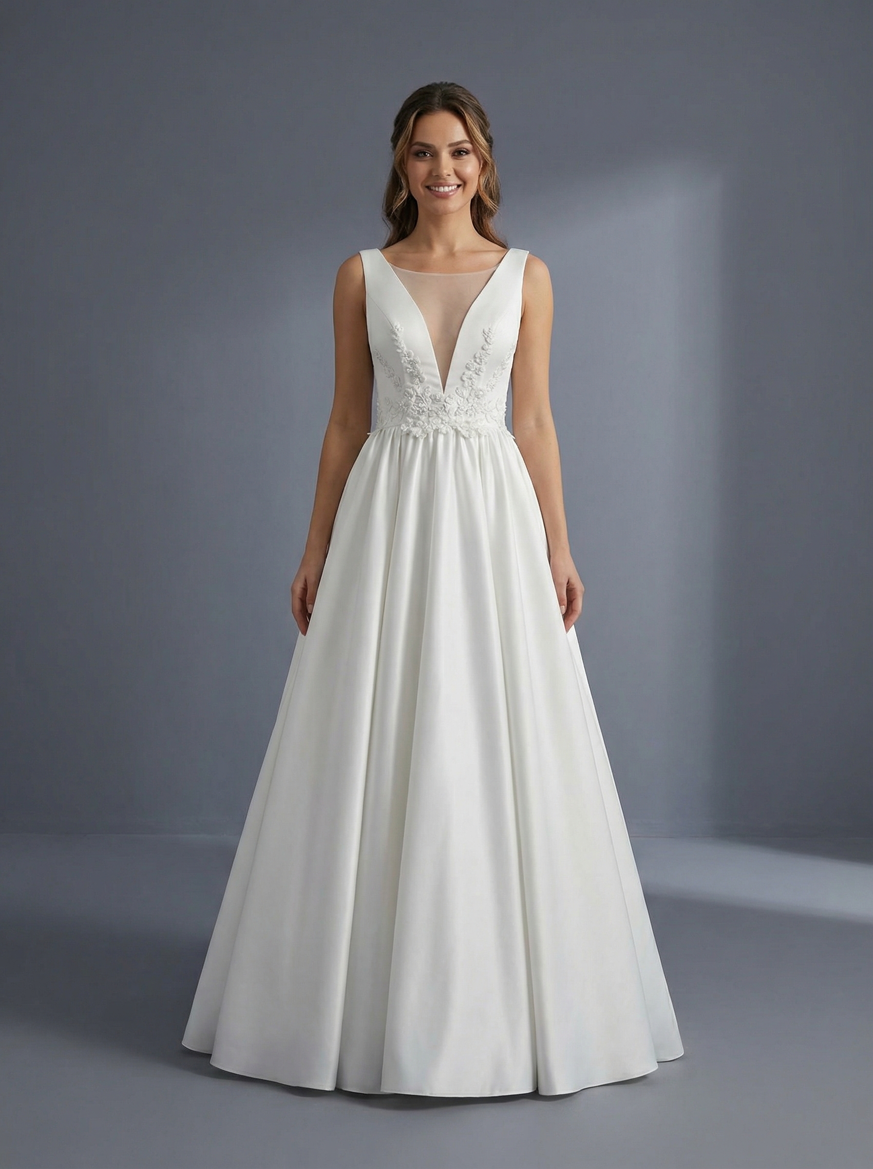 Платье имеет глубокий V-образный вырез, который дополнен вставкой из прозрачной сетки для фиксации формы. Модель выполнена без рукавов с широкими бретелями. Лиф и зона талии украшены изящной цветочной вышивкой или аппликациями, которые плавно переходят на верхнюю часть юбки. Пышная юбка в пол выполнена из плотной, гладкой ткани (вероятно, атласа или микадо), которая хорошо держит форму и образует мягкие складки. Такой фасон считается классическим, так как он выгодно подчеркивает талию и подходит практически любому типу фигуры.