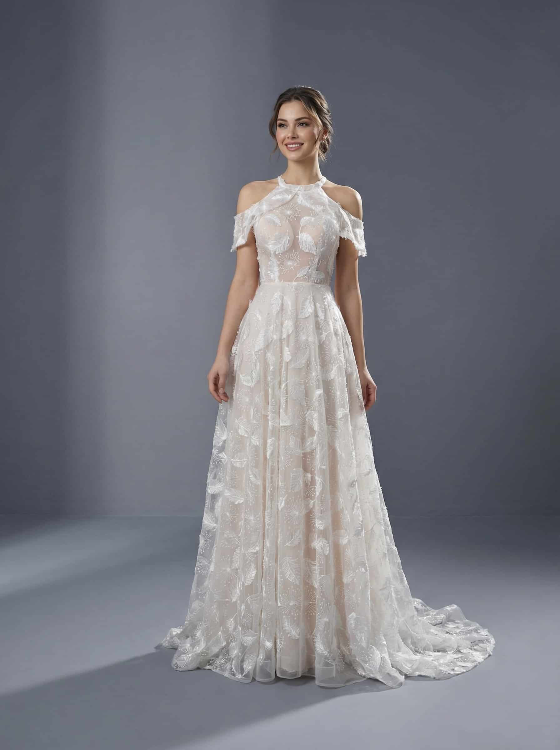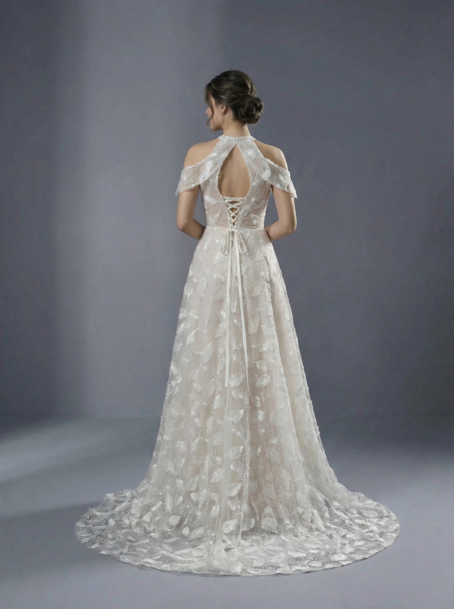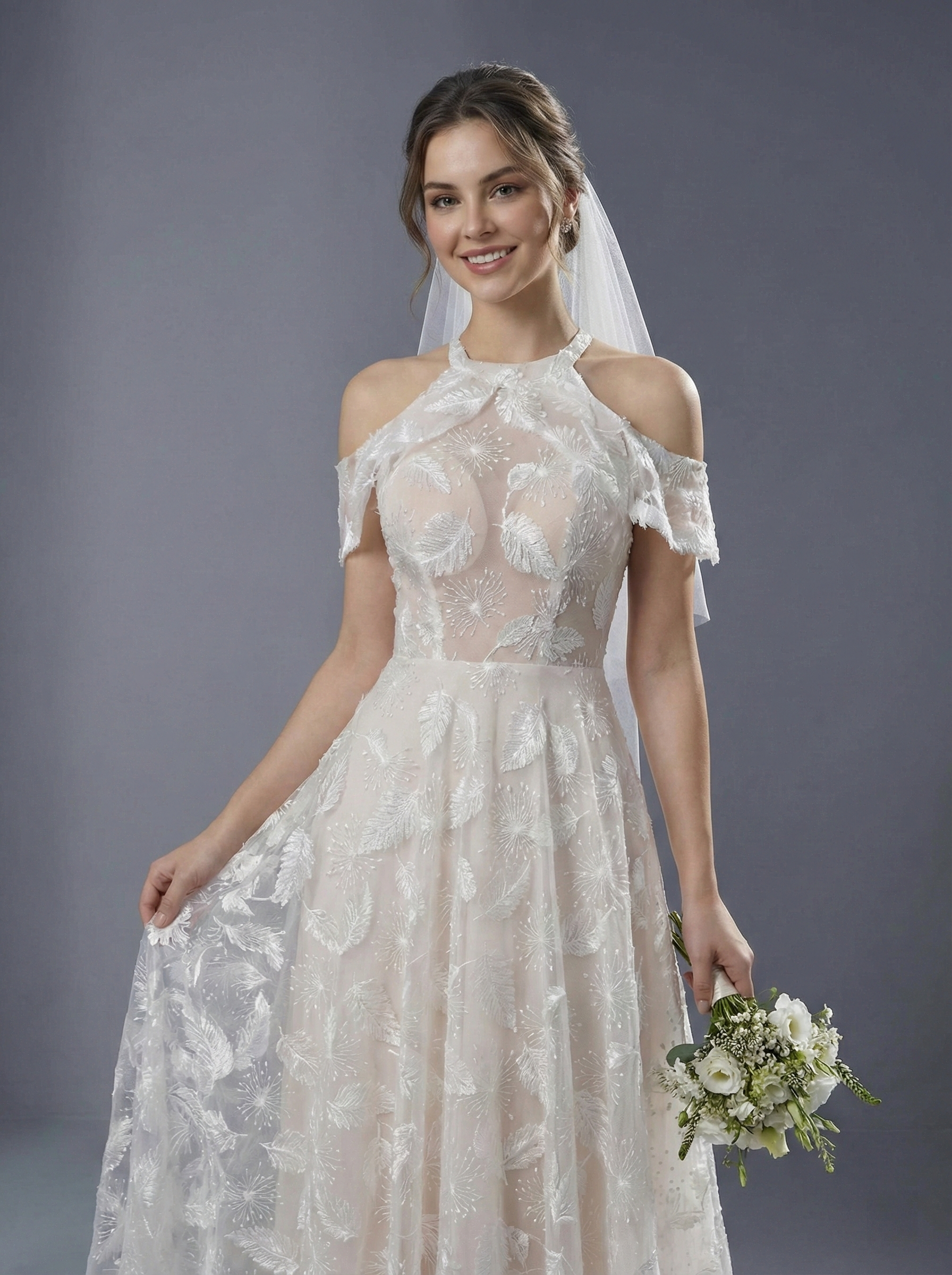 Платье имеет закрытый воротник-стойку (халтер) и дополнено актуальными спущенными рукавами, открывающими плечи. По всей длине изделие украшено объемными аппликациями. Подобный декор часто встречается в моделях, имитирующих цветочные лепестки, бабочек или перья. Струящаяся многослойная юбка из легкого материала (например, фатина или органзы) плавно переходит в небольшой шлейф. Платье выполнено в нежных пастельных тонах, которые могут варьироваться от классического молочного (Ivory) до нюдового или бежевого оттенков