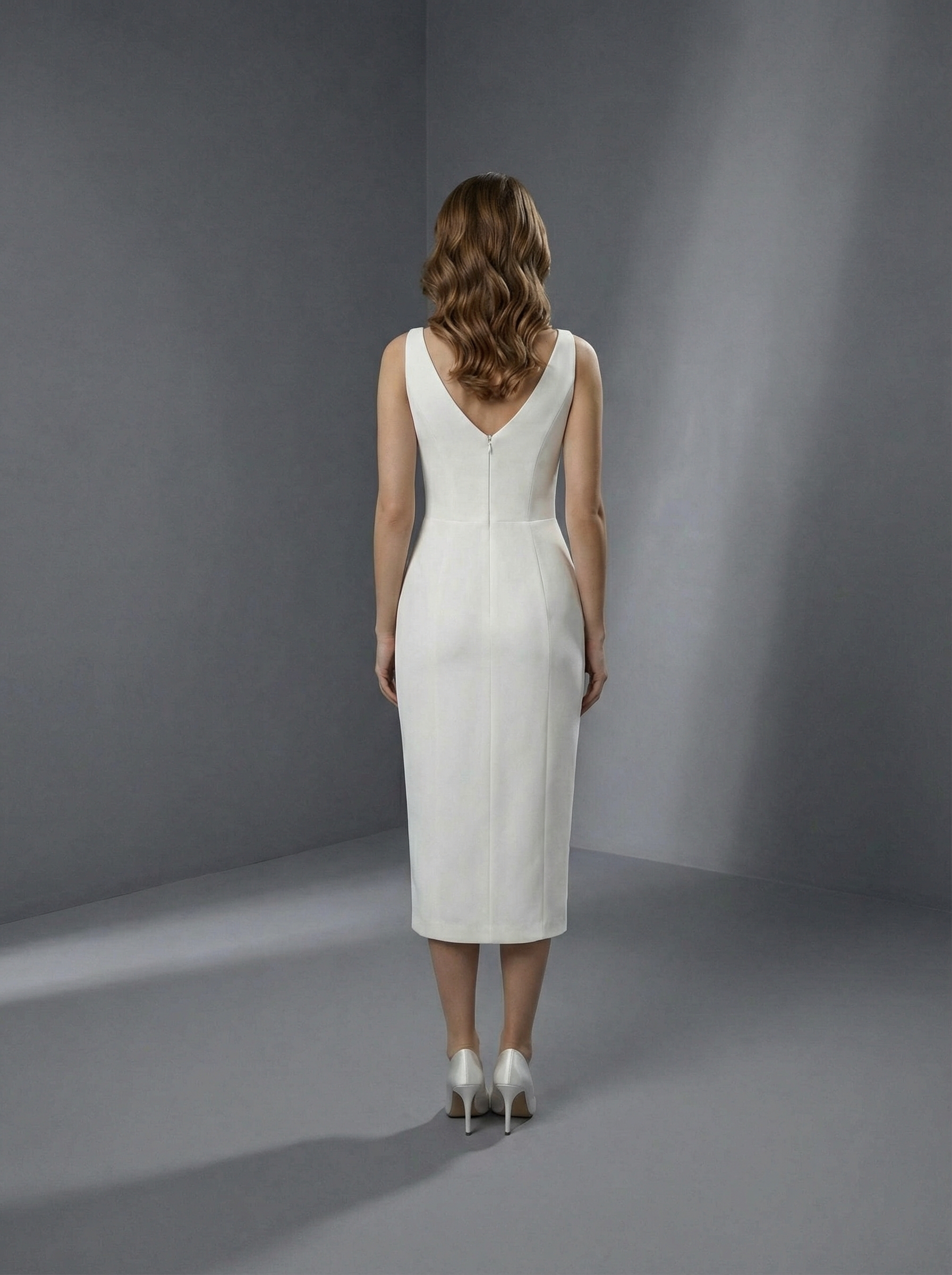 Платье имеет глубокое V-образное декольте, которое визуально вытягивает силуэт. Актуальная длина миди (ниже колена).Платье дополнено высоким разрезом спереди, обеспечивающим свободу движений и добавляющим образу акцентности. Модель выполнена из плотного матового атласа или крепа, что позволяет платью идеально садиться по фигуре. Лаконичный дизайн без лишнего декора делает его отличным выбором для современной невесты, росписи в ЗАГСе или в качестве второго платья для торжества