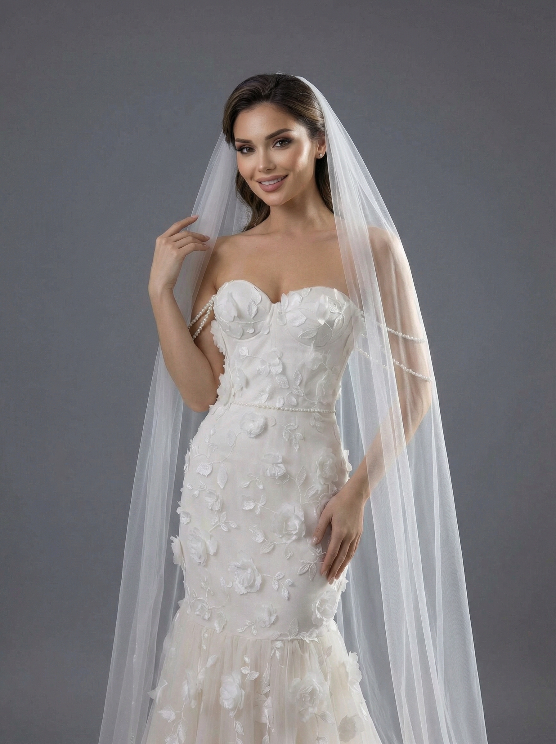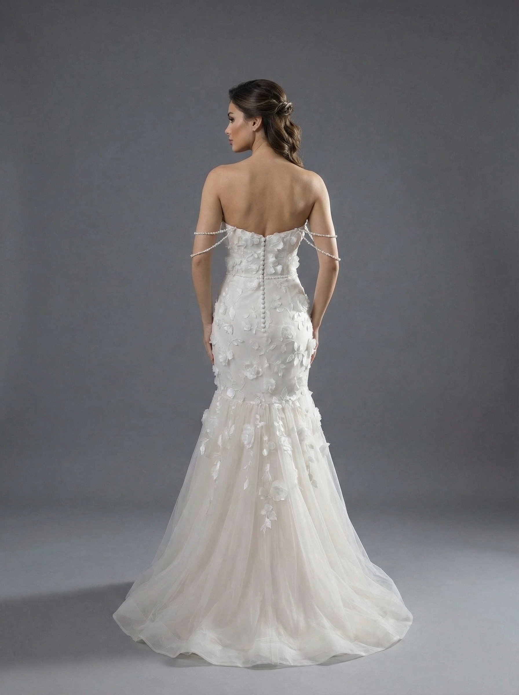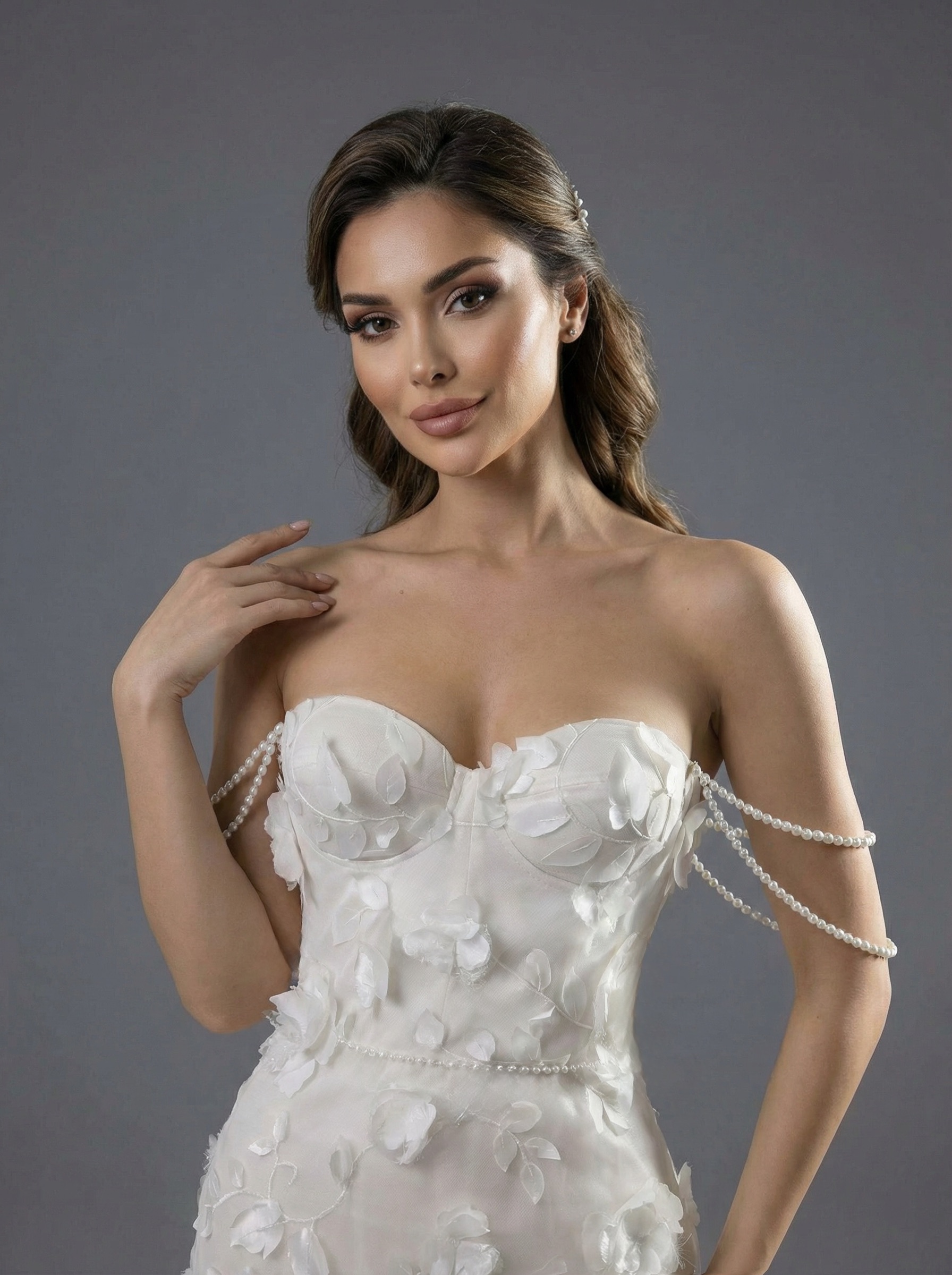Корсетного типа с вырезом в форме «сердечка». Он декорирован объемными 3D-аппликациями в виде цветов, которые придают образу нежность и фактурность. Особенностью модели являются изящные спадающие нити жемчуга на плечах, заменяющие традиционные рукава и создающие романтичный акцент. Облегающая до колен, она плавно переходит в пышный многослойный шлейф из легкого тюля или фатина. Цветочные аппликации с лифа «спускаются» на верхнюю часть юбки, создавая эффект единой композиции. Платье сочетает в себе классическую роскошь и современные тренды, идеально подходя для торжественной церемонии.