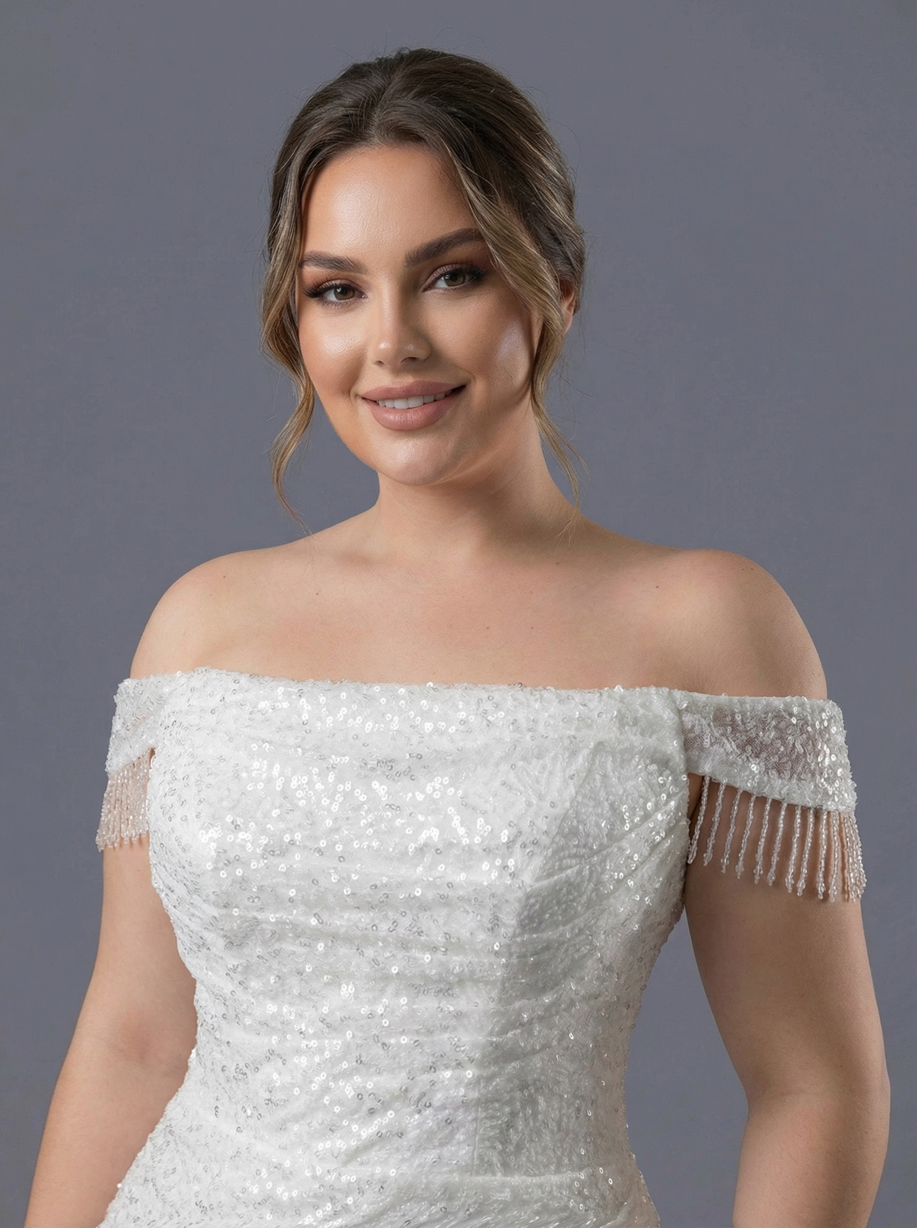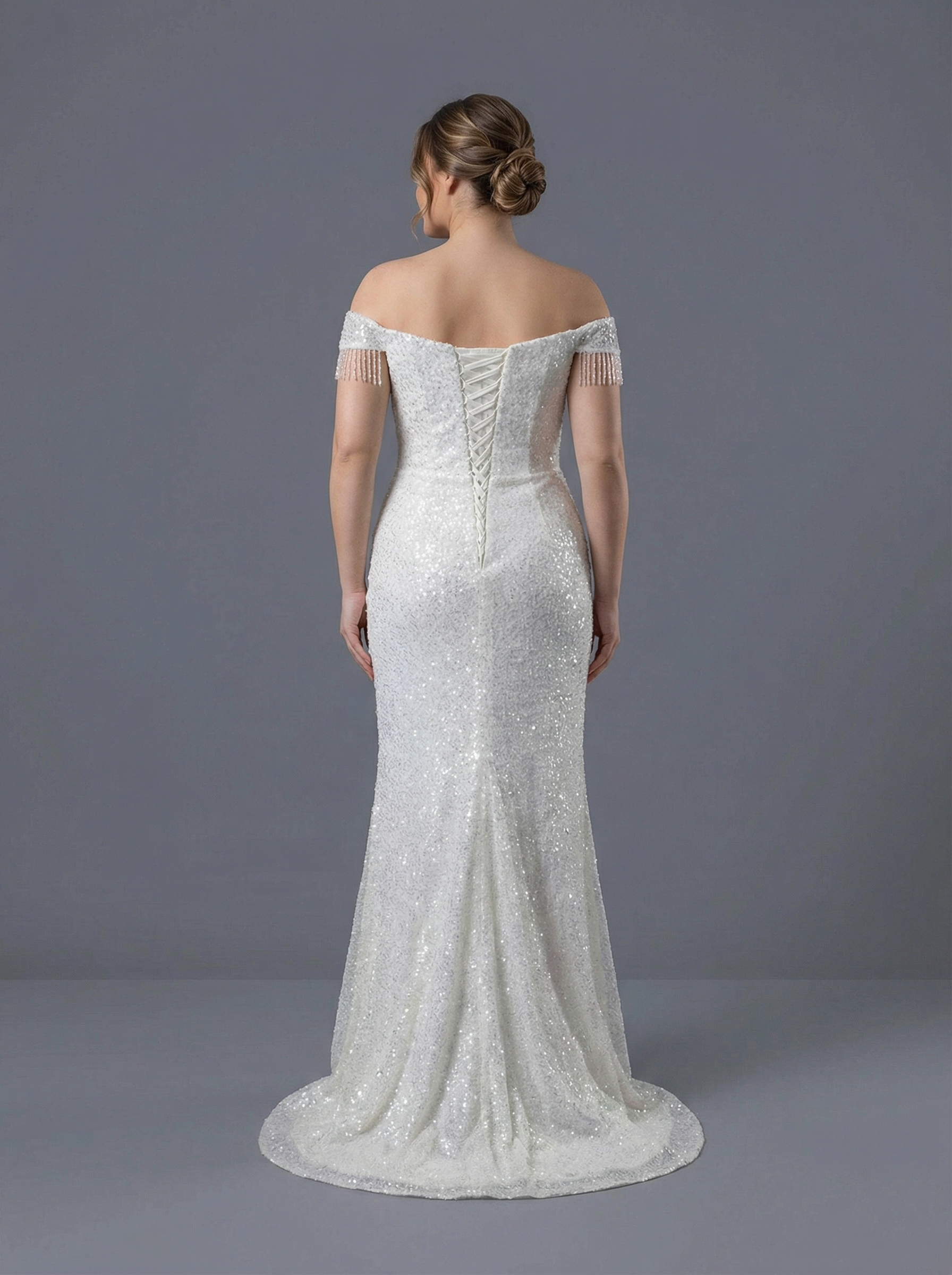 Открытые плечи с прямым вырезом. Особенностью являются спущенные бретели, декорированные тонкими нитями бисера или стекляруса, создающими эффект бахромы. Платье полностью покрыто блестящими пайетками (чешуйчатый эффект), которые создают эффект мерцания при движении. Облегающий крой с эффектным высоким разрезом по ноге, переходящий в небольшой шлейф. На талии и бедрах выполнена мягкая драпировка, которая помогает акцентировать женственные изгибы. Такое платье идеально подойдет для современной невесты, которая хочет совместить классический свадебный образ с элементами голливудского шика.