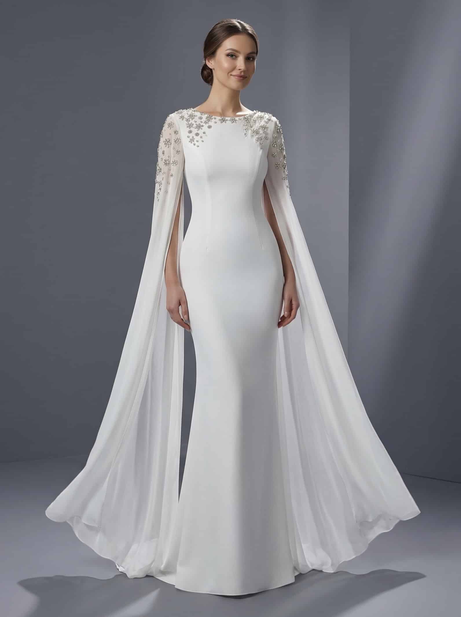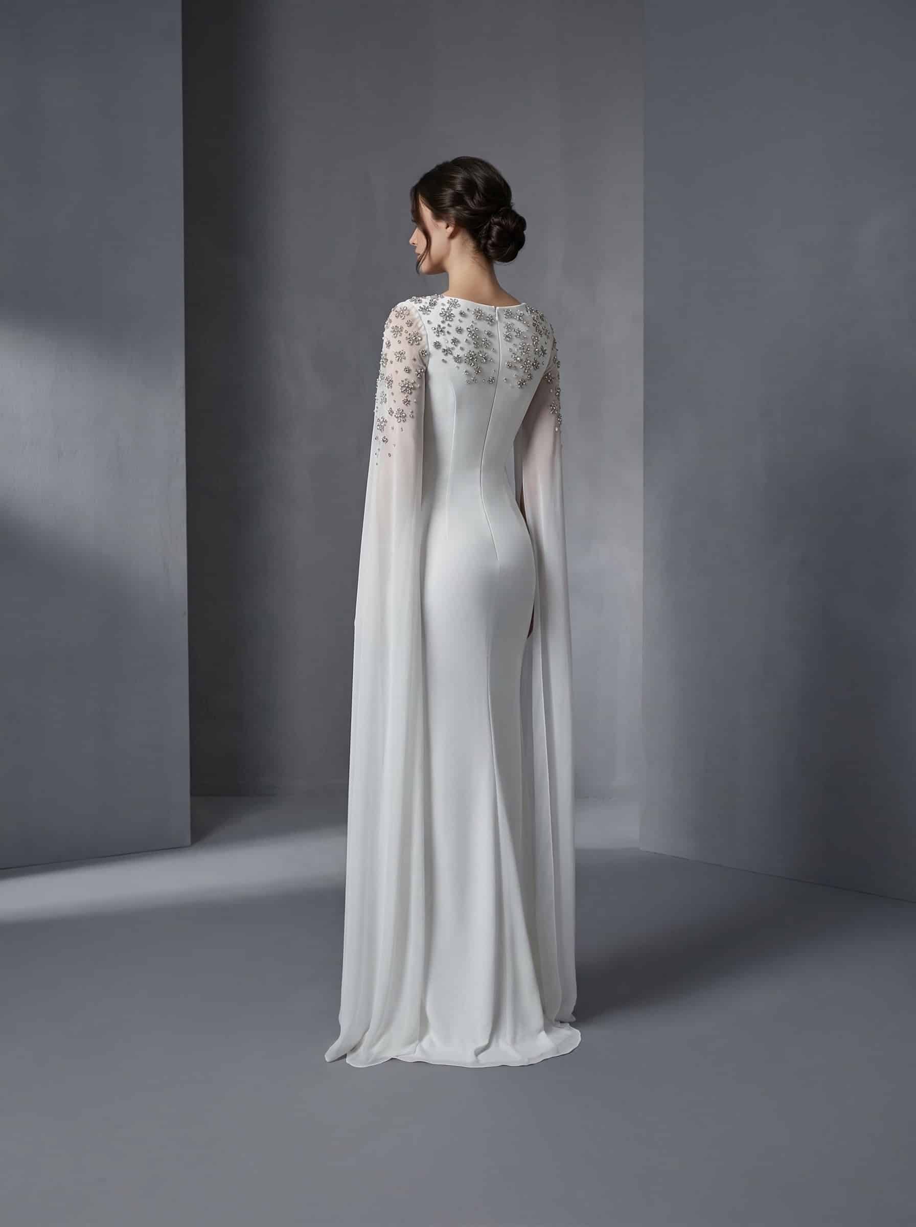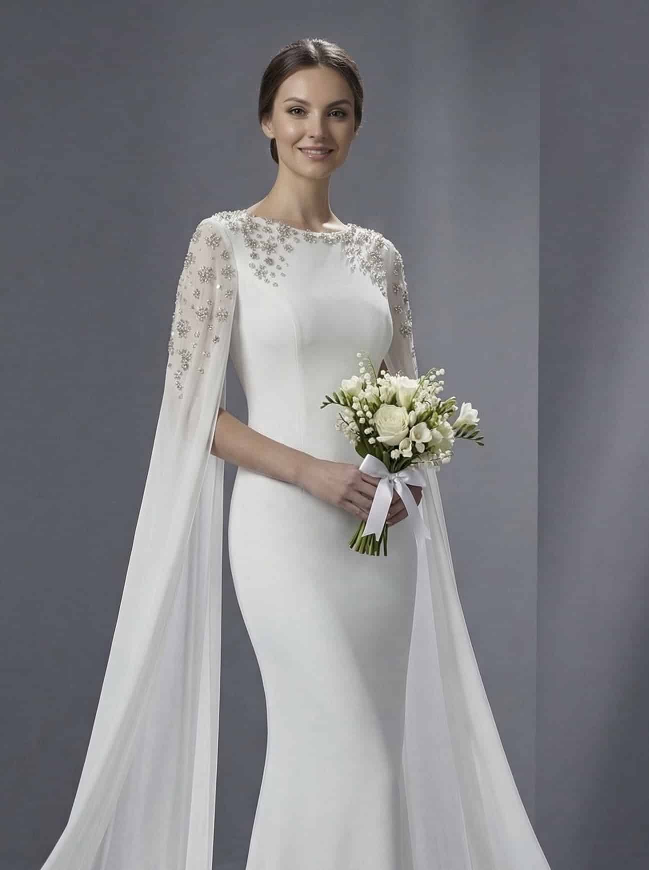 Облегающий крой «русалка» или «годе», который плавно расширяется к низу, подчеркивая фигуру. Платье выполнено из плотного, матового материала (вероятно, креп или тяжелый атлас), что придает образу лаконичность и благородство. Главная особенность — длинные струящиеся рукава-кейпы, которые заменяют традиционную фату и создают эффект шлейфа при движении. Лиф и плечи украшены объемной вышивкой, кристаллами и жемчугом в виде цветочных мотивов, что добавляет наряду блеска. Сдержанный вырез «лодочка», который акцентирует внимание на шее и лице.