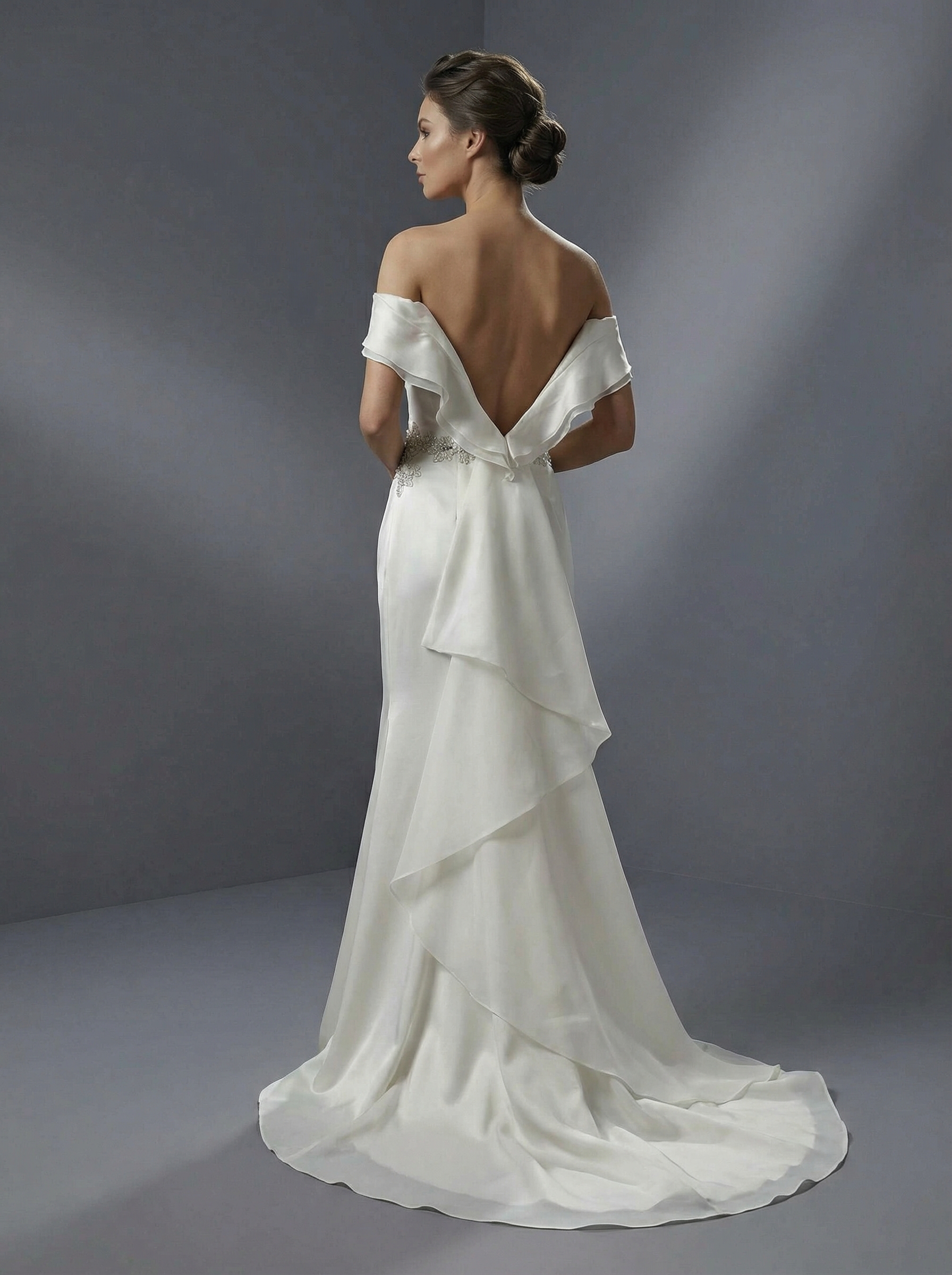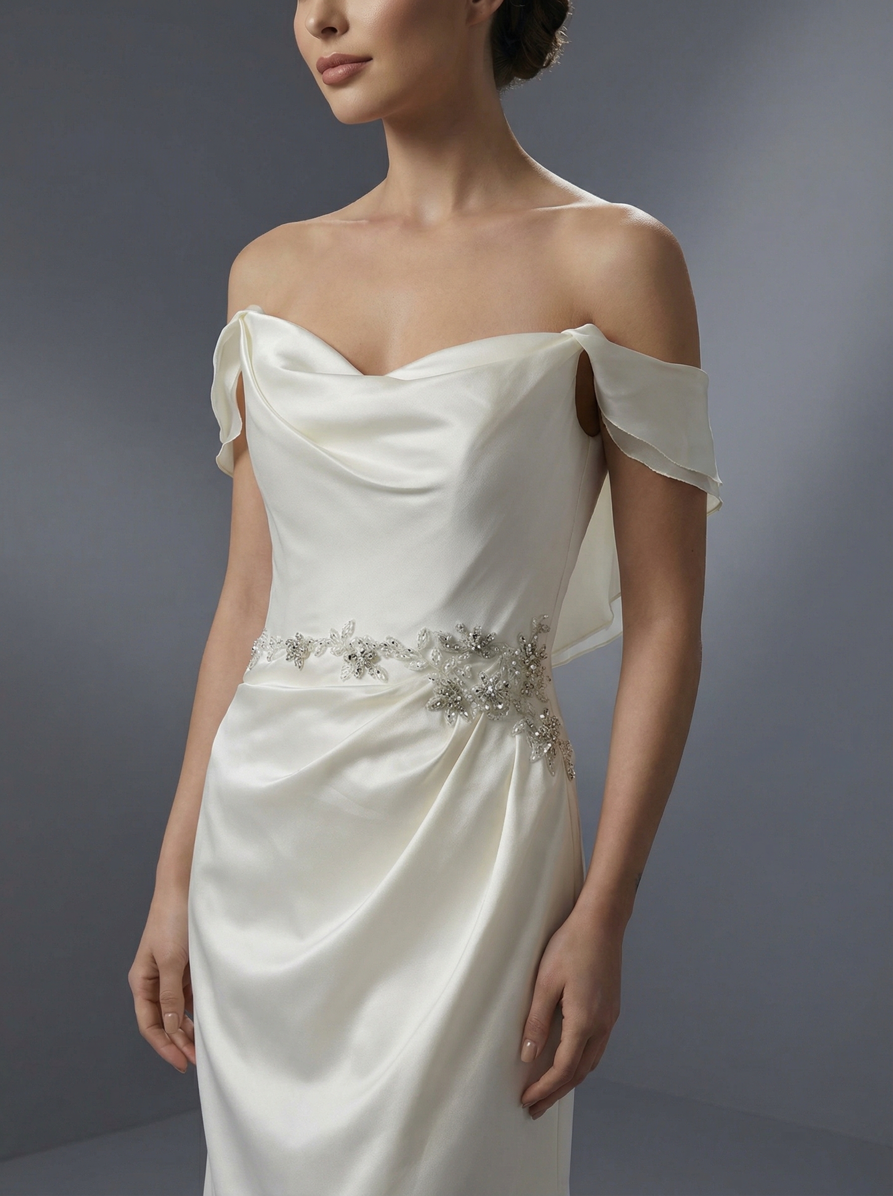 Модель имеет прямой крой или мягкий А-силуэт, который аккуратно подчеркивает фигуру и переходит в небольшой изящный шлейф. Верх платья оформлен в стиле «кармен» со спущенными плечиками, которые акцентируют внимание на линии ключиц. Горловина дополнена мягкой драпировкой в форме «качели». Главным украшением служит изящная вышивка стразами и бисером на талии, напоминающая тонкий сверкающий поясок. Этот элемент визуально разделяет лиф и юбку, подчеркивая талию.