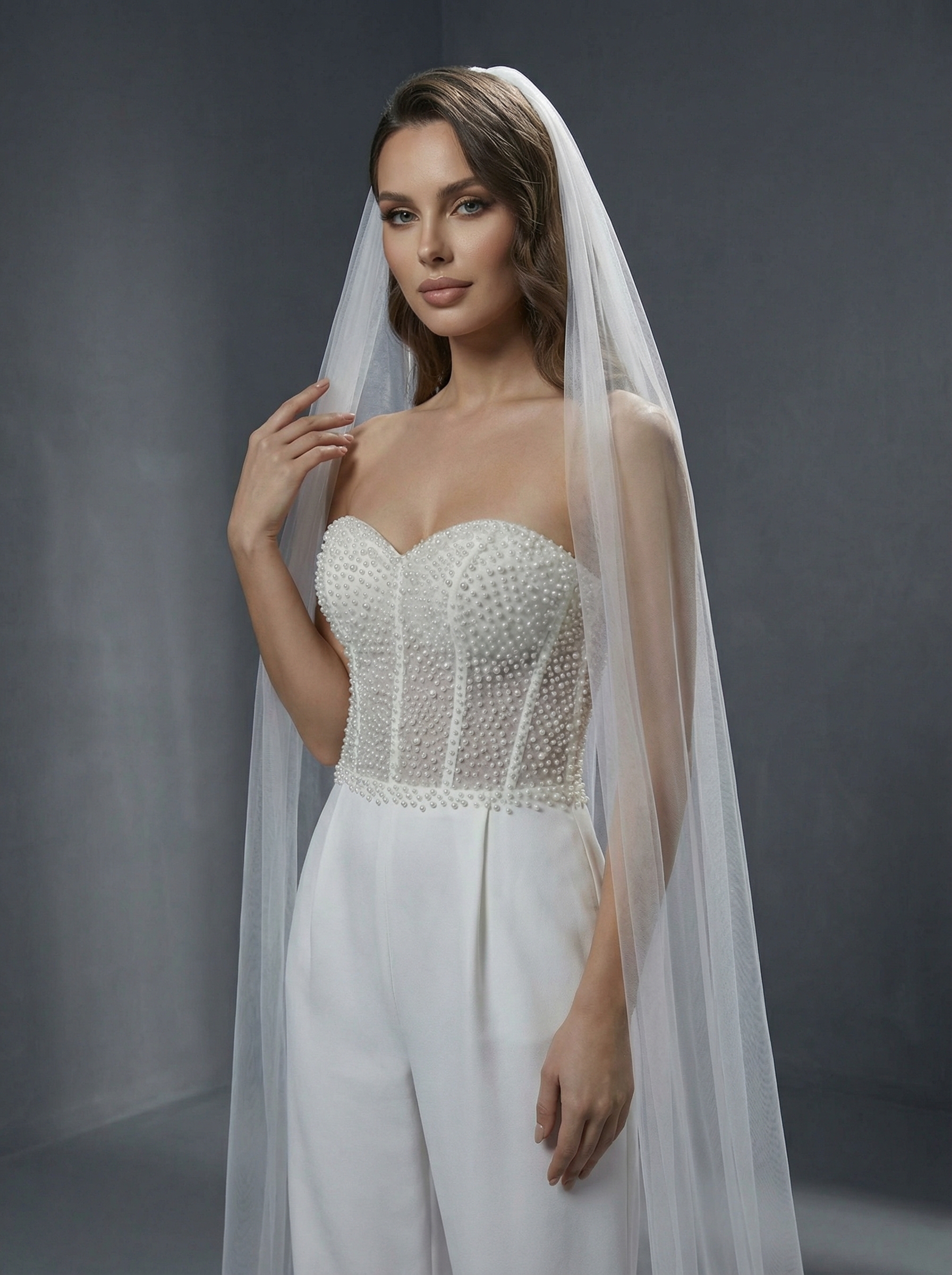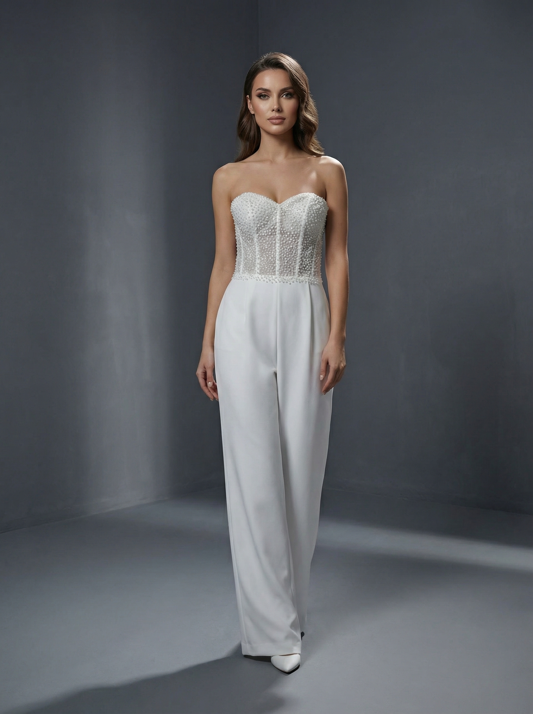 Лиф выполнен из полупрозрачной ткани с вертикальными косточками и щедро декорирован кристаллами, создающими изысканное мерцание, а брюки выполнены из плотного матового материала. Модель представляет собой современный минимализм с акцентом на фактурный декор верха и чистоту линий низа. Комбинезон подчеркивает индивидуальность невесты и обеспечивают комфорт на протяжении всего торжества.