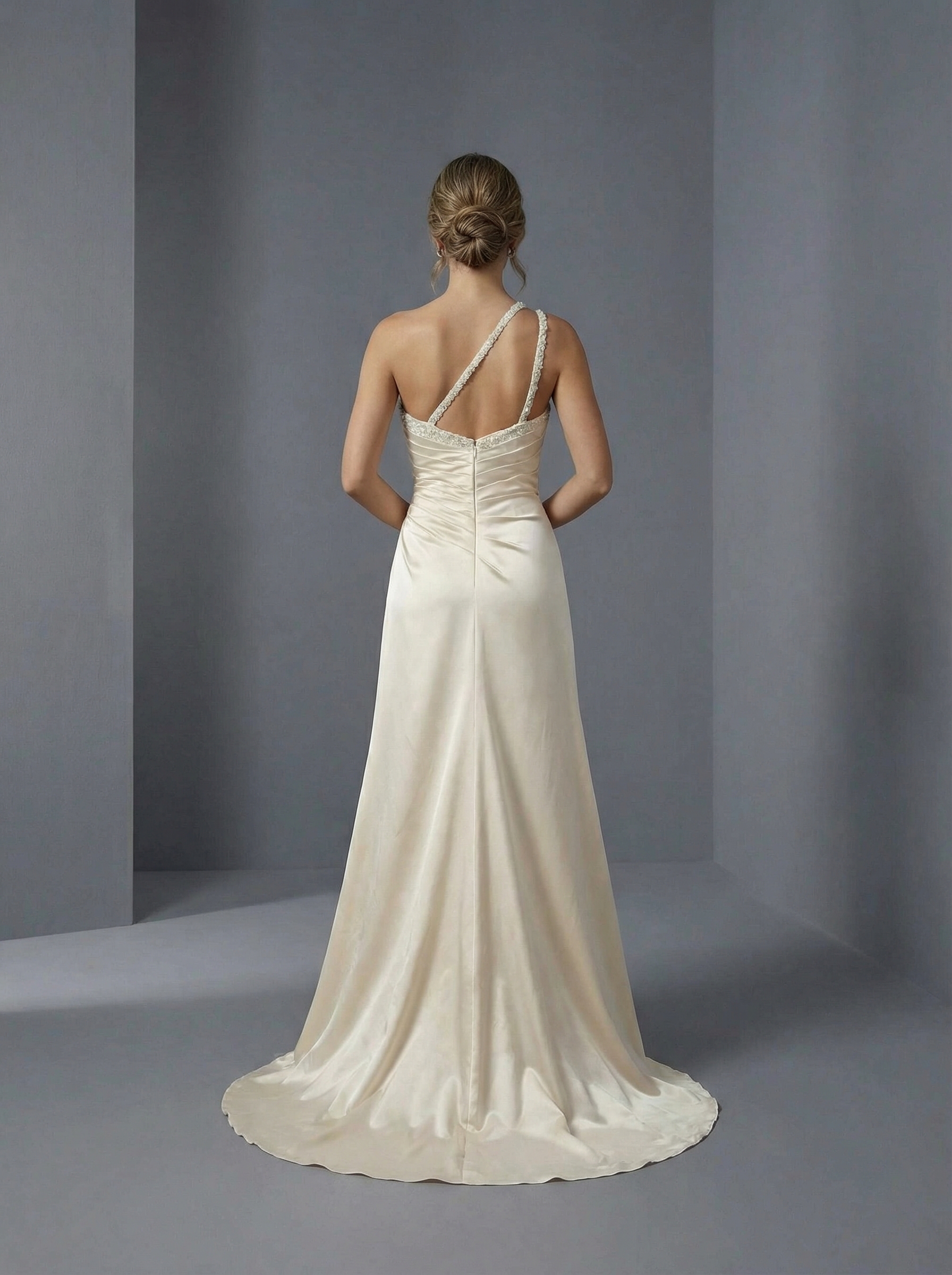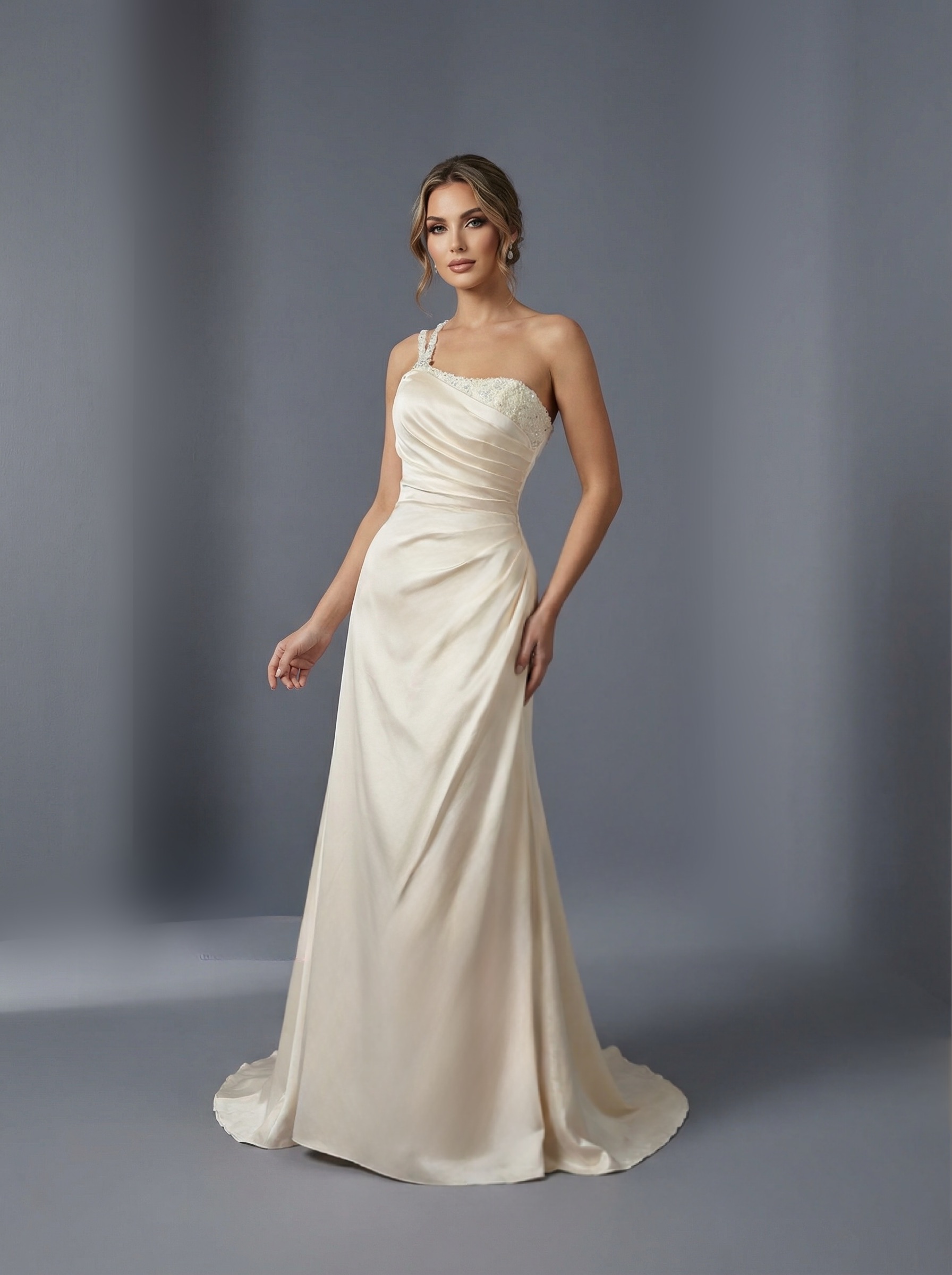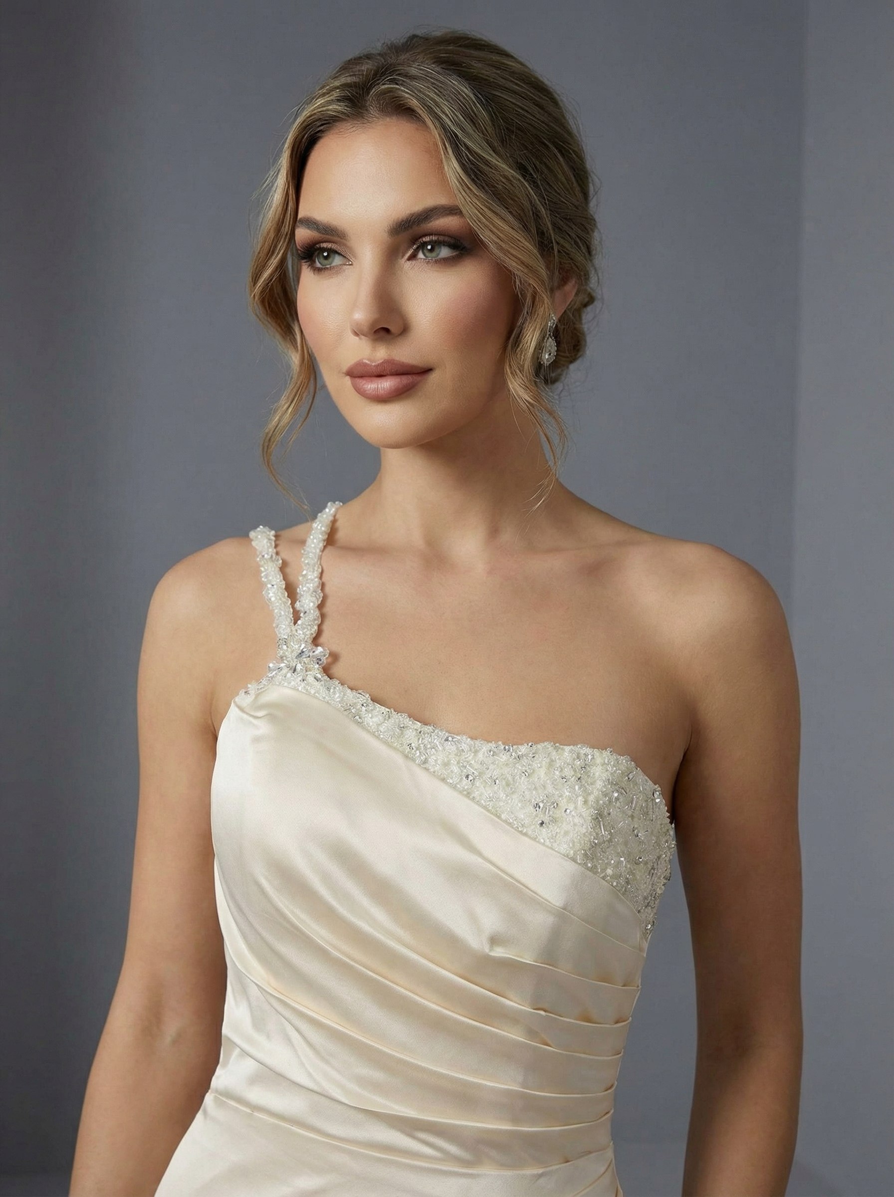 Акцентом платья является асимметричный верх на одно плечо. Лиф украшен изысканной драпировкой и тонкой кружевной отделкой по линии декольте, что добавляет образу фактурности. Классический оттенок айвори (слоновая кость), который выглядит мягче и богаче чистого белого цвета.