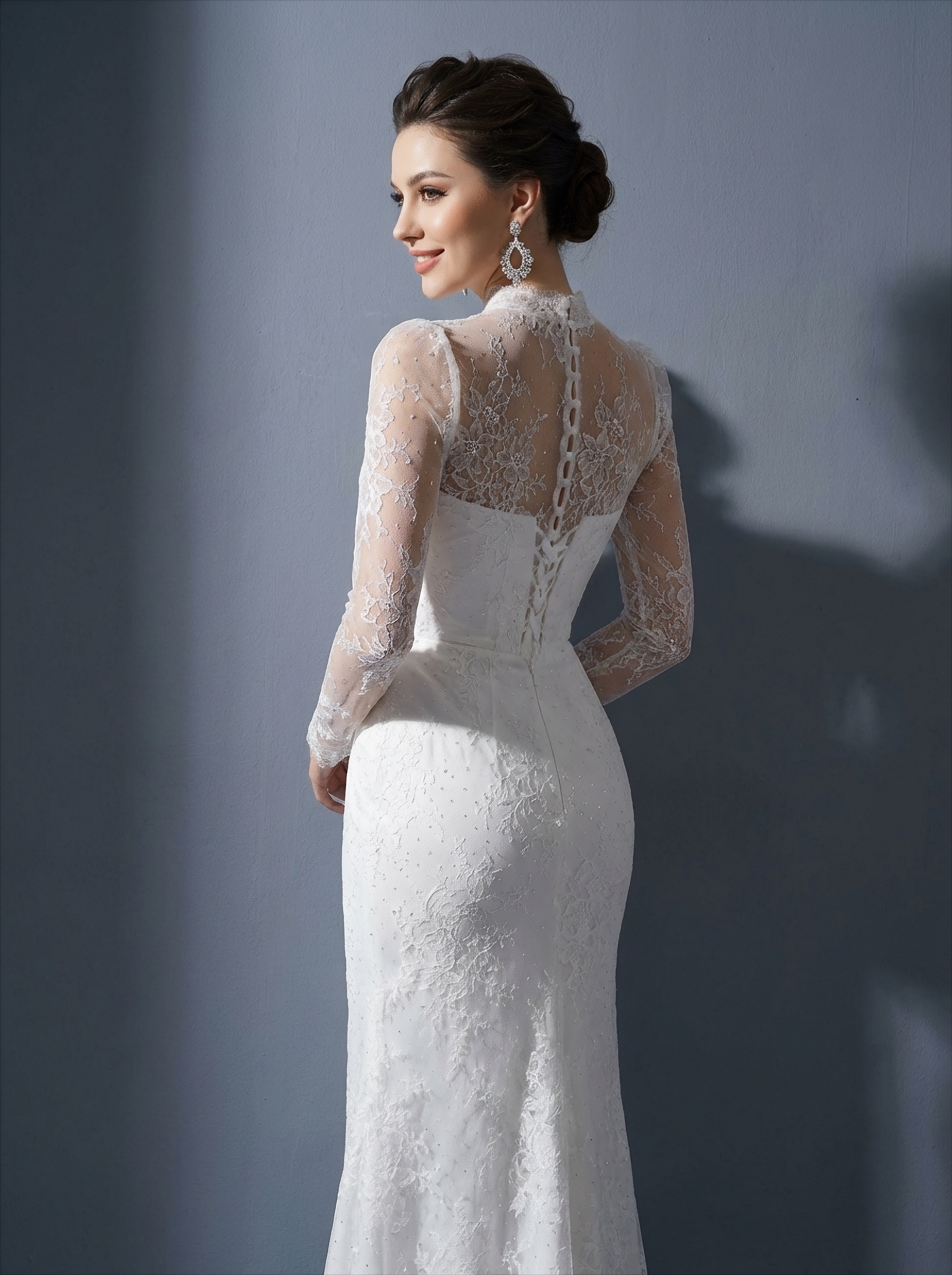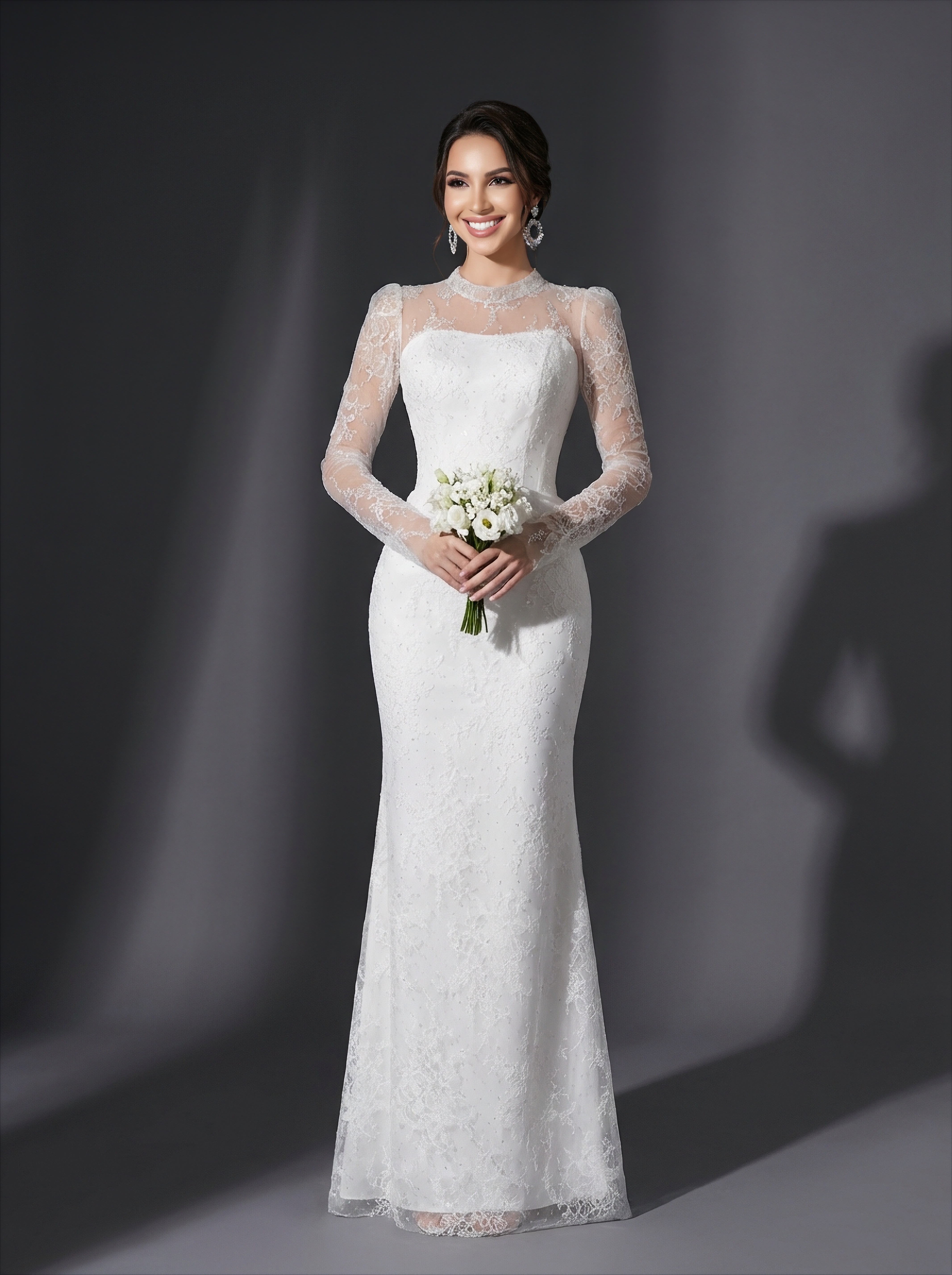Белое свадебное платье-трансформер имеет облегающую основу и дополняется съемной пышной юбкой-накидкой, которая надевается поверх, создавая второй образ. Приталенный корсет с высоким воротником-стойкой и длинными прозрачными кружевными рукавами сочетают в себе элегантность и современную функциональность.