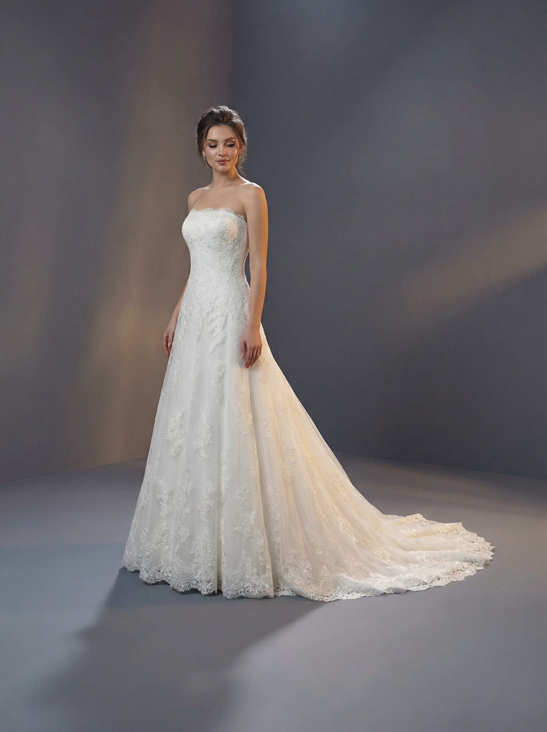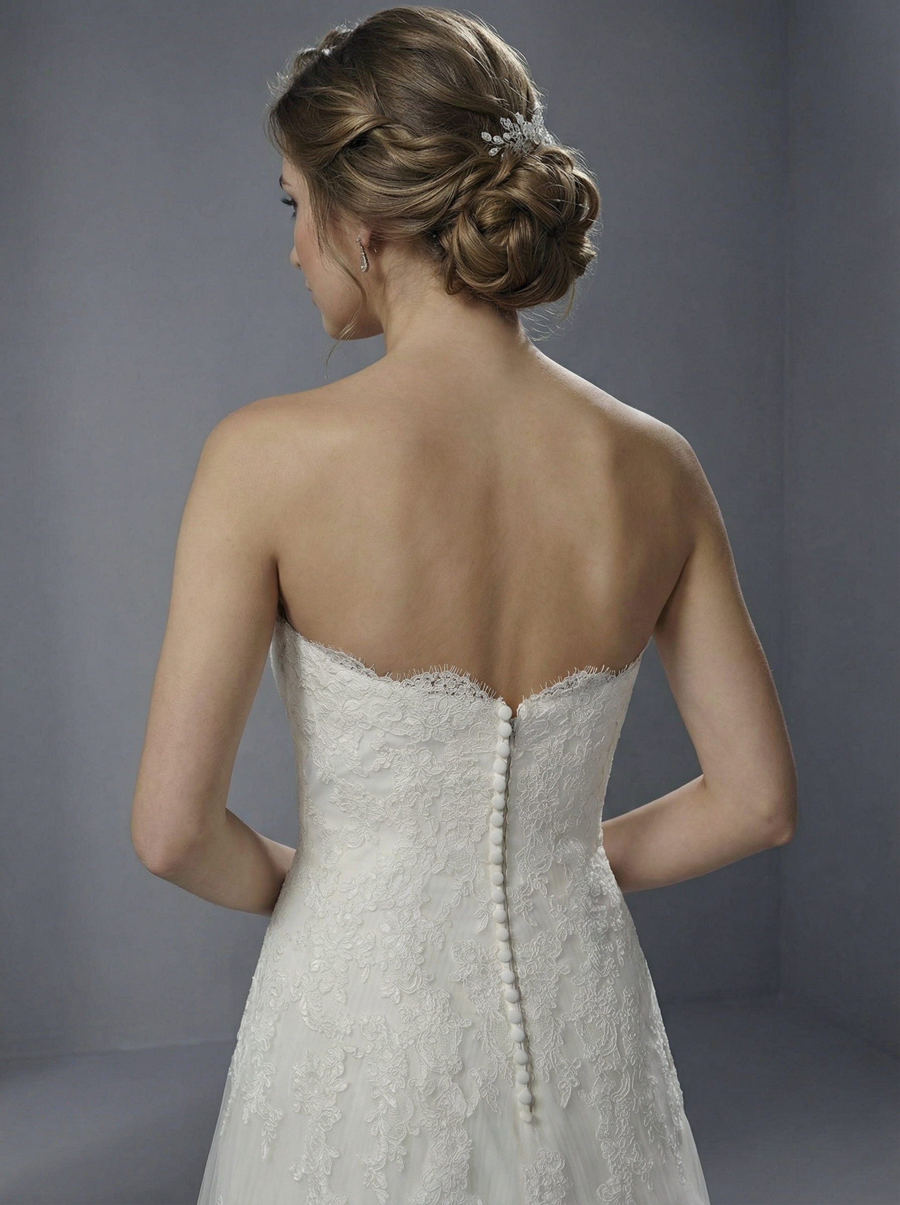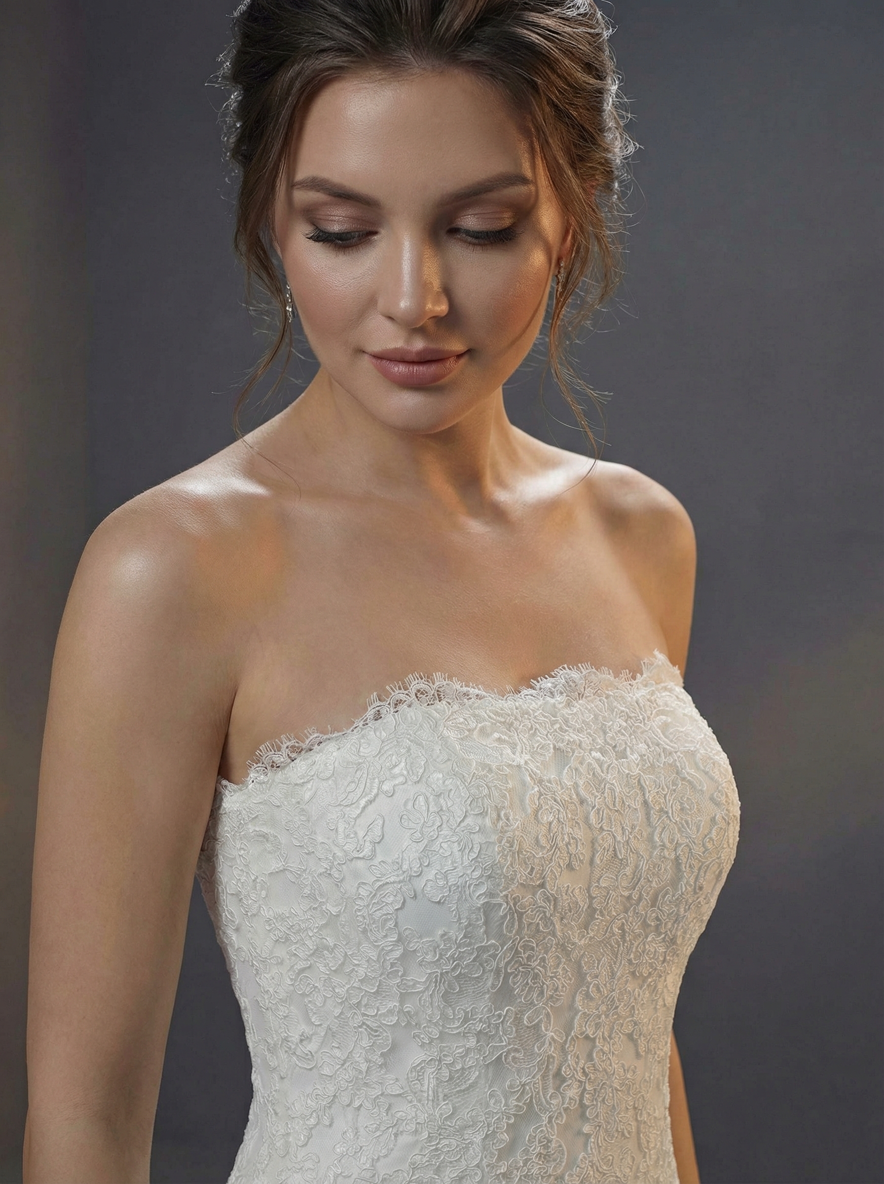 Свадебное платье А-силуэта с открытым корсетным верхом без бретелей и прямым вырезом