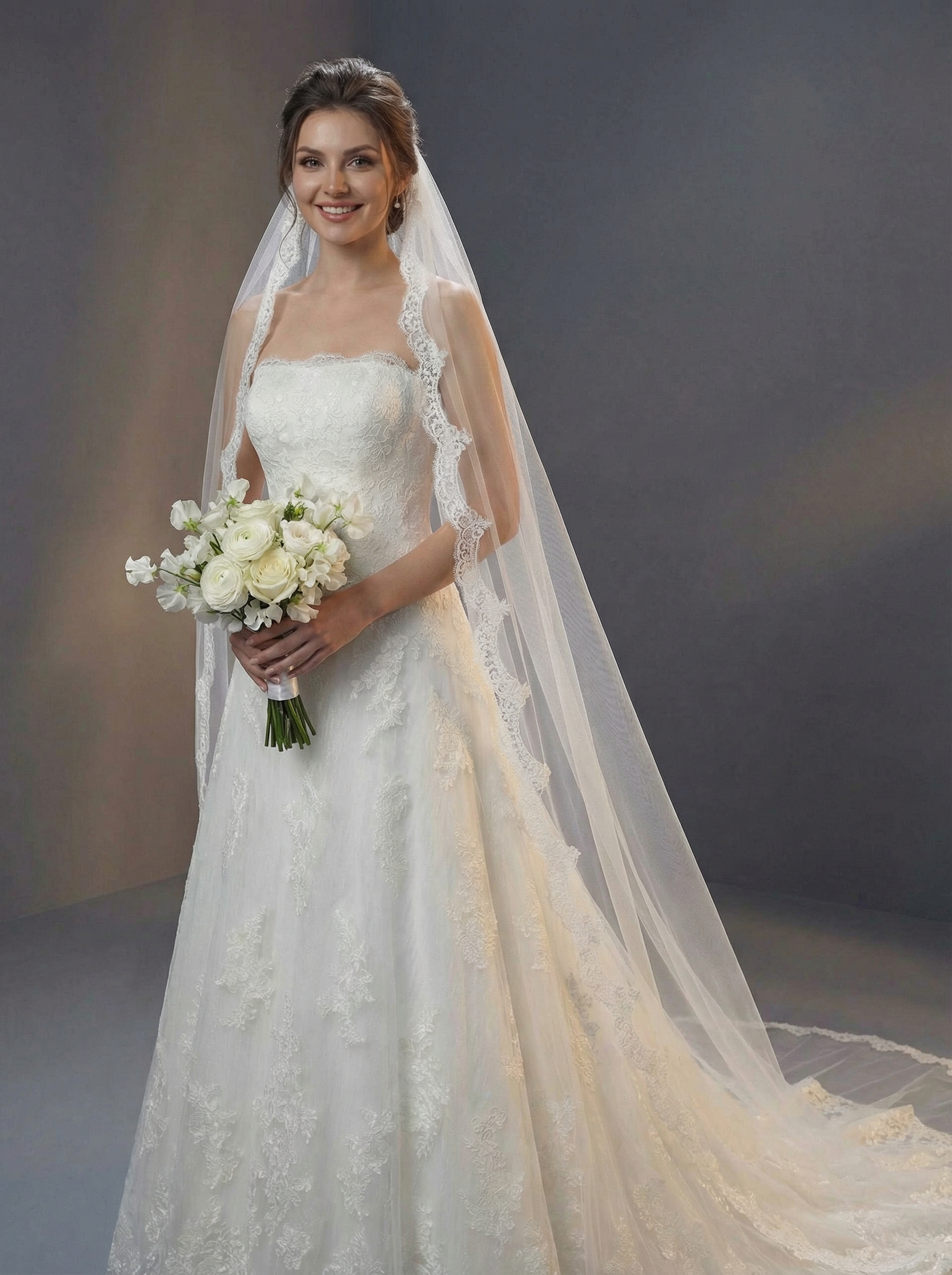 Платье полностью выполнено из изысканного фактурного кружева (гипюра) с цветочными мотивами. Кружевное полотно покрывает весь наряд, придавая ему нежный и романтичный вид. Длинная и торжественная юбка плавно переходит в аккуратный округлый шлейф, украшенный ажурным краем подола.
