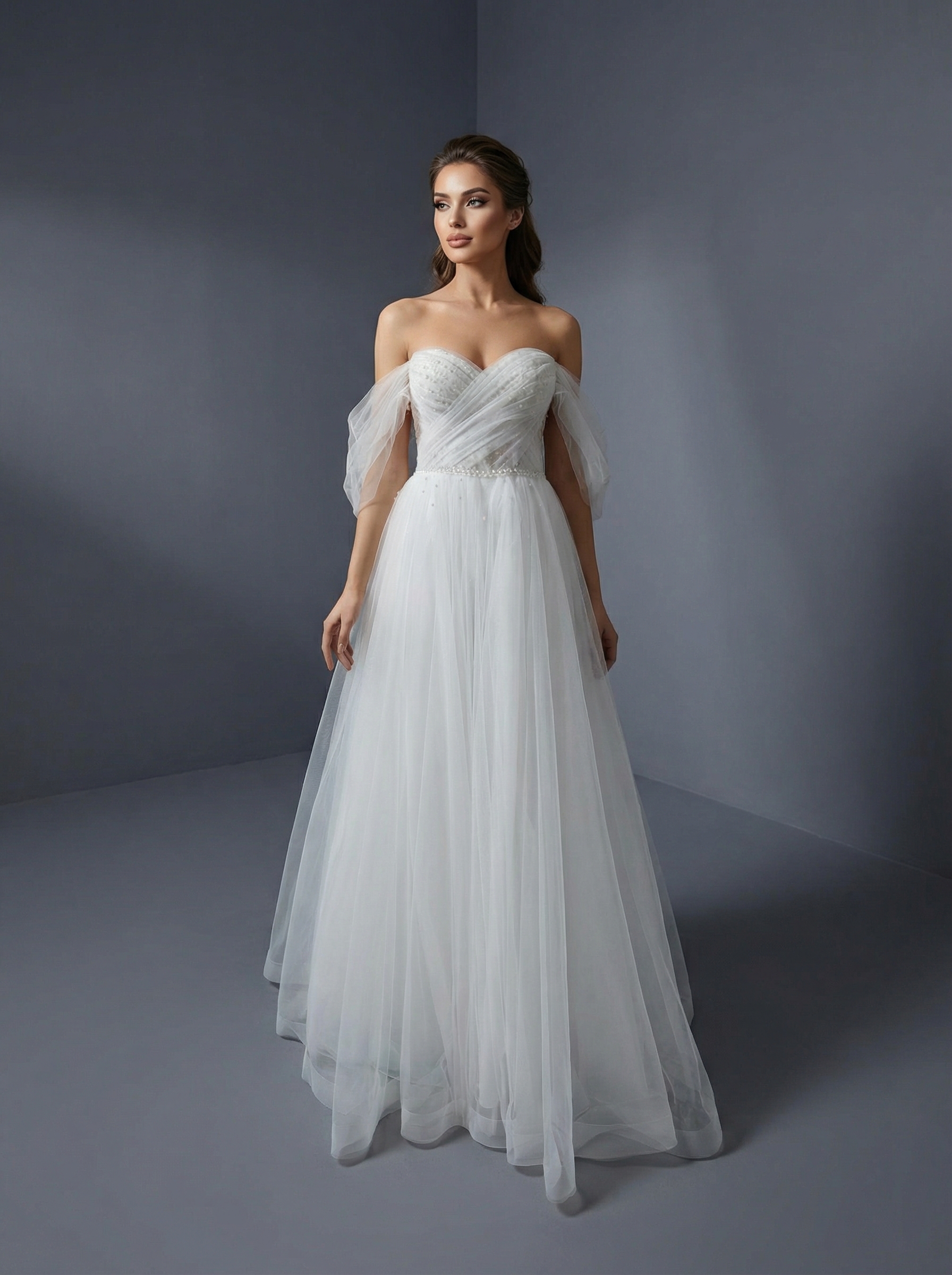 Свадебное платье А-силуэта с открытыми плечами и выразительным вырезом в форме «сердечка»