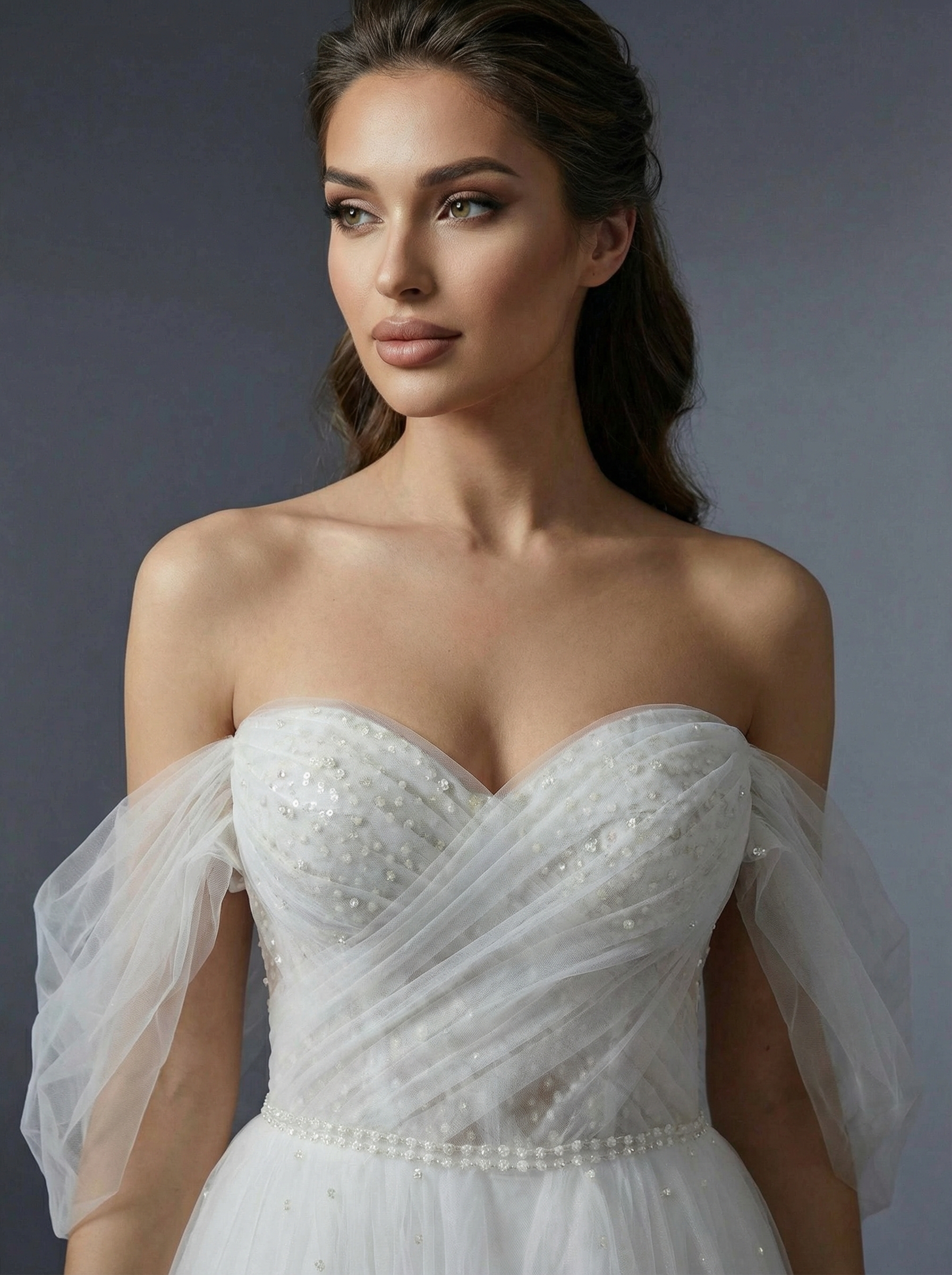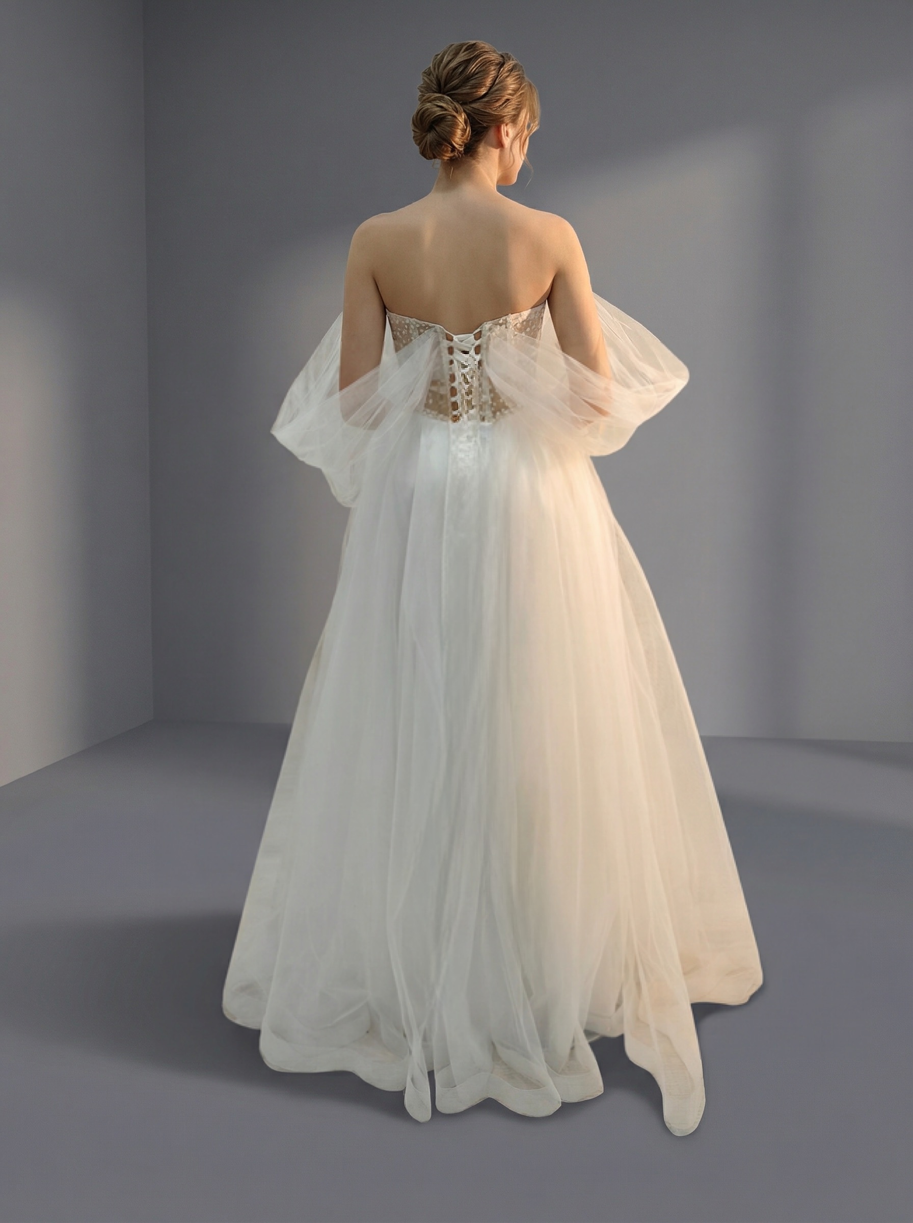 Платье имеет приталенный корсетный лиф и пышную, воздушную юбку, которая плавно расширяется книзу. Такой фасон считается универсальным, так как он выгодно подчеркивает талию. Лиф украшен деликатными драпировками из ткани, которые добавляют образу фактурности и мягкости. Главным акцентом платья являются объемные спущенные рукава-фонарики из прозрачного фатина.