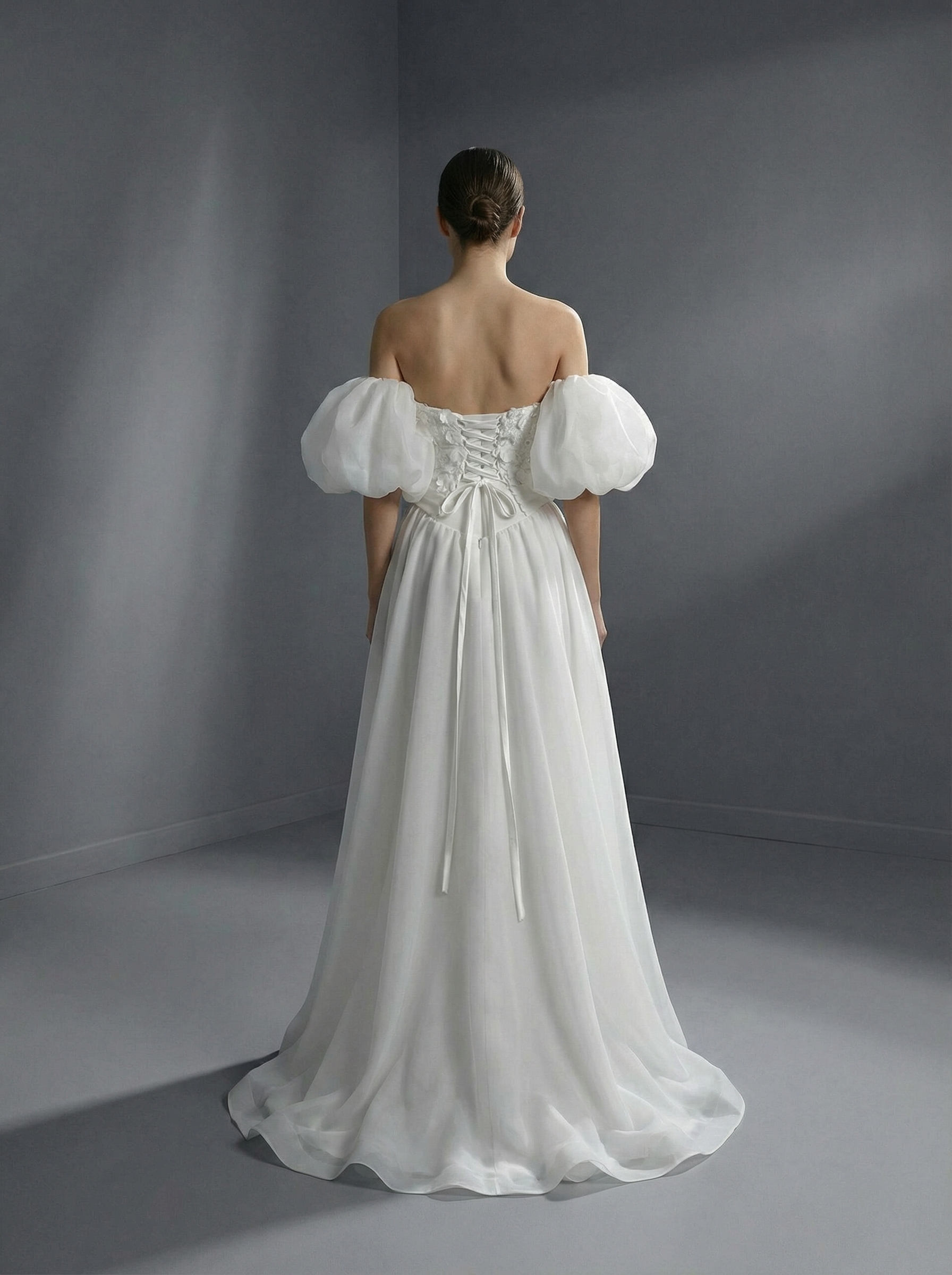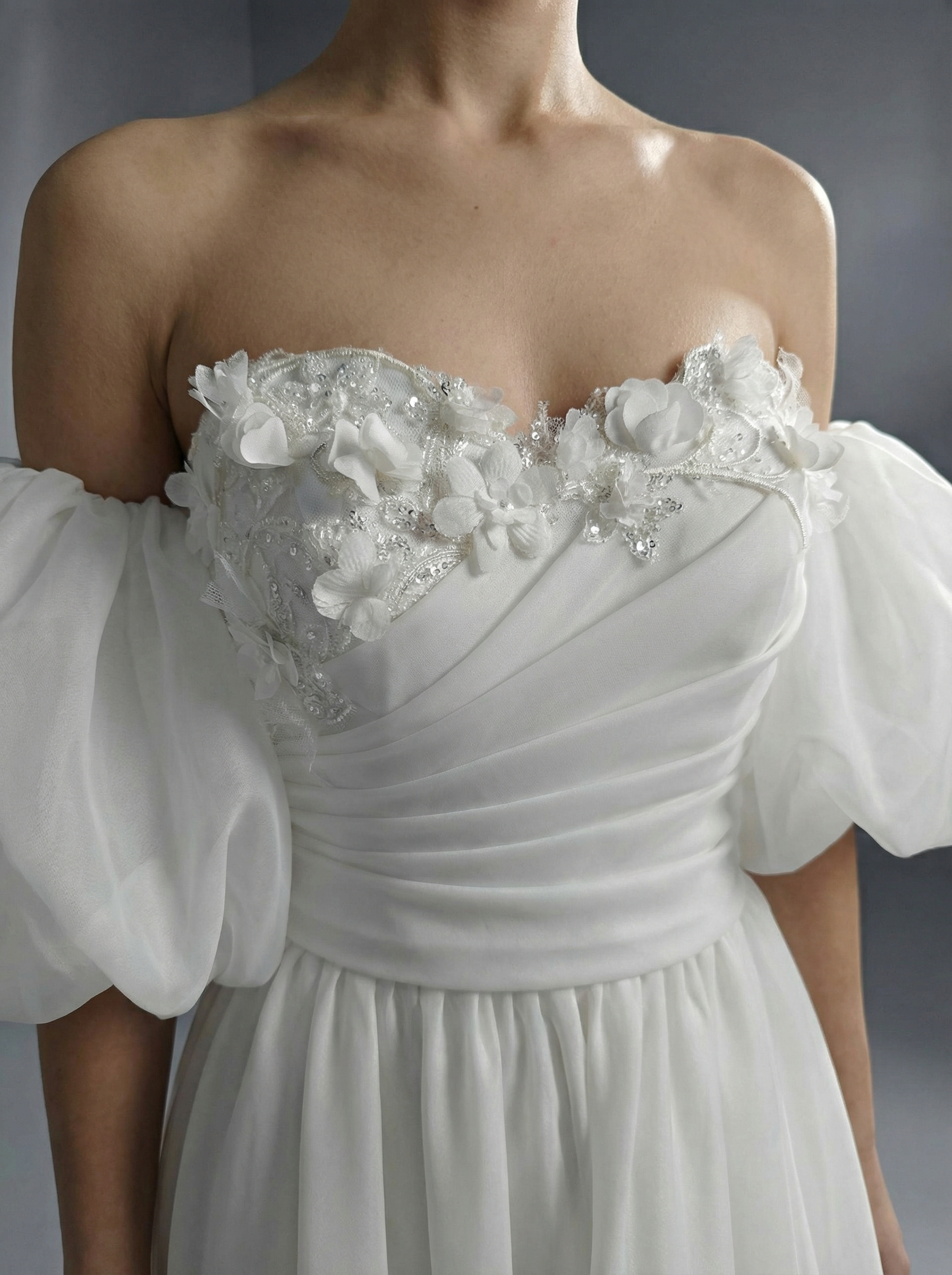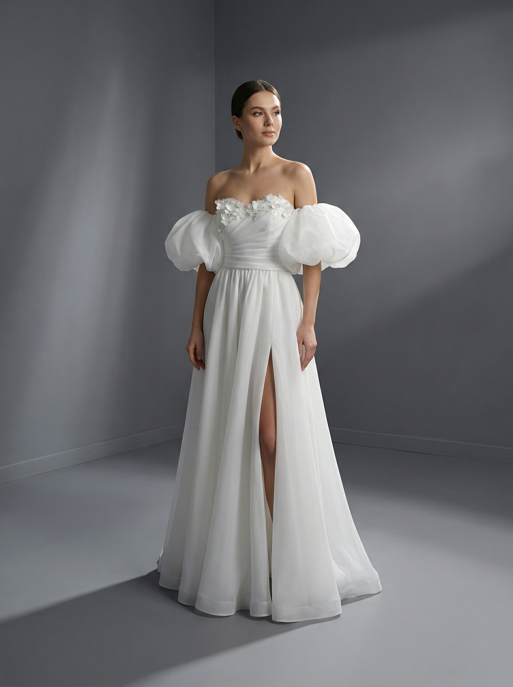 Главным акцентом являются пышные съемные рукава-буфы (фонарики), которые носятся в спущенном варианте, открывая плечи и ключицы. Воздушная юбка выполнена из легкого еврофатина. Спереди на подоле расположен высокий пикантный разрез до бедра, который придает образу смелость и динамику.