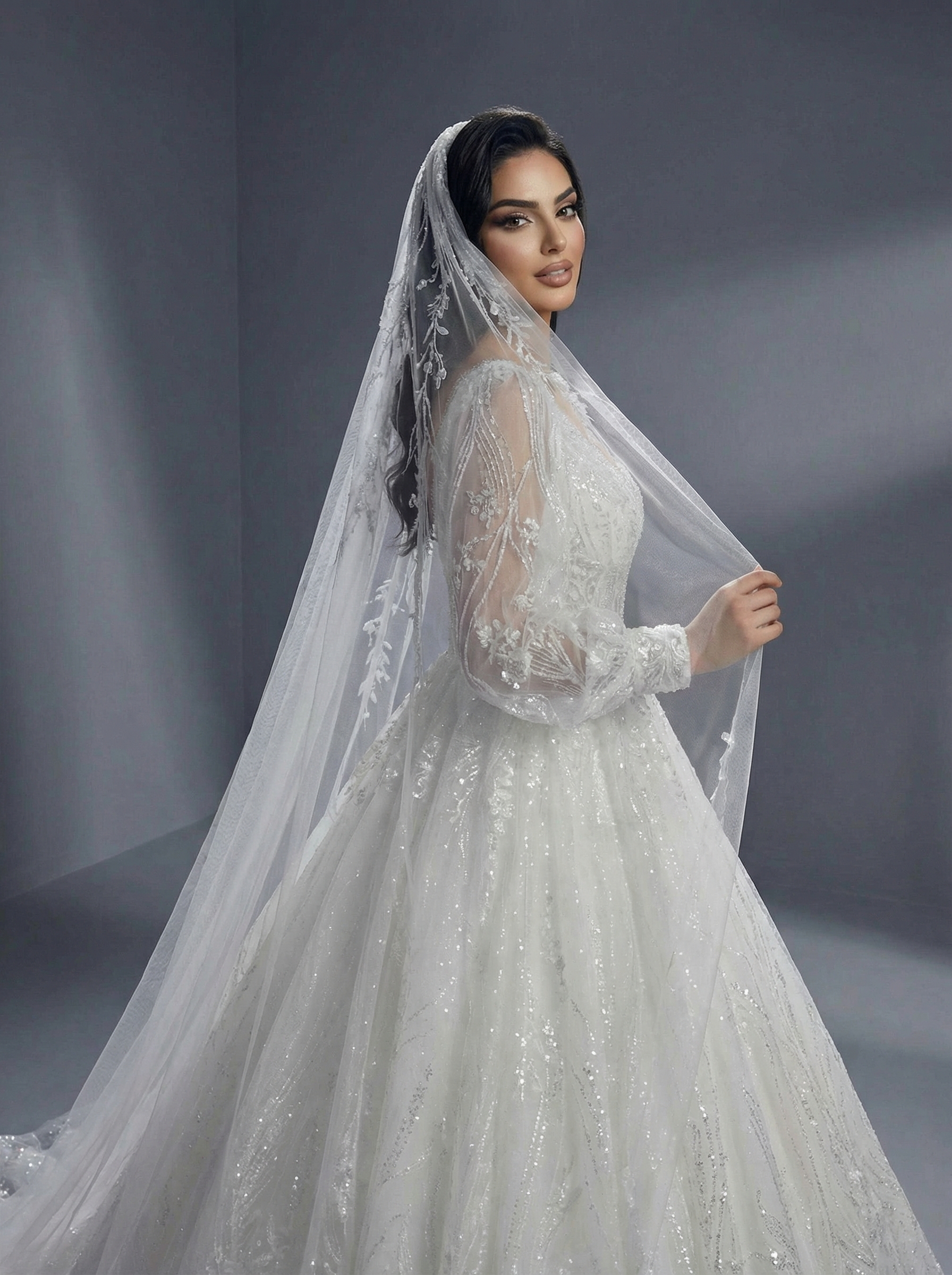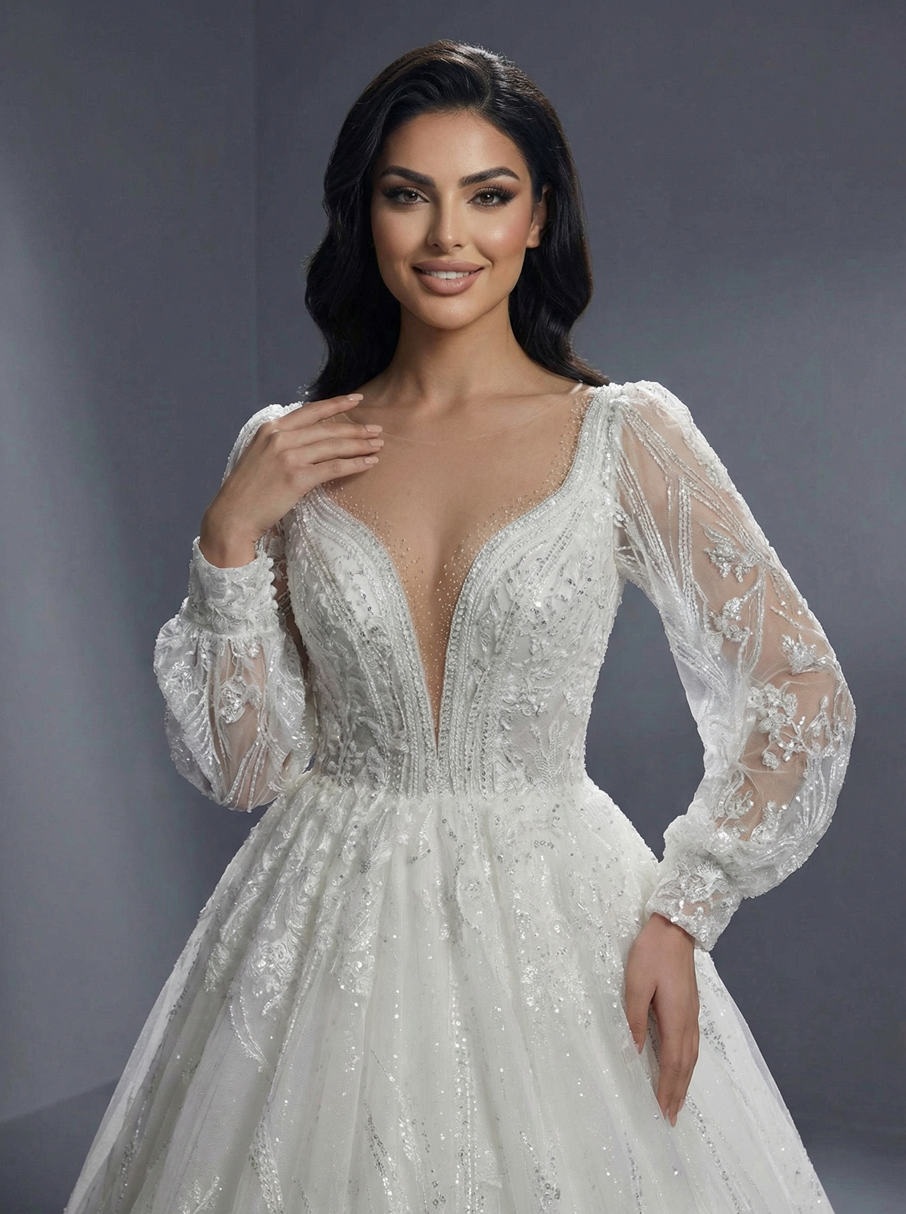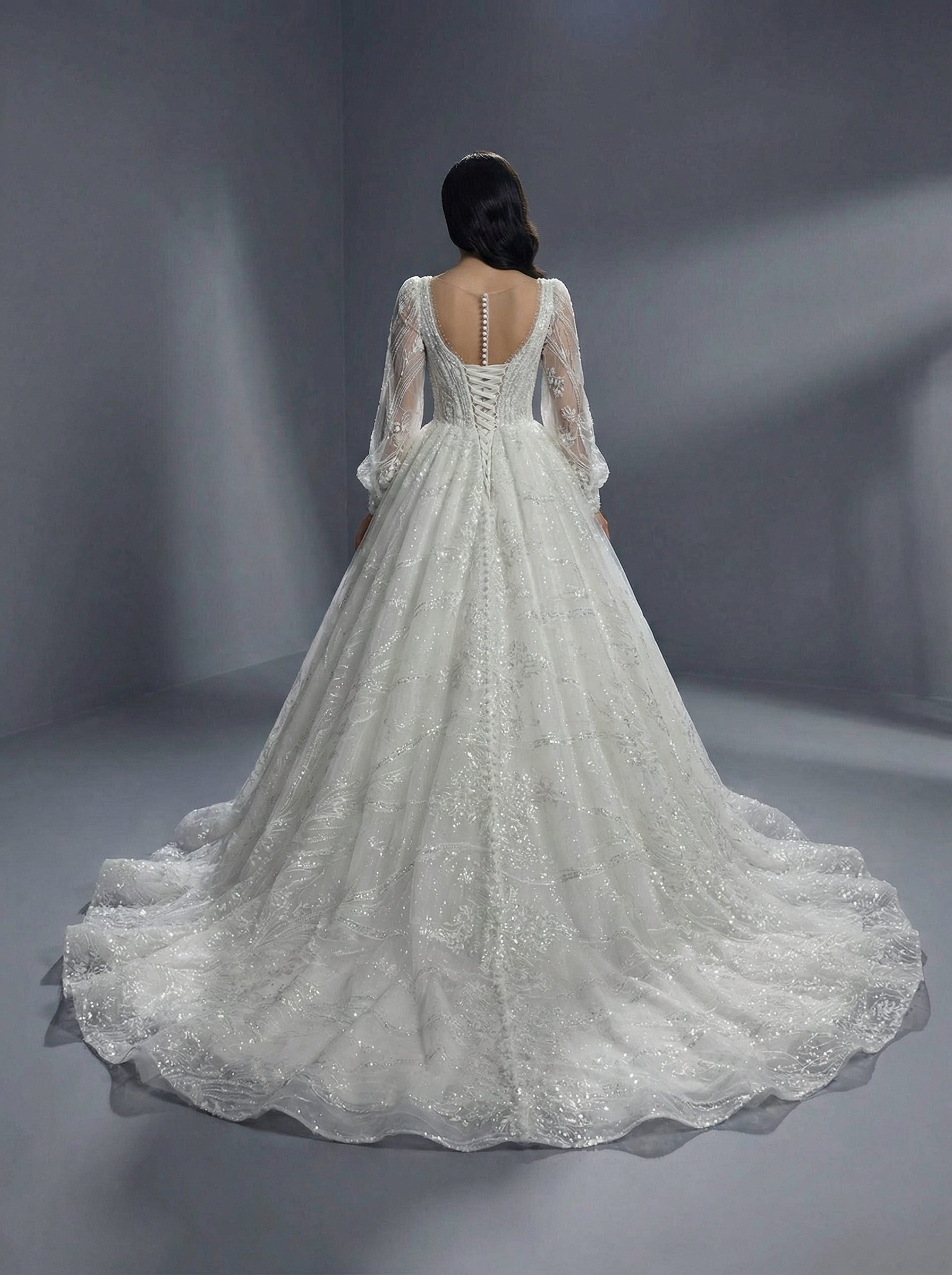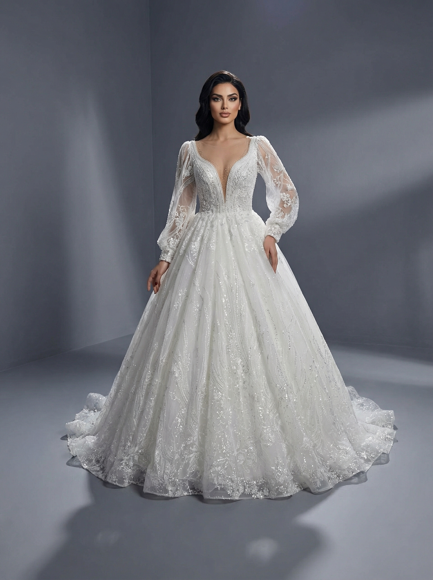 Платье имеет глубокий V-образный вырез (декольте), который визуально удлиняет шею и акцентирует внимание на верхней части наряда. Корсетная основа часто бывает телесного цвета, что создает эффект «голой» кожи под кружевом. Главной особенностью являются длинные, объемные рукава-фонарики (или рукава «бишоп»), выполненные из прозрачного фатина или кружева и собранные на манжетах. Весь наряд щедро декорирован кружевными аппликациями, дополненными блестками (глиттером), пайетками или бусинами, что придает платью интенсивное сияние при свете. В качестве материалов используются фатин, кружево и мерцающая сетка.Пышная юбка плавно расширяется книзу, образуя королевский силуэт, и может переходить в элегантный шлейф.