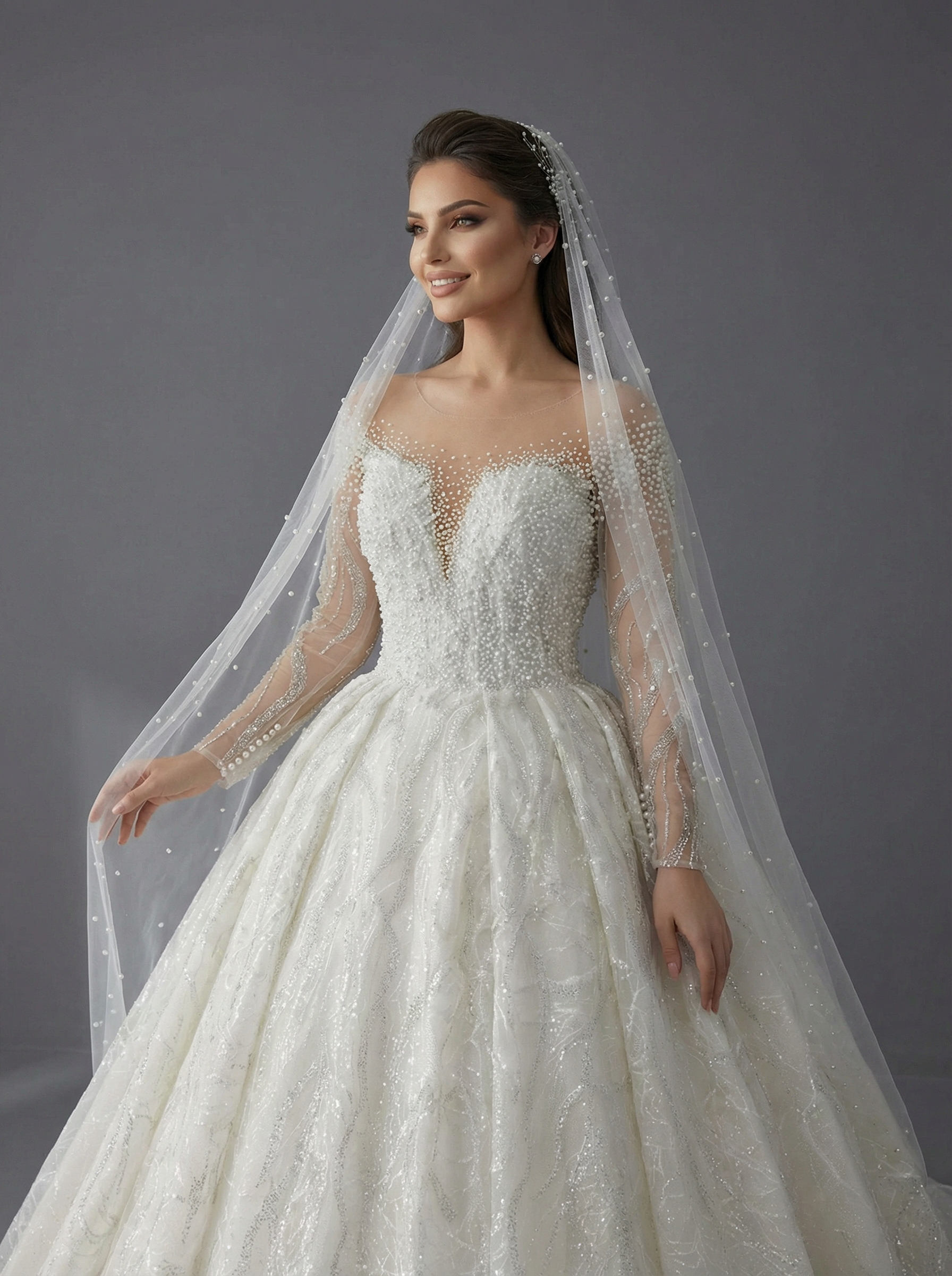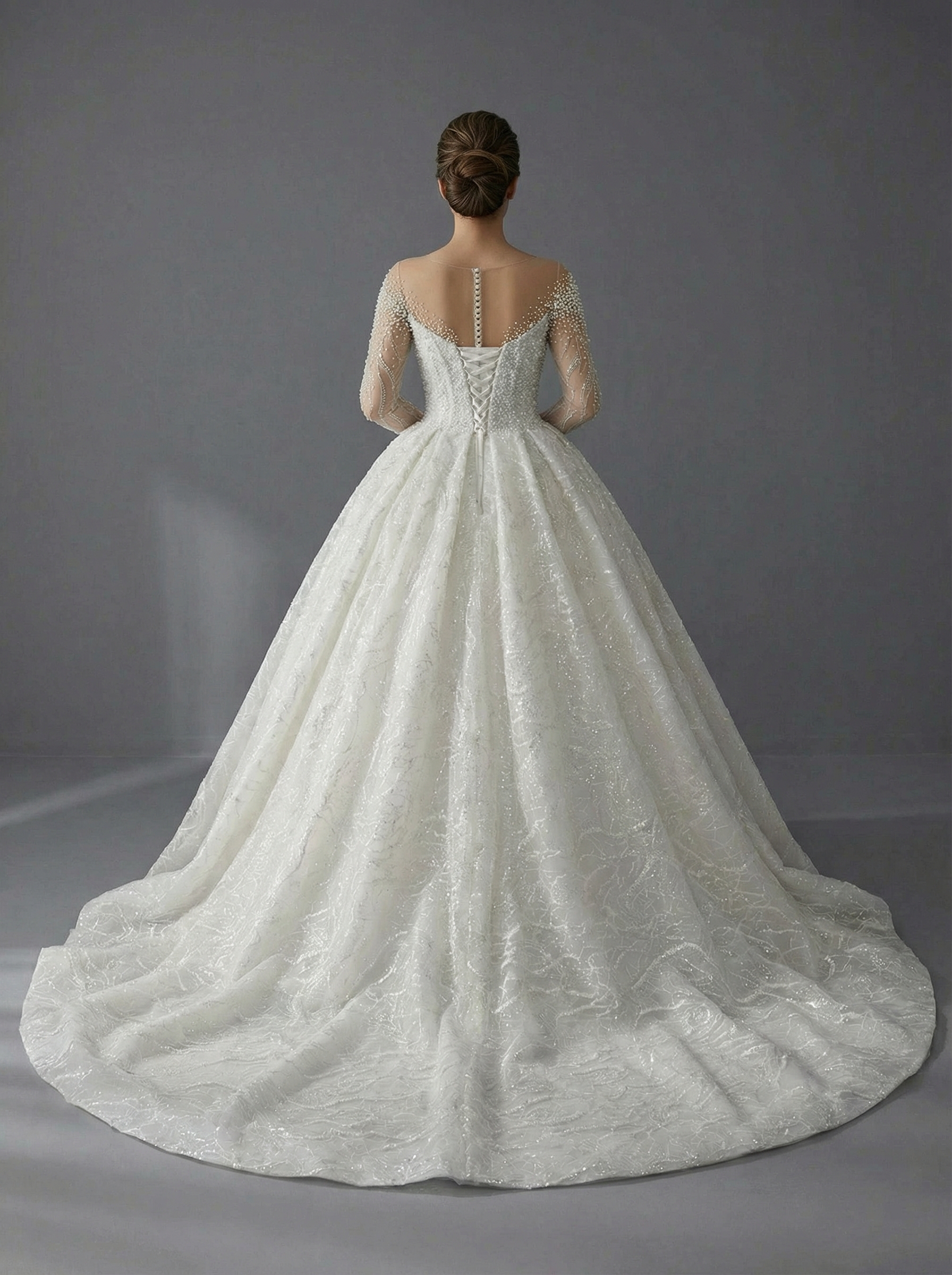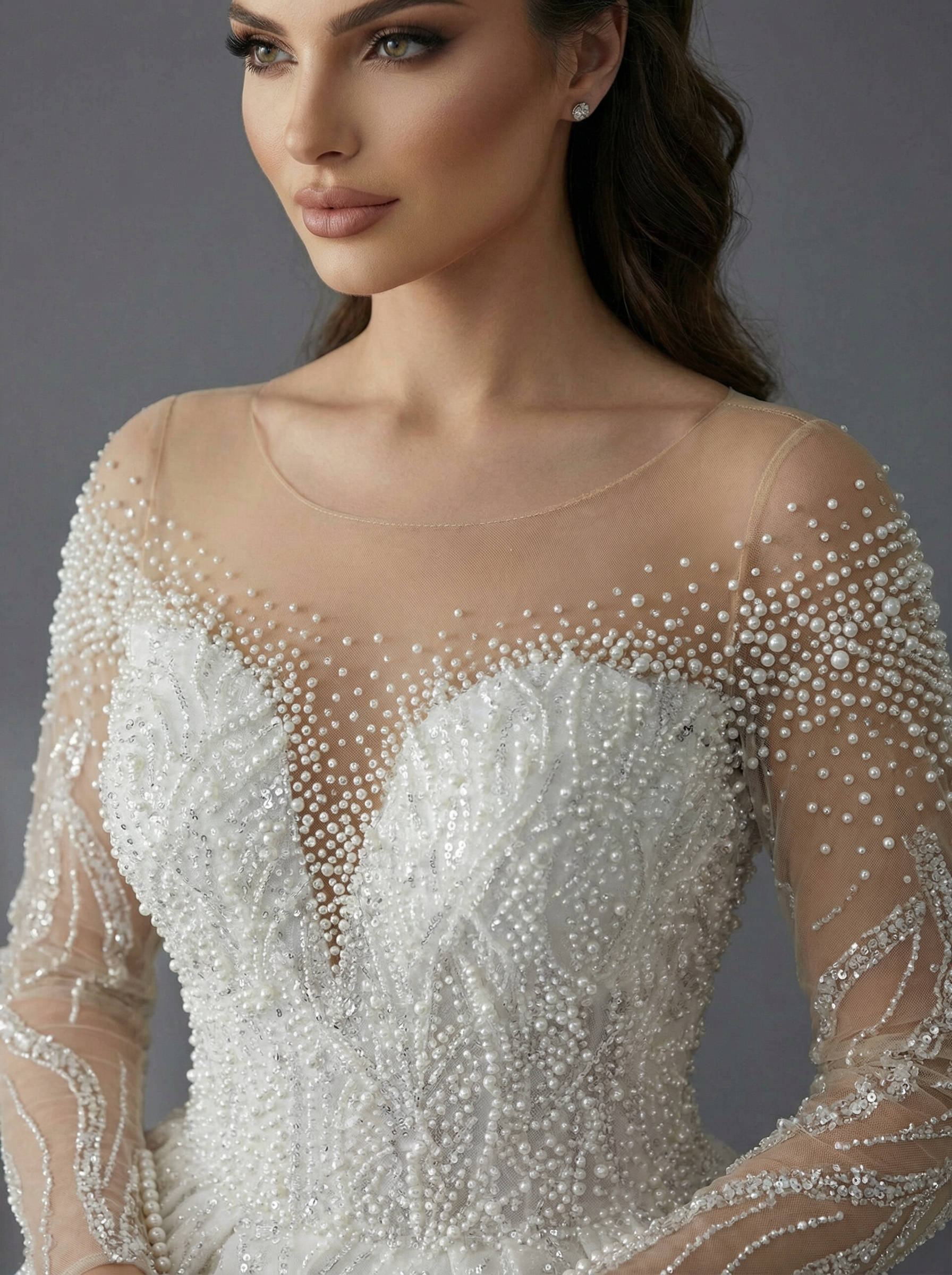 Классическое бальное платье с объемной многослойной юбкой, переходящей в длинный шлейф. Модель имеет акцентированный корсет с глубоким V-образным вырезом, который визуально удлиняет шею. Верхняя часть платья (кокетка и длинные рукава) выполнена из прозрачной сеточки, создающей эффект «голого» тела. Платье обильно украшено вышивкой, бисером и пайетками. Особое внимание привлекает россыпь жемчуга или бусин на плечах и груди, которая плавно переходит в узоры на рукавах и юбке. Изделие выполнено из блестящих материалов (возможно, органза или фатин с глиттером), которые создают мерцающий эффект при движении. Цвет платья — классический айвори (слоновая кость).