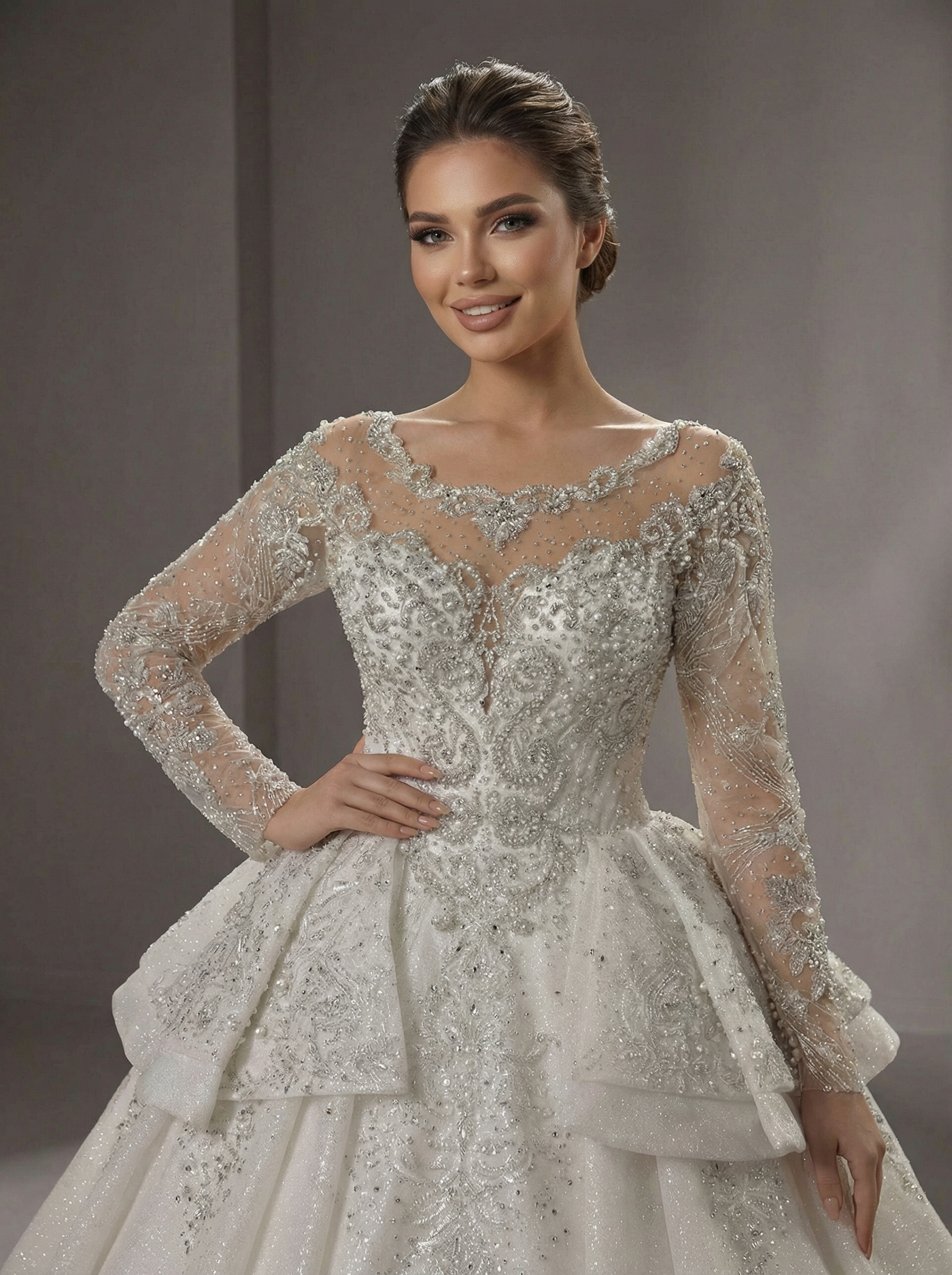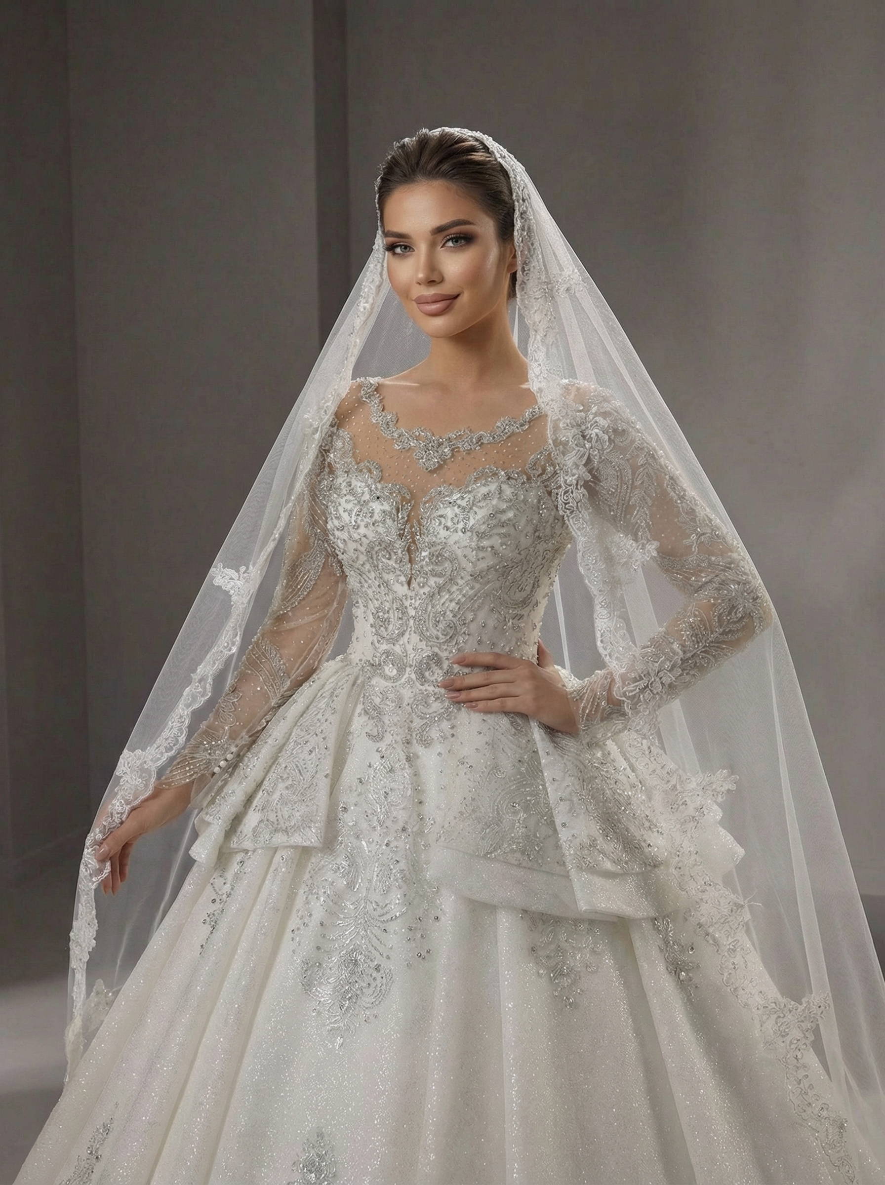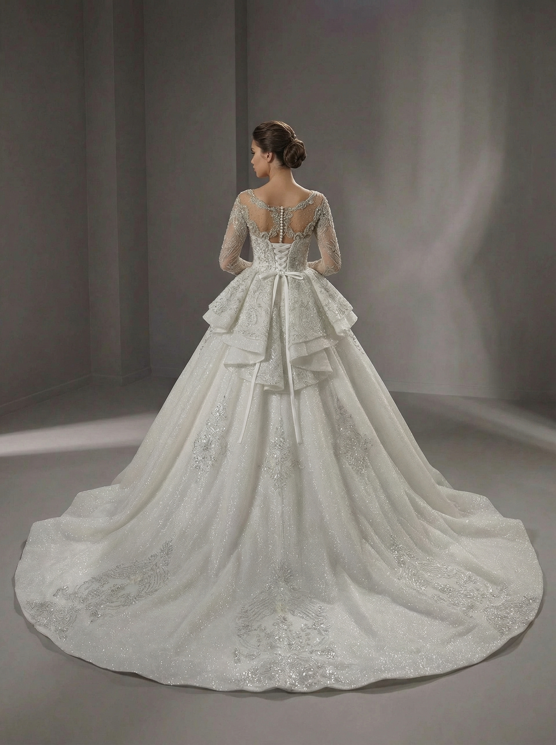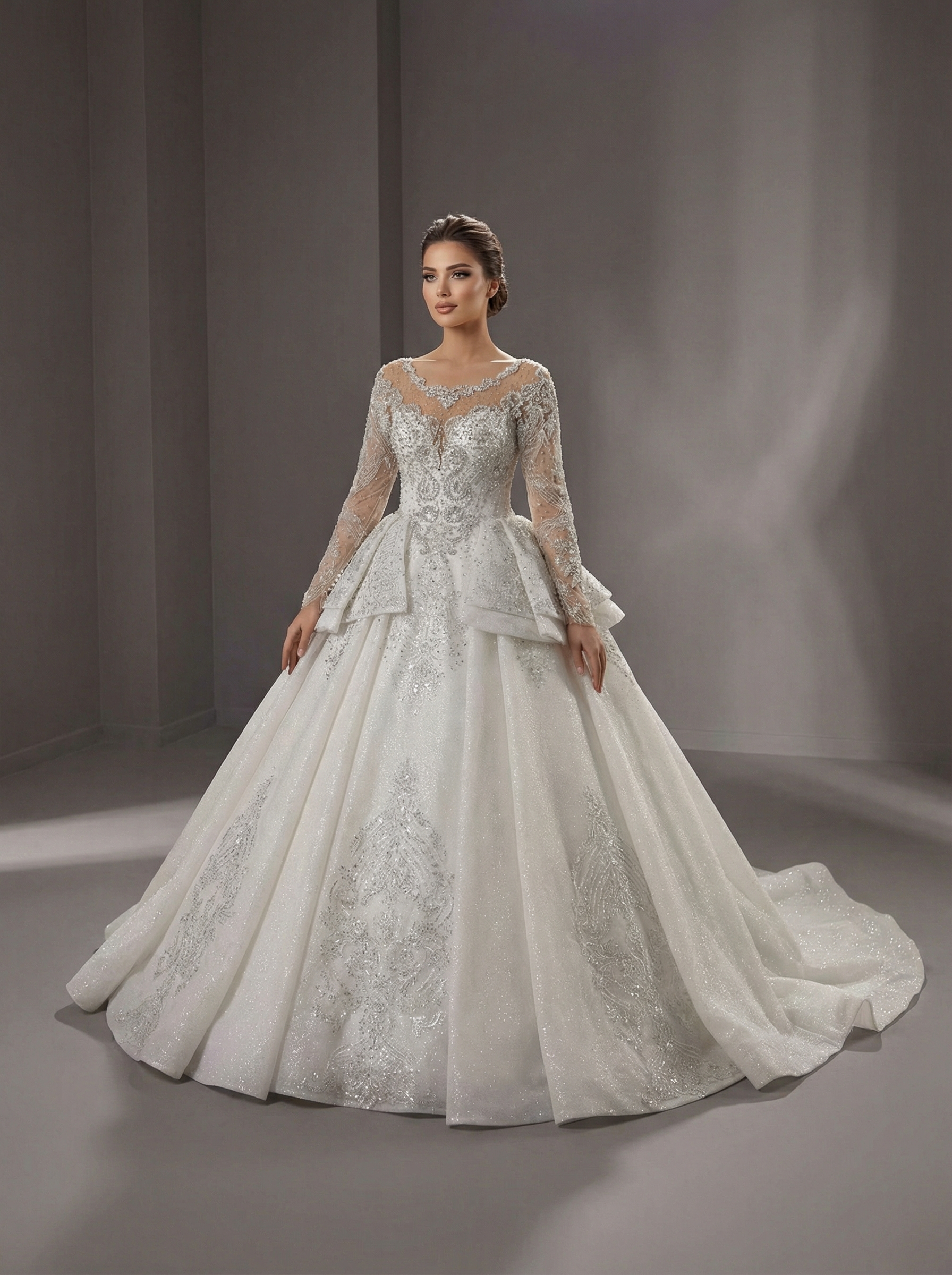 Классическое бальное платье (ball gown) с пышной юбкой, переходящей в длинный, торжественный шлейф. Облегающий верх с изящным круглым вырезом (O-neck) и длинными, прозрачными иллюзорными рукавами. Платье обильно украшено серебристой вышивкой, кружевными аппликациями и сверкающим бисером, что придает ему королевский вид. Линию талии подчеркивает декоративная баска, добавляющая образу дополнительный объем и оригинальность. Такой фасон часто называют «королевским» или «принцессой» благодаря сочетанию богатой отделки и величественного объема.