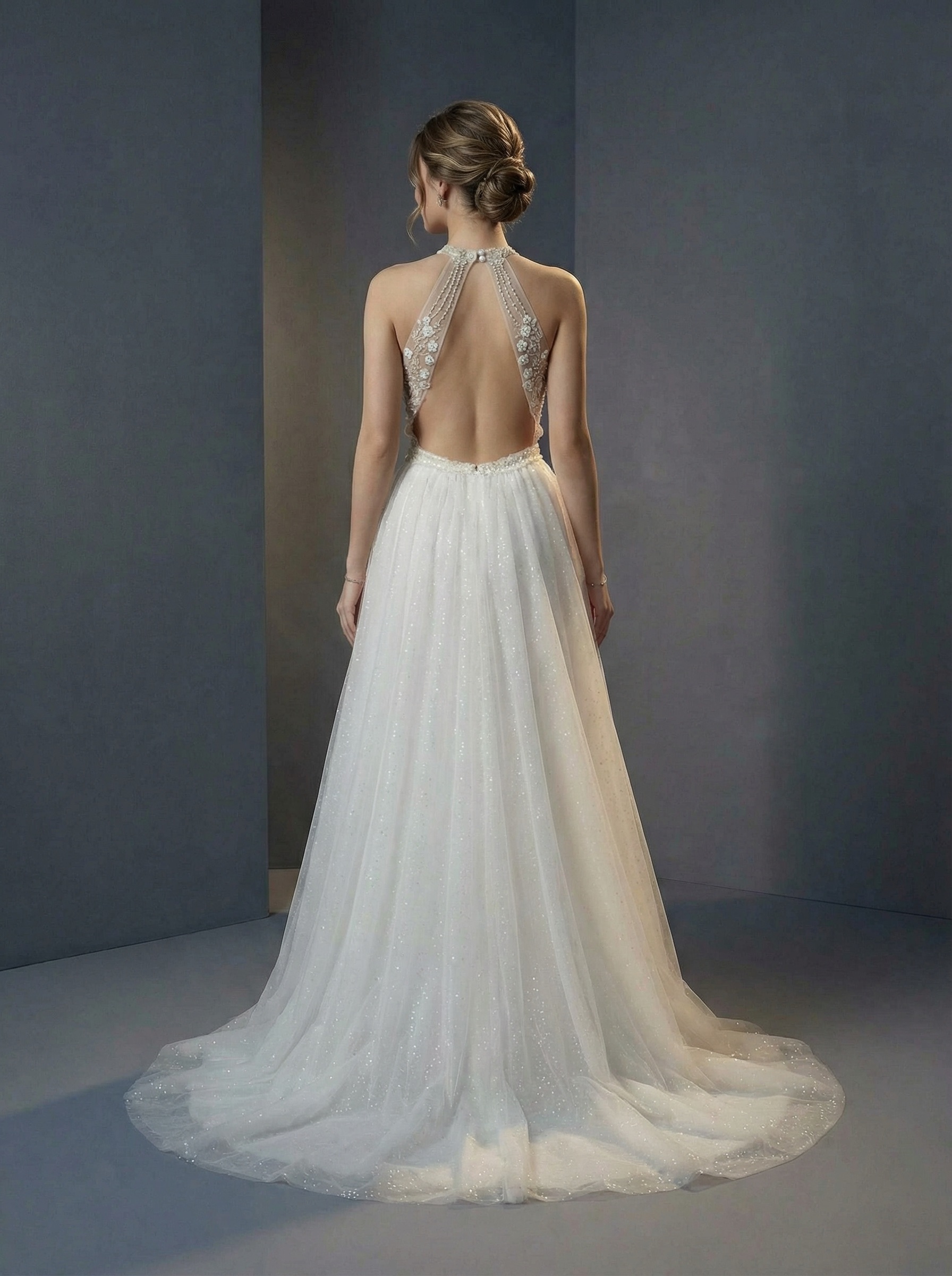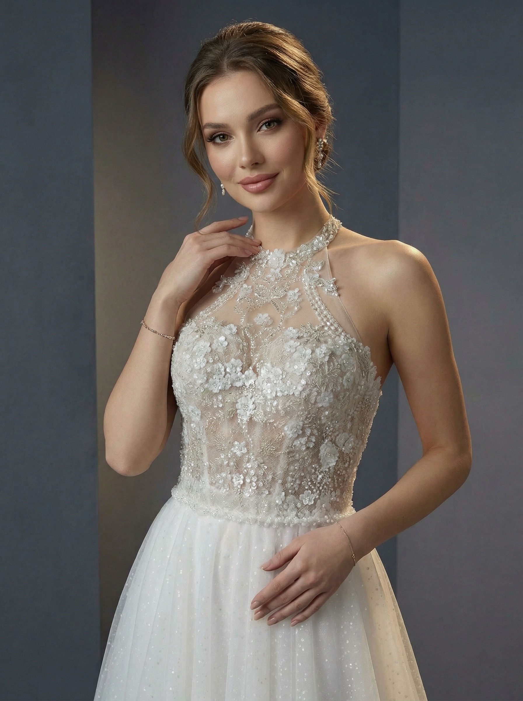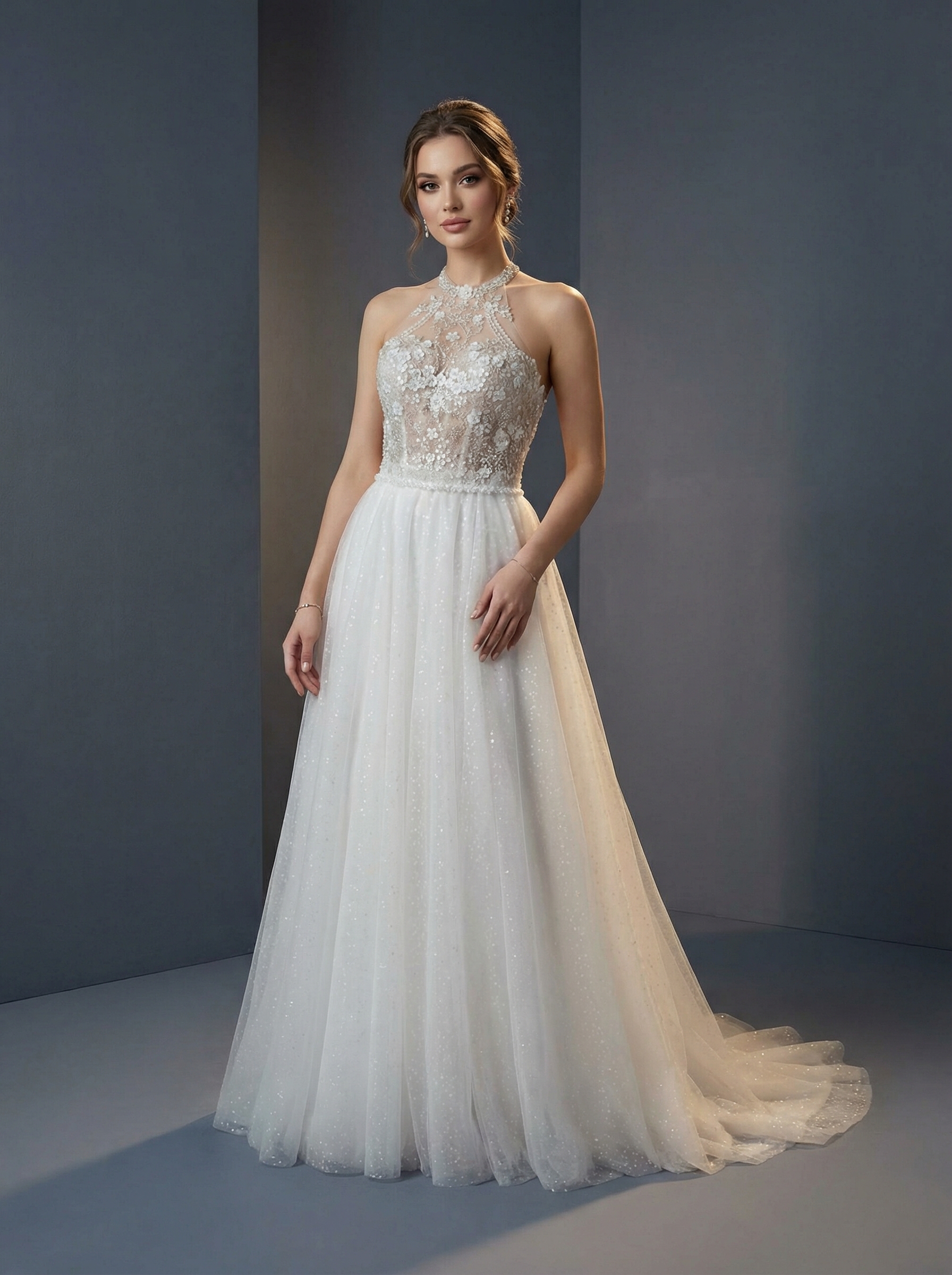 Платье дополнено изысканной американской проймой, которая переходит в высокий воротник-стойку. Лиф выполнен из полупрозрачного материала и обильно декорирован кружевными аппликациями, цветочной вышивкой и деликатным блеском. Легкая и многослойная, выполненная из мягкого фатина. Юбка плавно расширяется книзу, создавая воздушный образ, и завершается небольшим аккуратным шлейфом. По линии талии проходит тонкий пояс, акцентирующий фигуру. По всей длине юбки заметно нежное мерцание, которое придает платью торжественный вид. Этот фасон идеально подходит невестам, которые хотят подчеркнуть линию плеч и создать женственный, утонченный образ.