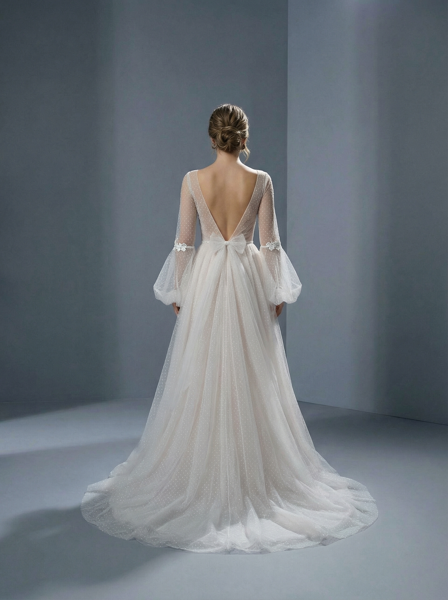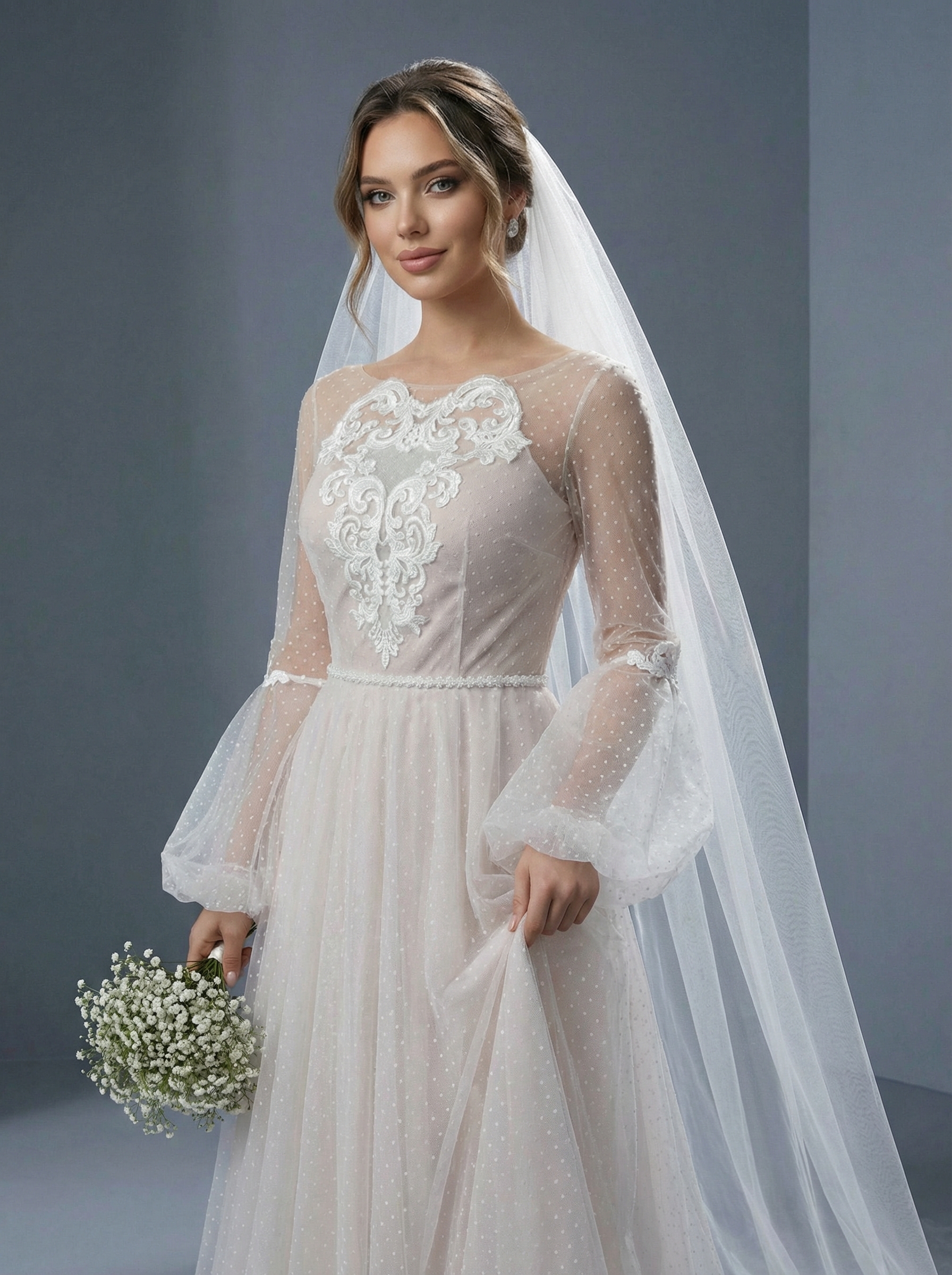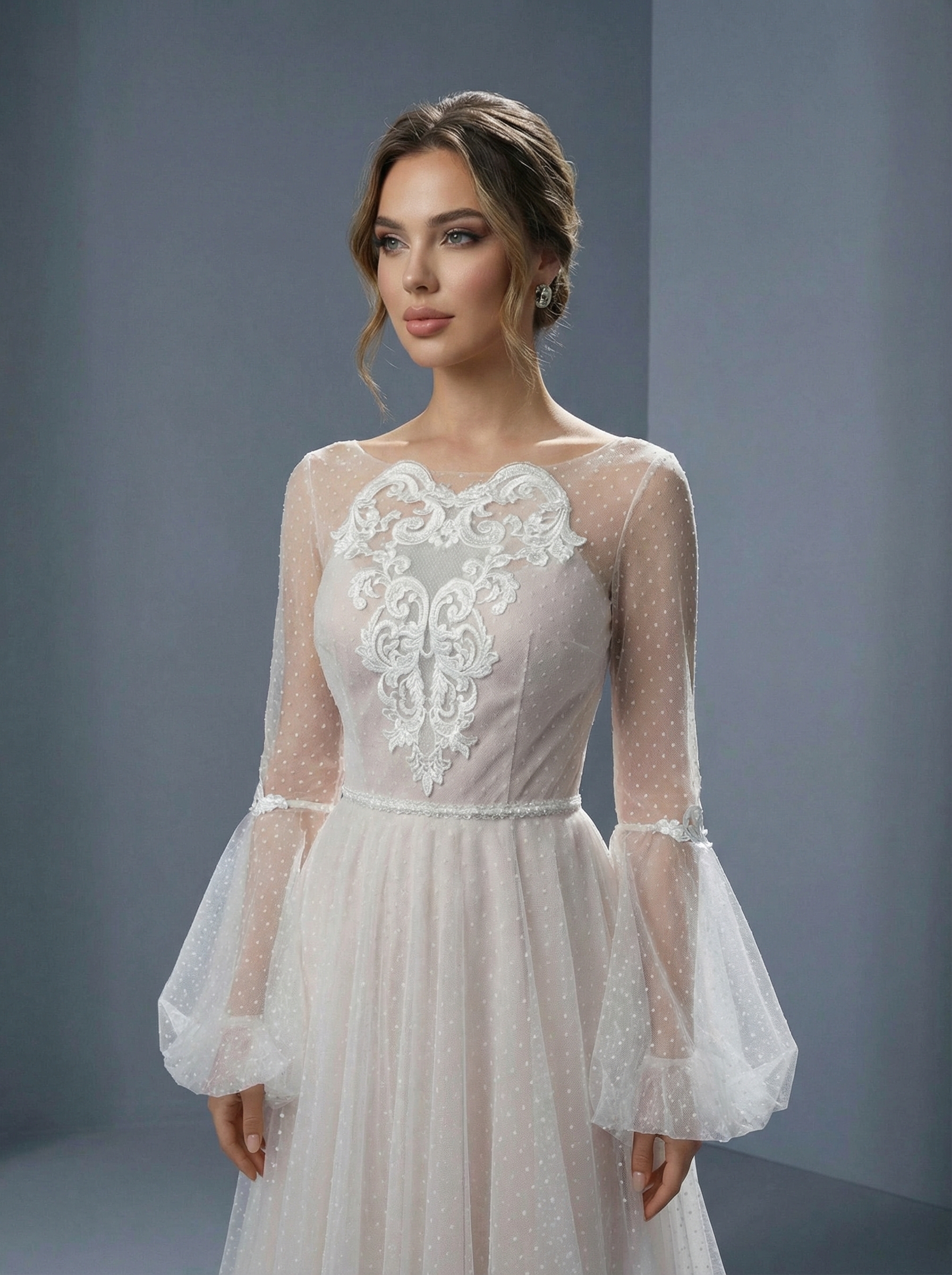 Закрытый лиф с длинными прозрачными рукавами и нежной кружевной аппликацией на груди в форме сердца. Объемные рукава в стиле «епископ» с манжетами на запястьях придают образу романтичности. Акцентирована тонким декоративным пояском, подчеркивающим фигуру. Свободно ниспадающая многослойная юбка со шлейфом создает эффект легкости и изящества. Такой фасон идеально подходит для классической или винтажной свадебной церемонии.