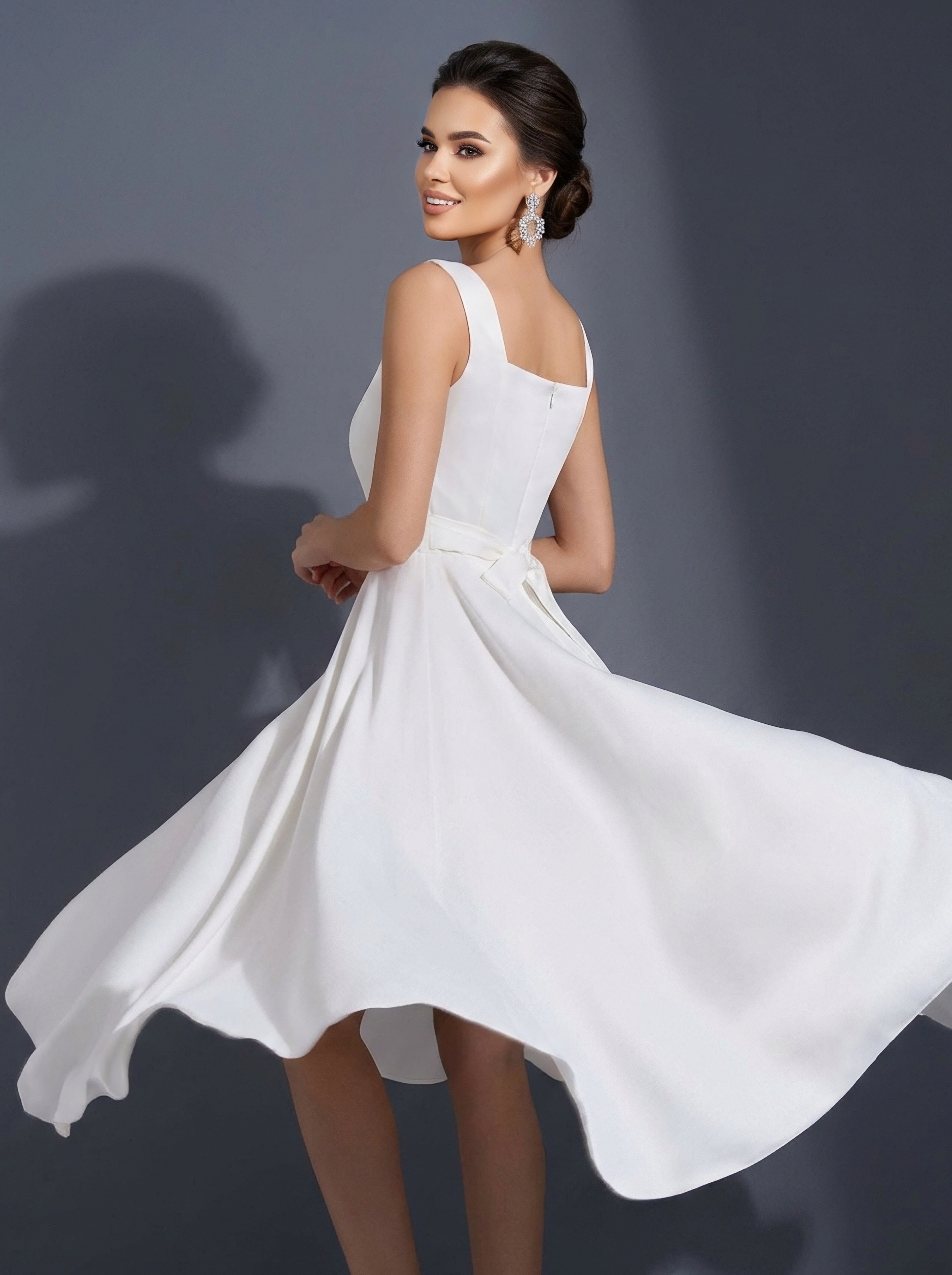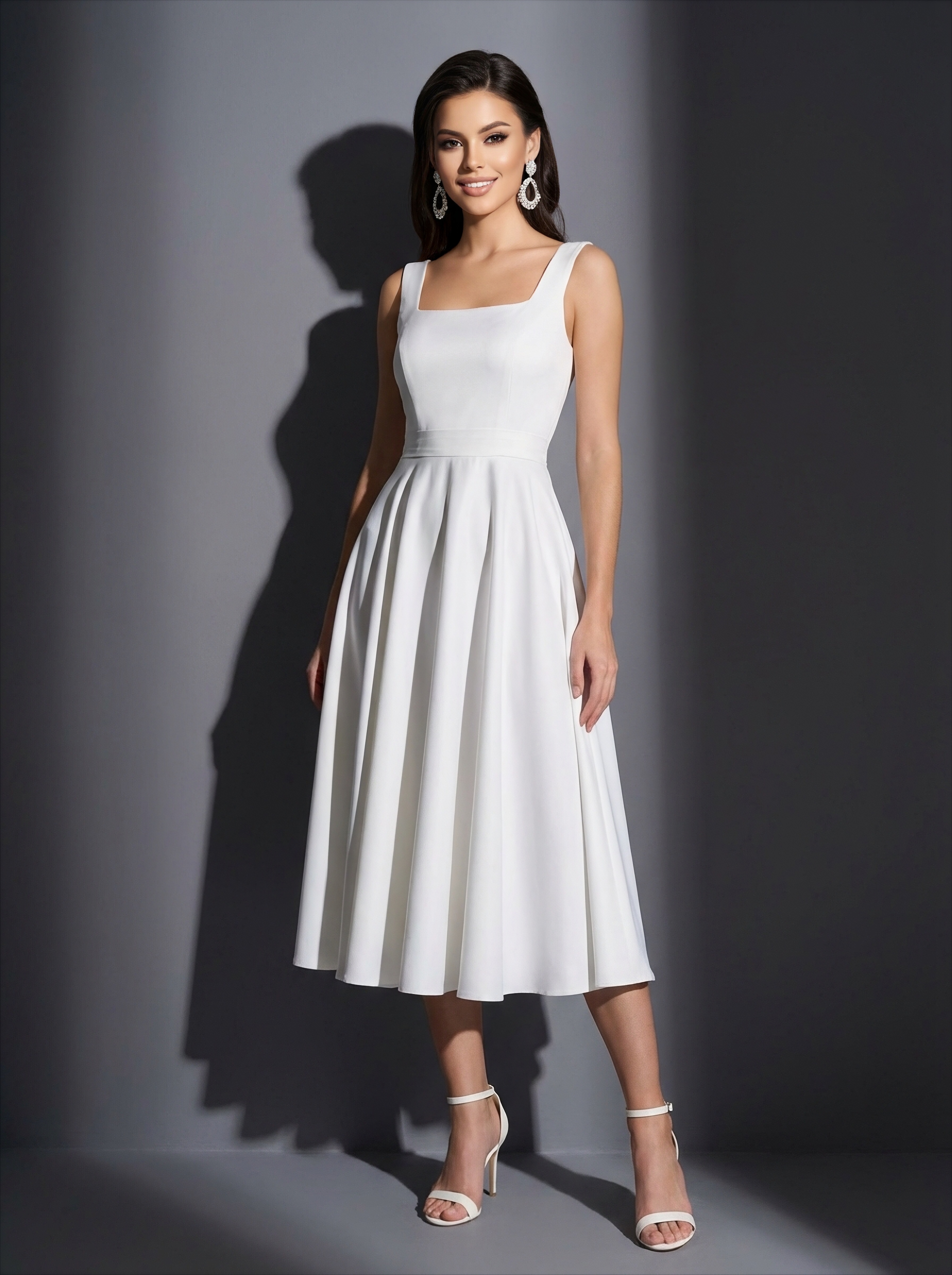 Белое свадебное платье длины миди в стиле А-силуэт с квадратным вырезом горловины, приталенным лифом и пышной юбкой, которая держит форму