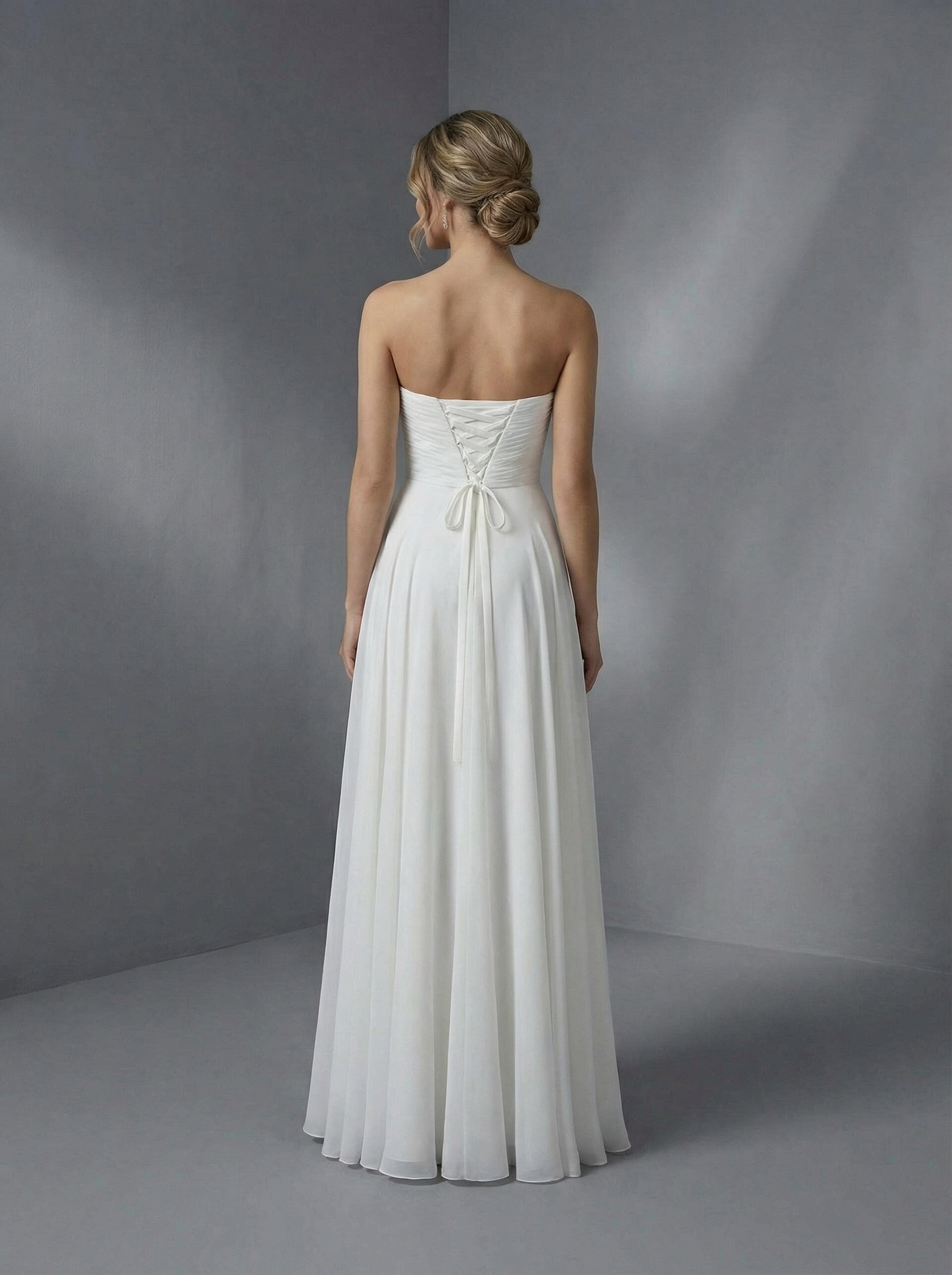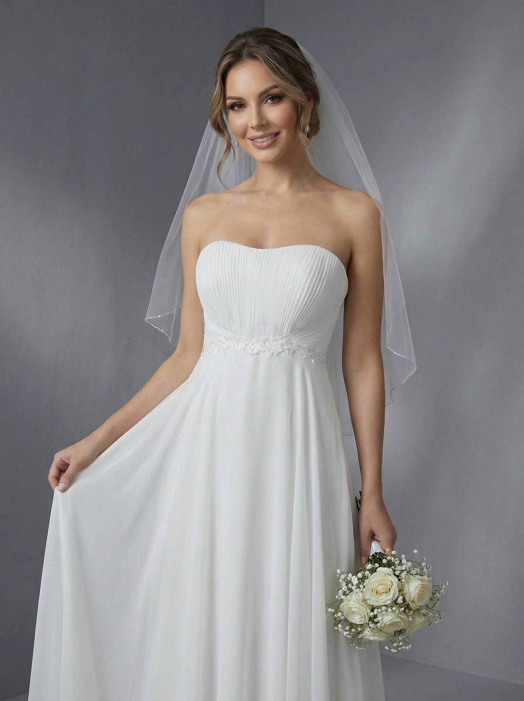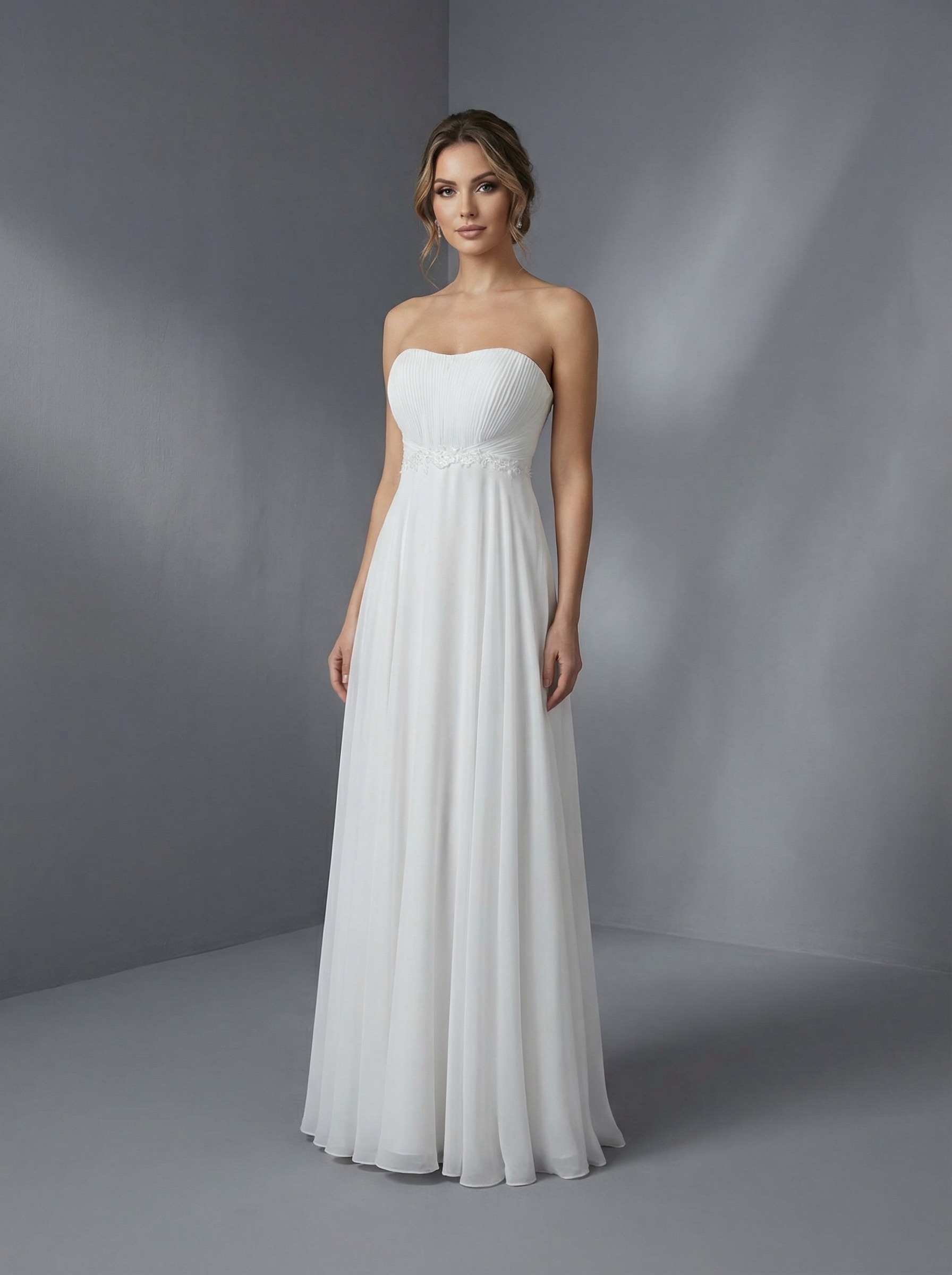 Прямой, с завышенной линией талии, что визуально вытягивает фигуру. Лиф-бандо без бретелей с аккуратной драпировкой «плиссе» на груди. Талия подчеркнута нежным кружевным поясом или вышивкой, переходящей в струящуюся юбку. Платье сшито из легкого, воздушного шифона, который образует мягкие вертикальные складки.